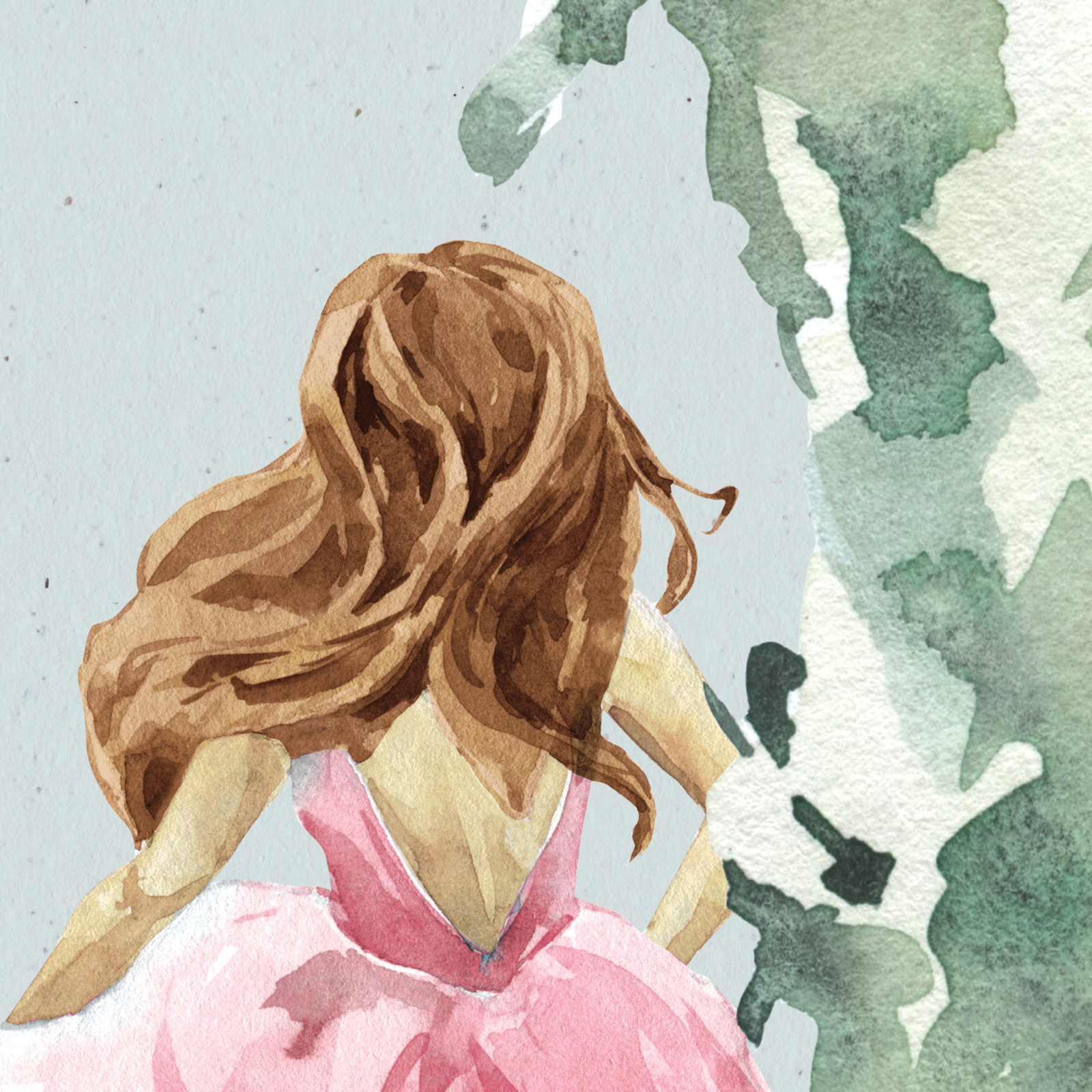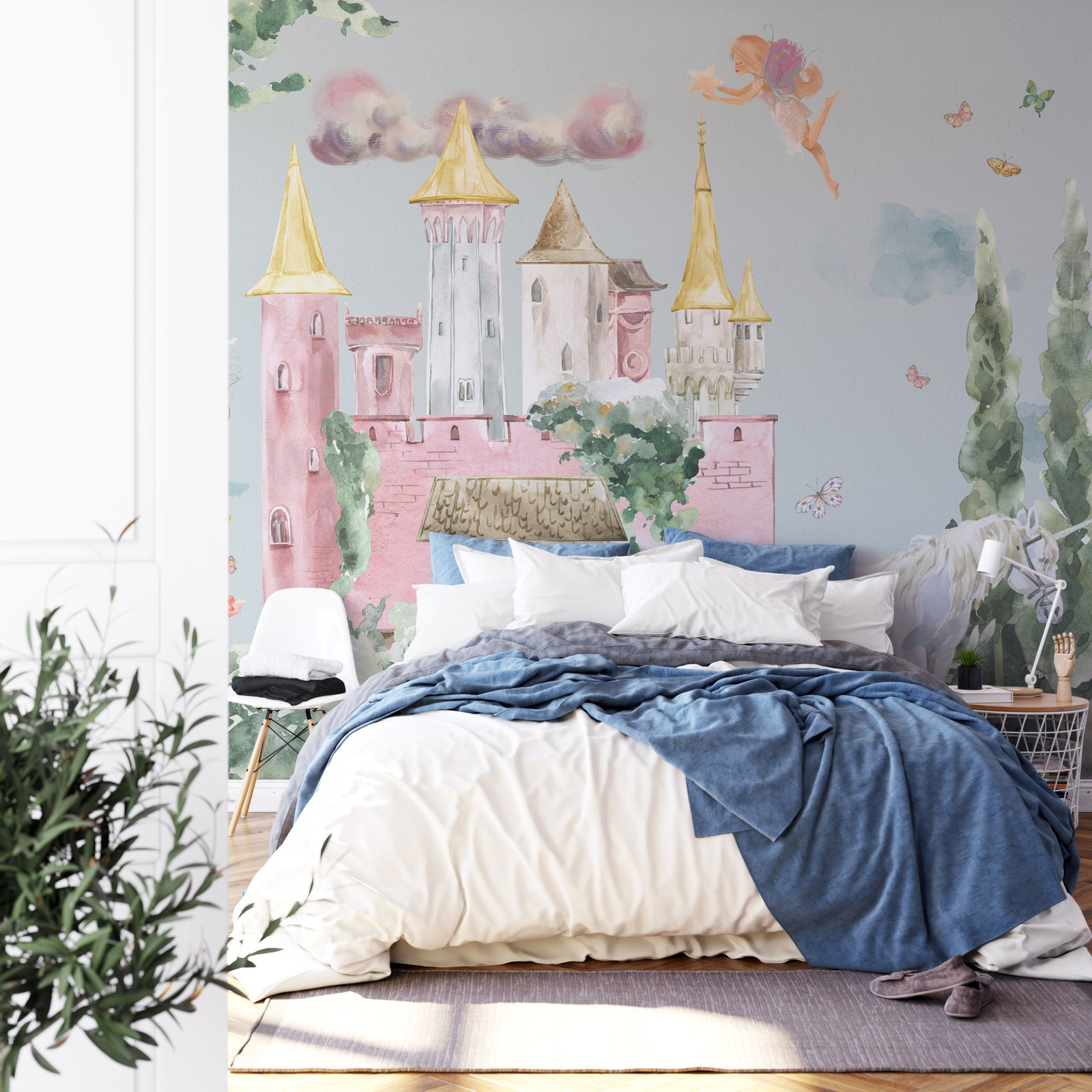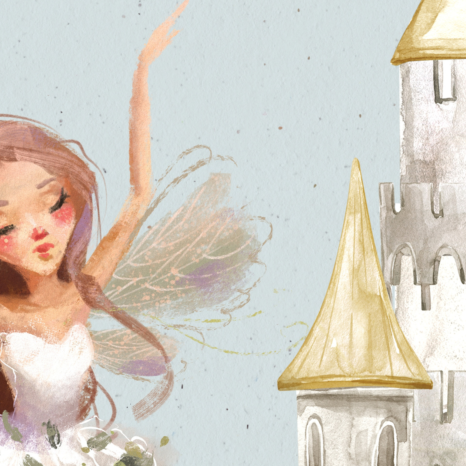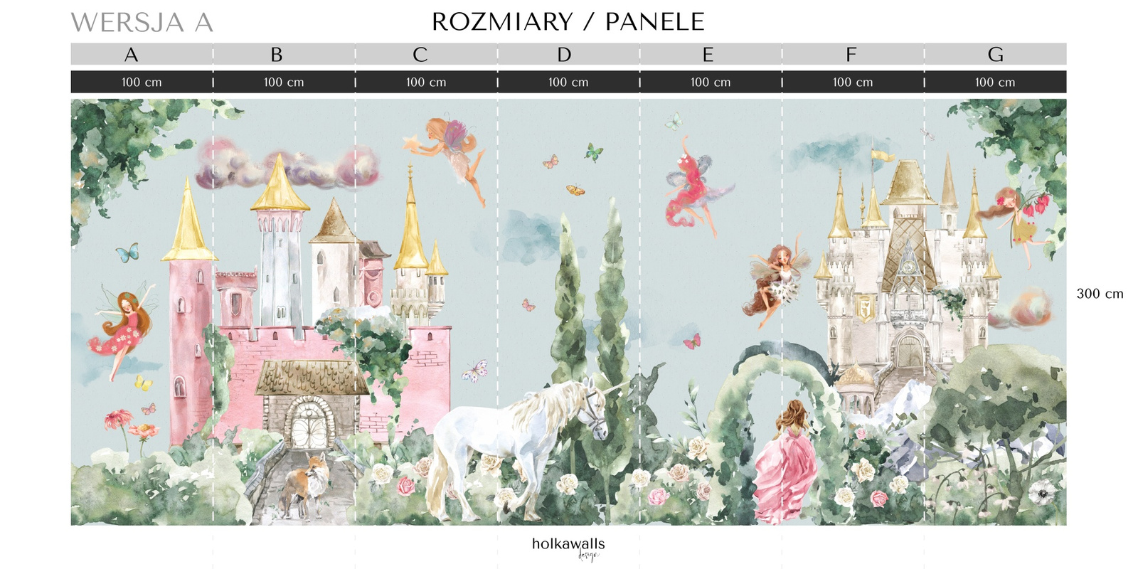 Tapeta winylowa o strukturze płótna dziecięca z księżniczkami, wróżkami i jednorożcem.
