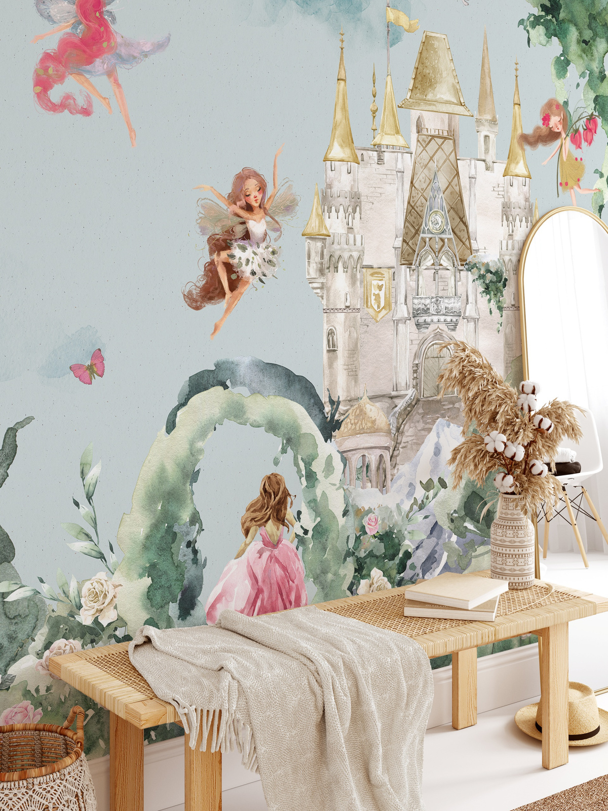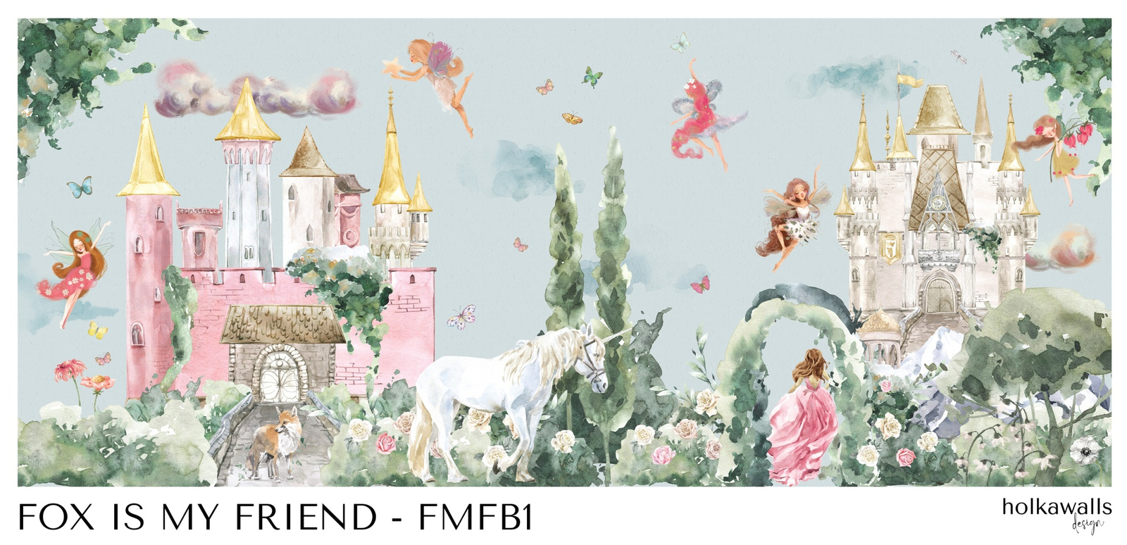 - Tapeta o strukturze płótna dziecięca z księżniczkami, wróżkami i jednorożcem.