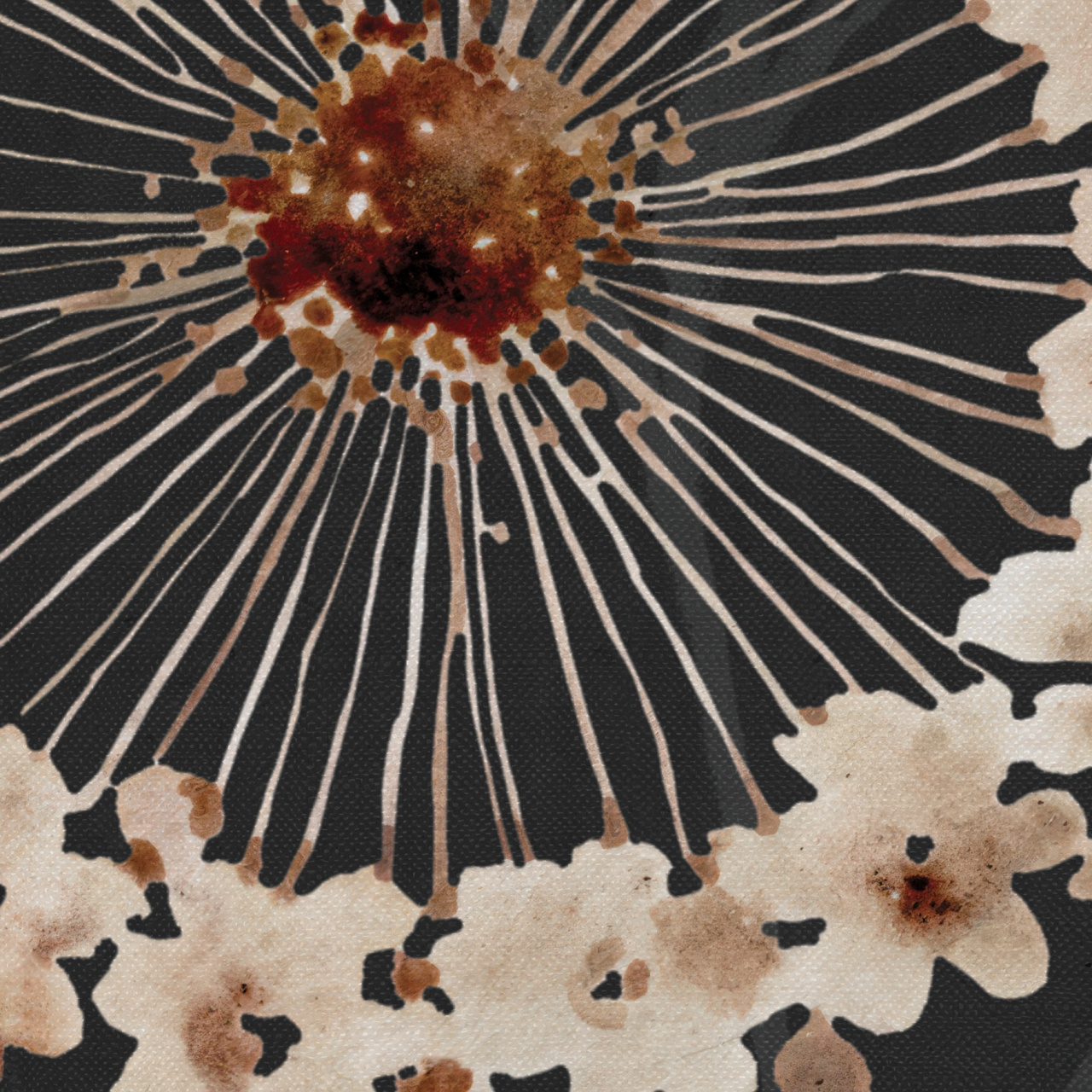 - Tapeta o strukturze płótna z kolorowym motywem kwiatowym na czarnym tle.