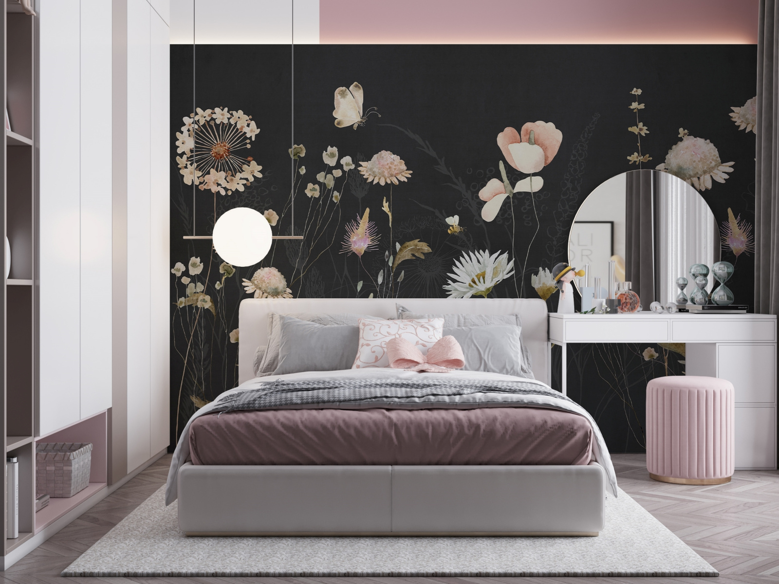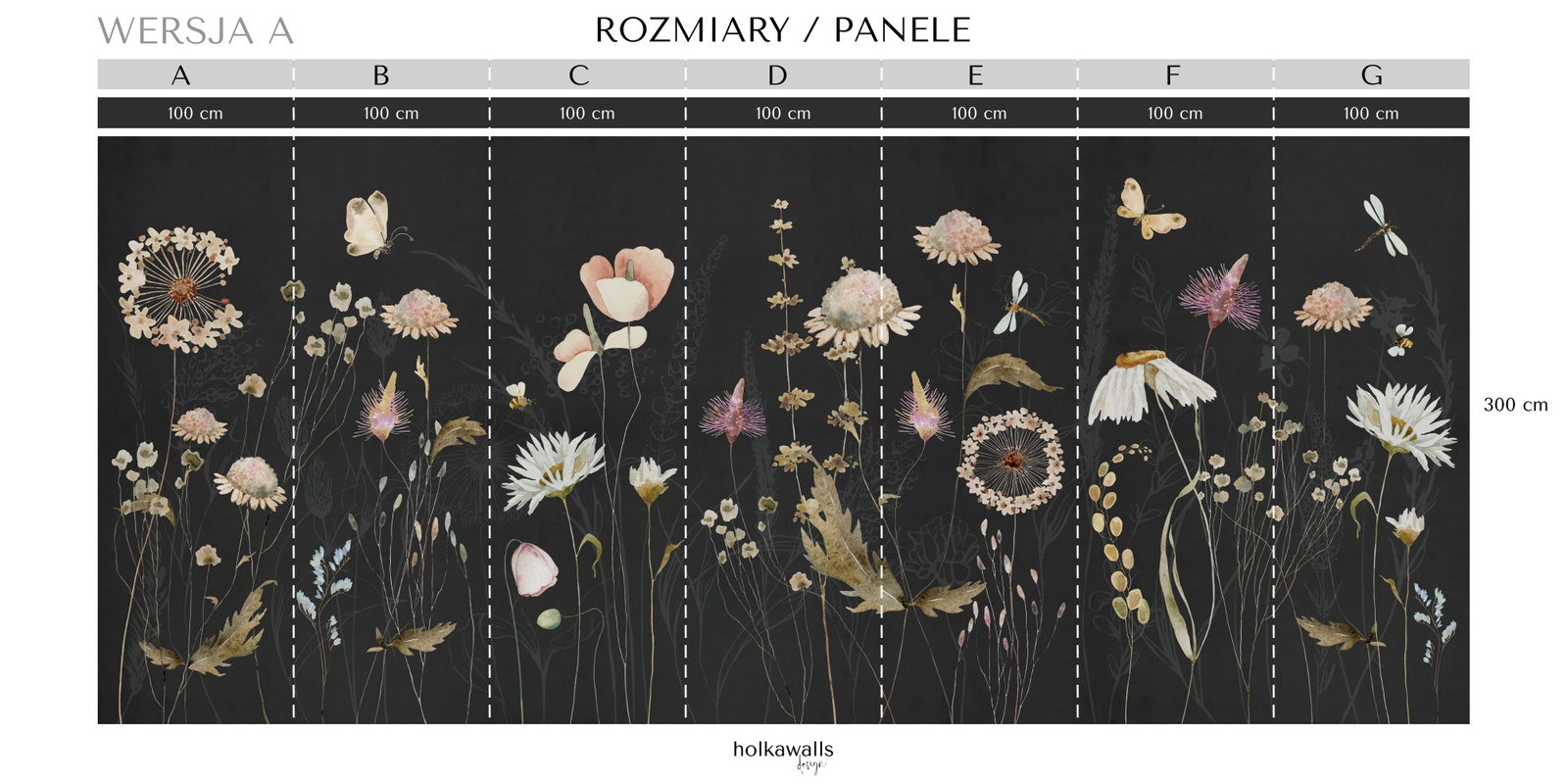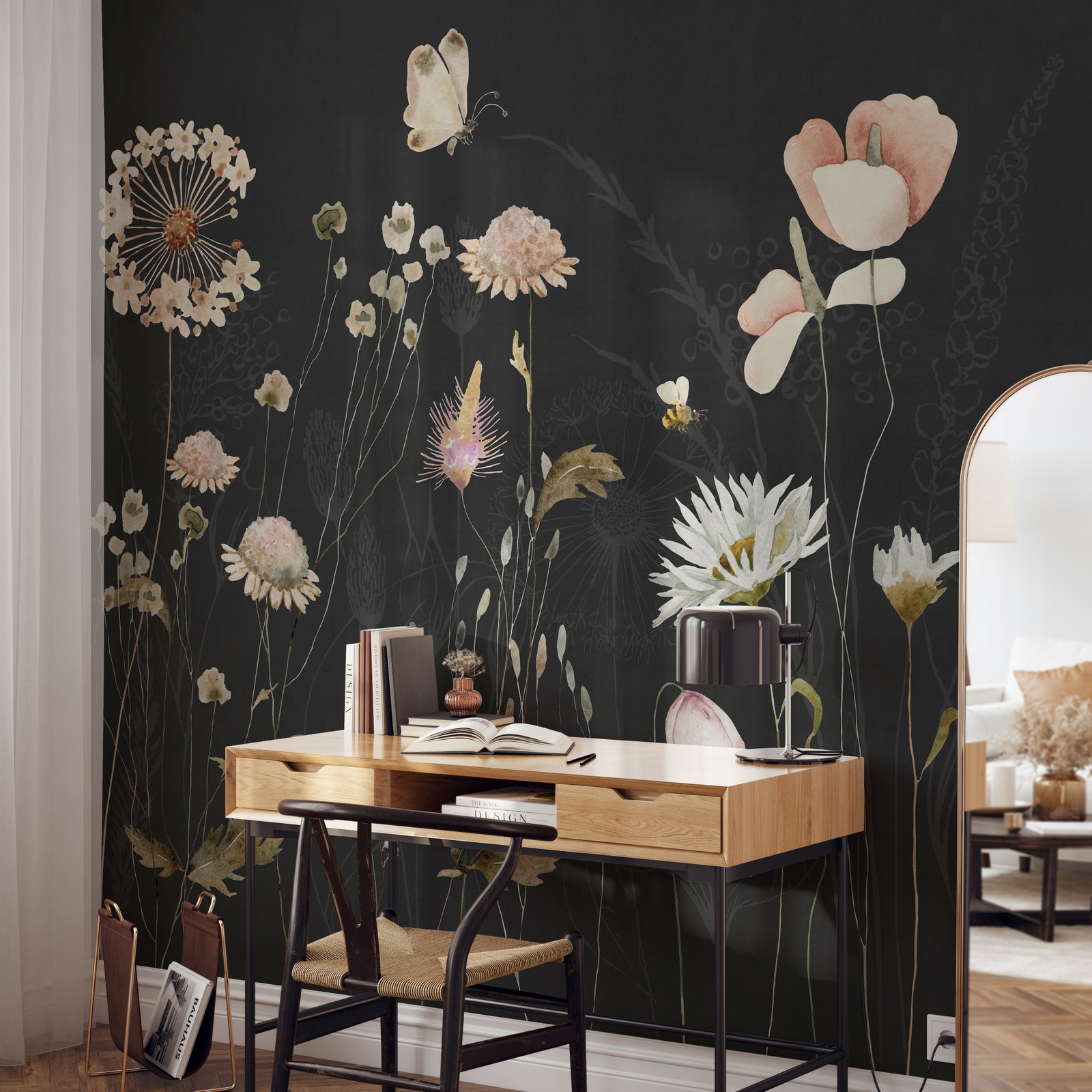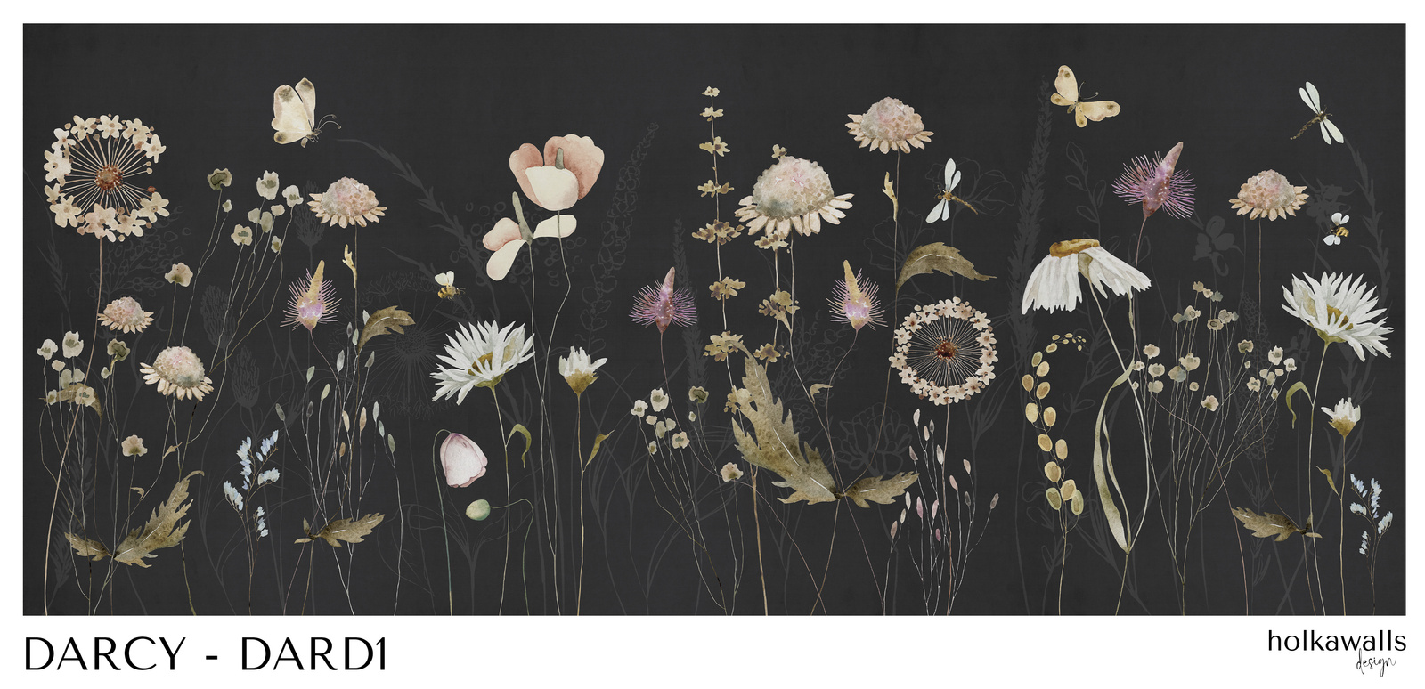 Tapeta winylowa struktura płótna kolorowa kwiatowa łąka czarne tło - DARCY dark (butterflies)