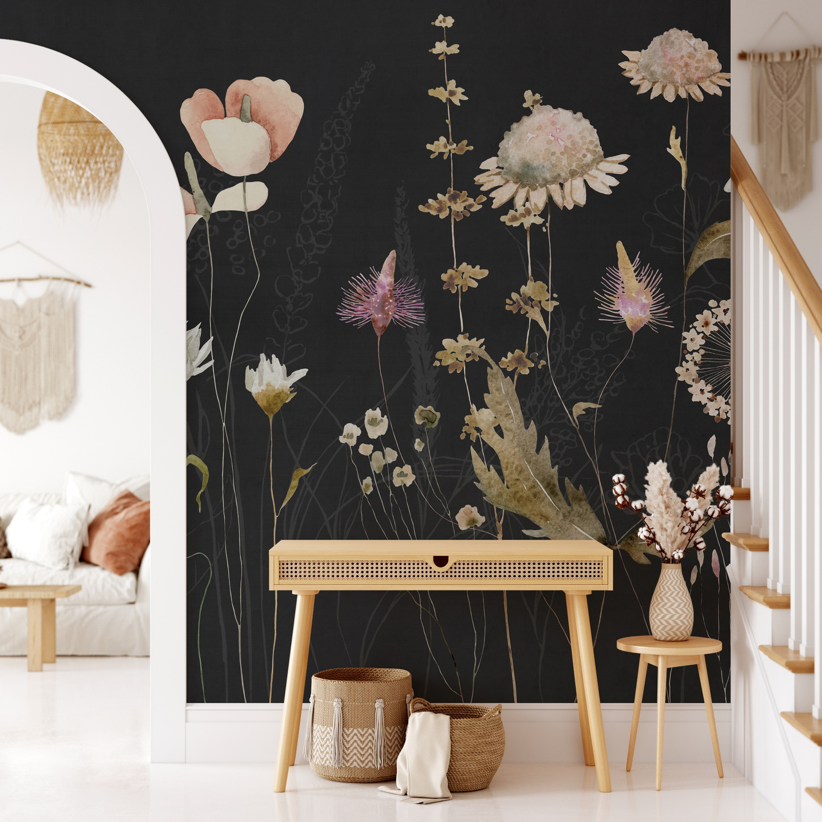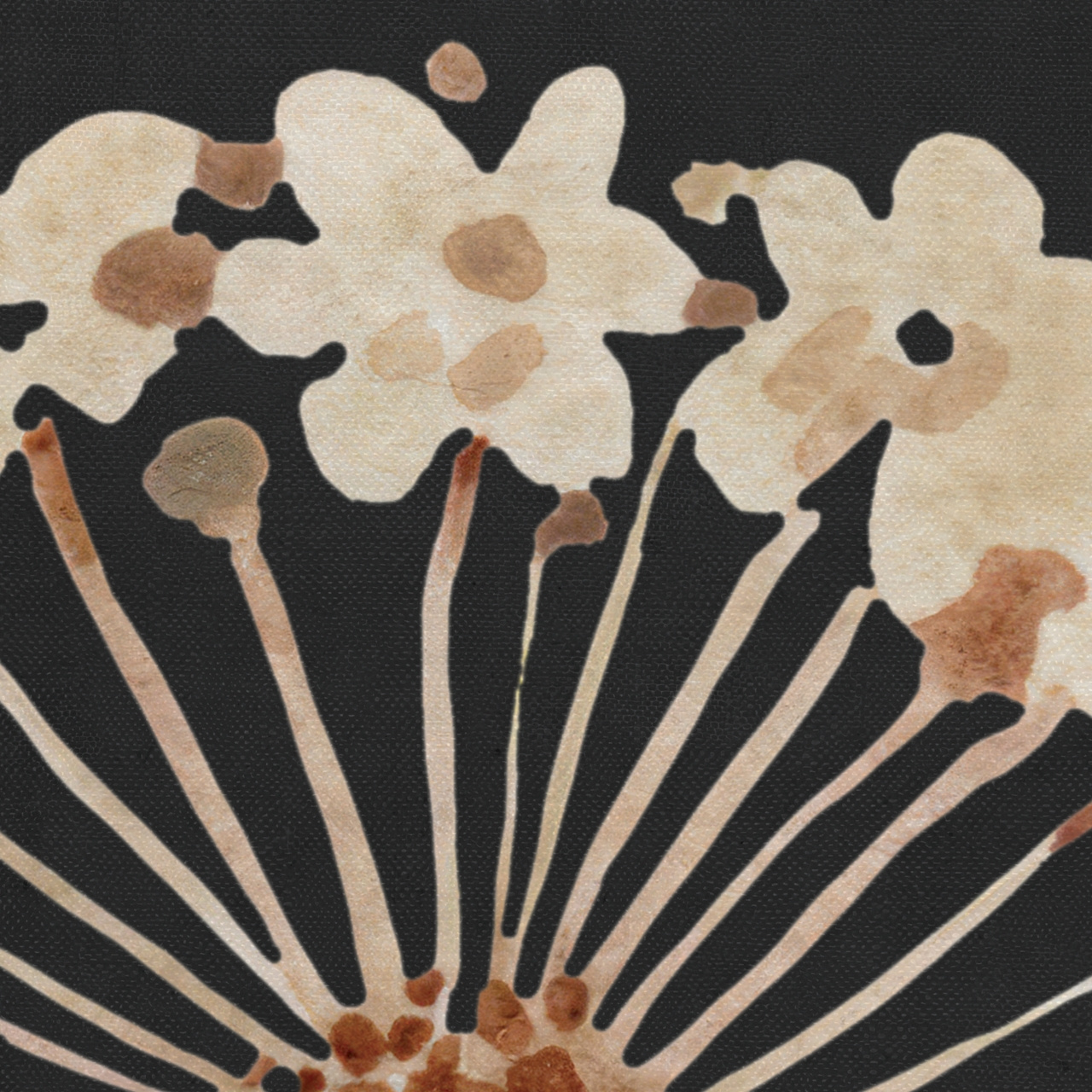 - Tapeta o strukturze płótna z kolorowym motywem kwiatowym na czarnym tle.