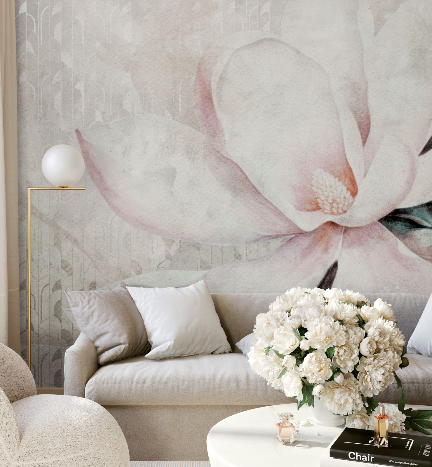 Tapeta z pastelowym wzorem kwiatowym i roślinnym. Piękna magnolia z dekoracyjnym motywerm w tle.