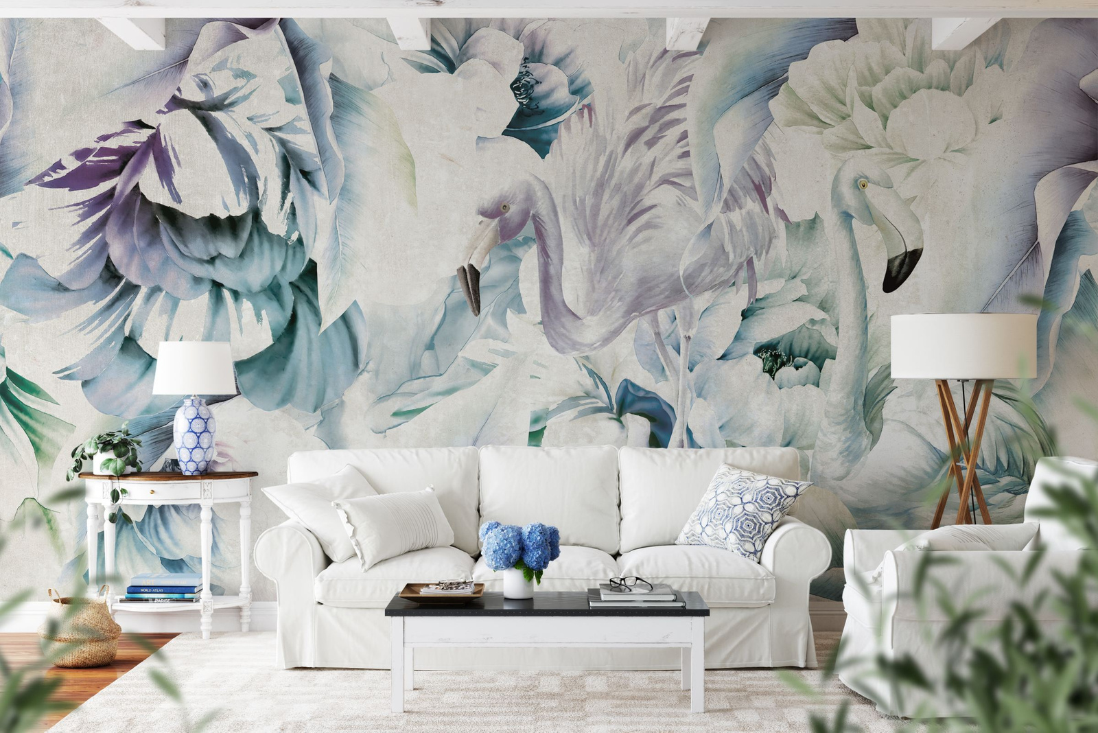 - Tapeta o strukturze płótna z flamingami i kwiatami niebiesko-fioletowa.