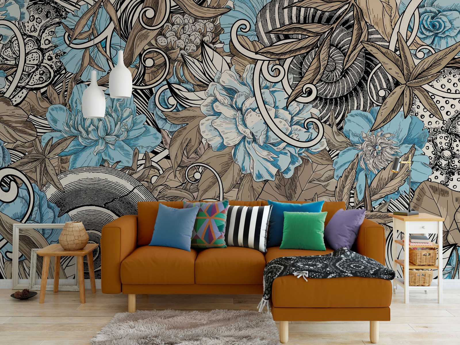 - Tapeta o strukturze płótna z motywem kwiatów i muszli z efektem graffiti.
