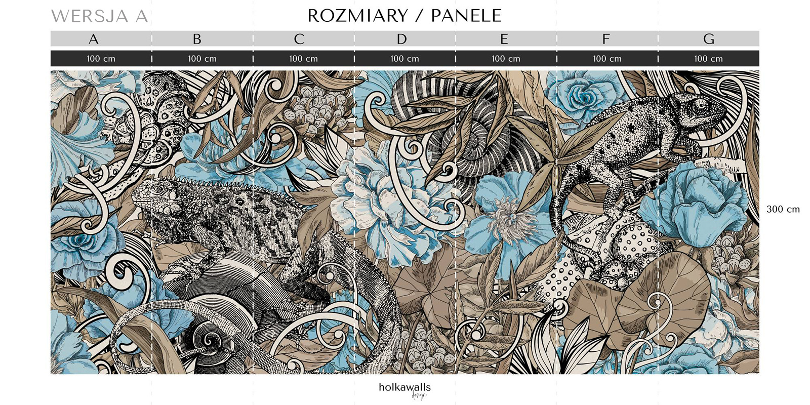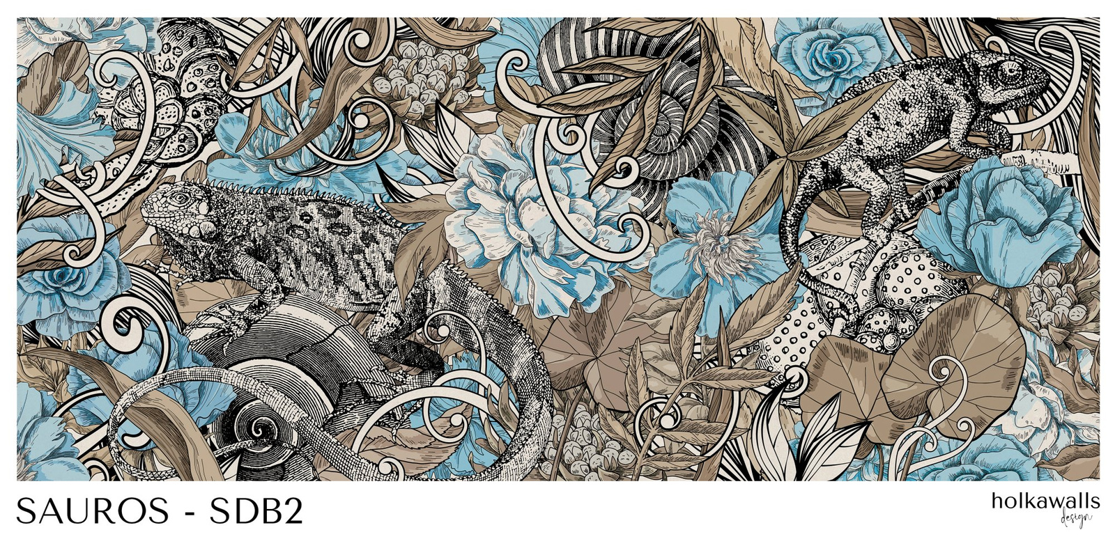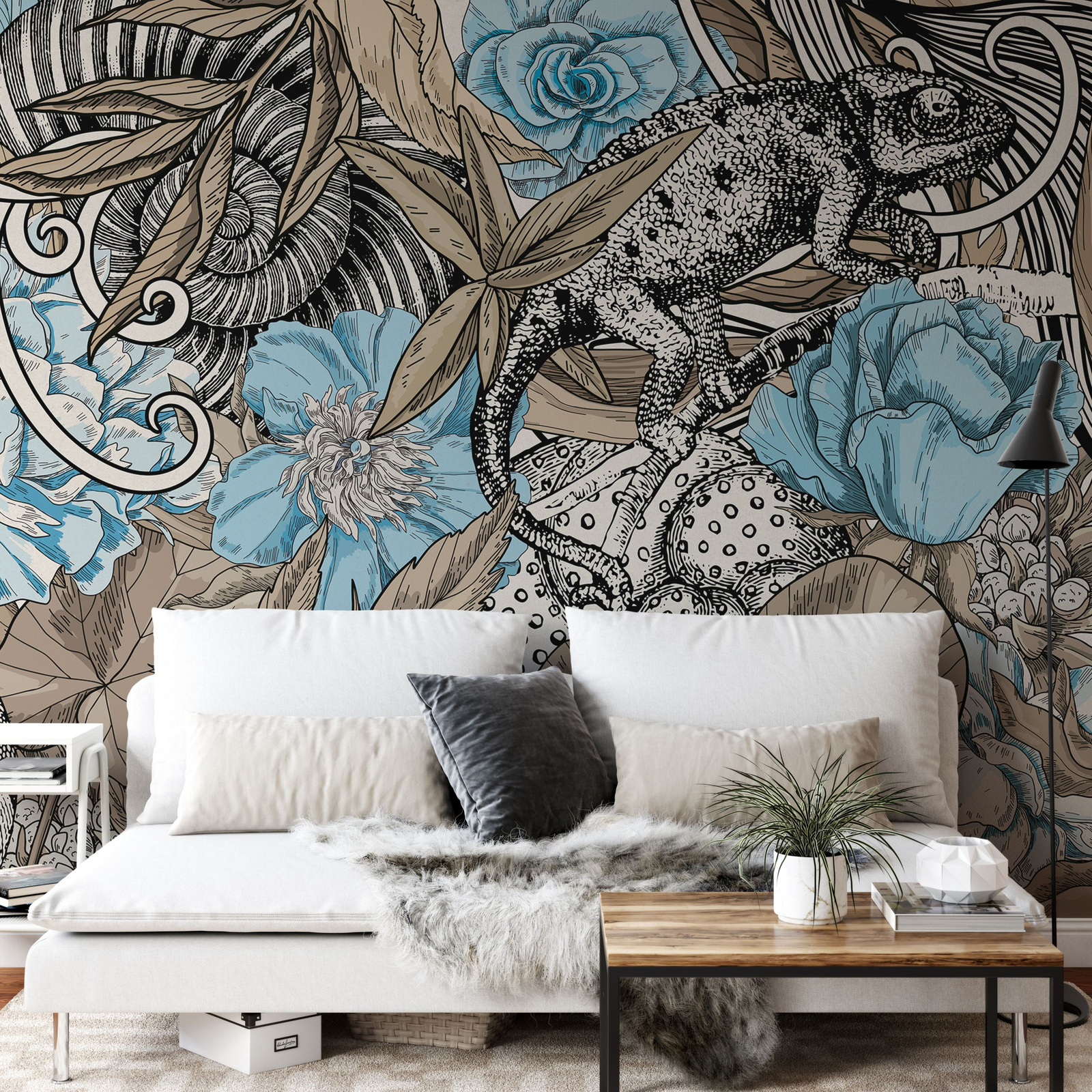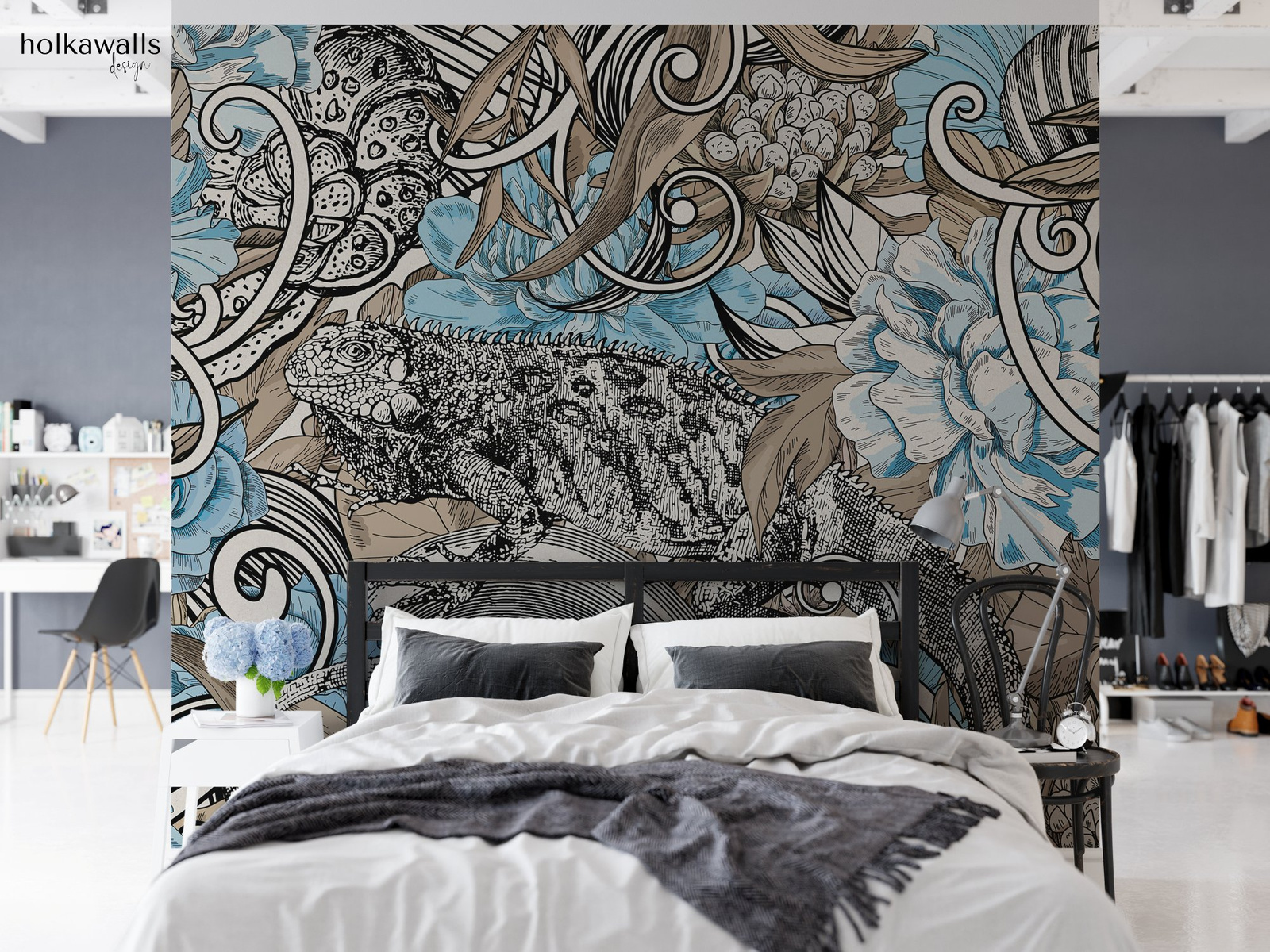 - Tapeta o strukturze płótna z motywem kwiatów i jaszczurek z efektem graffiti.