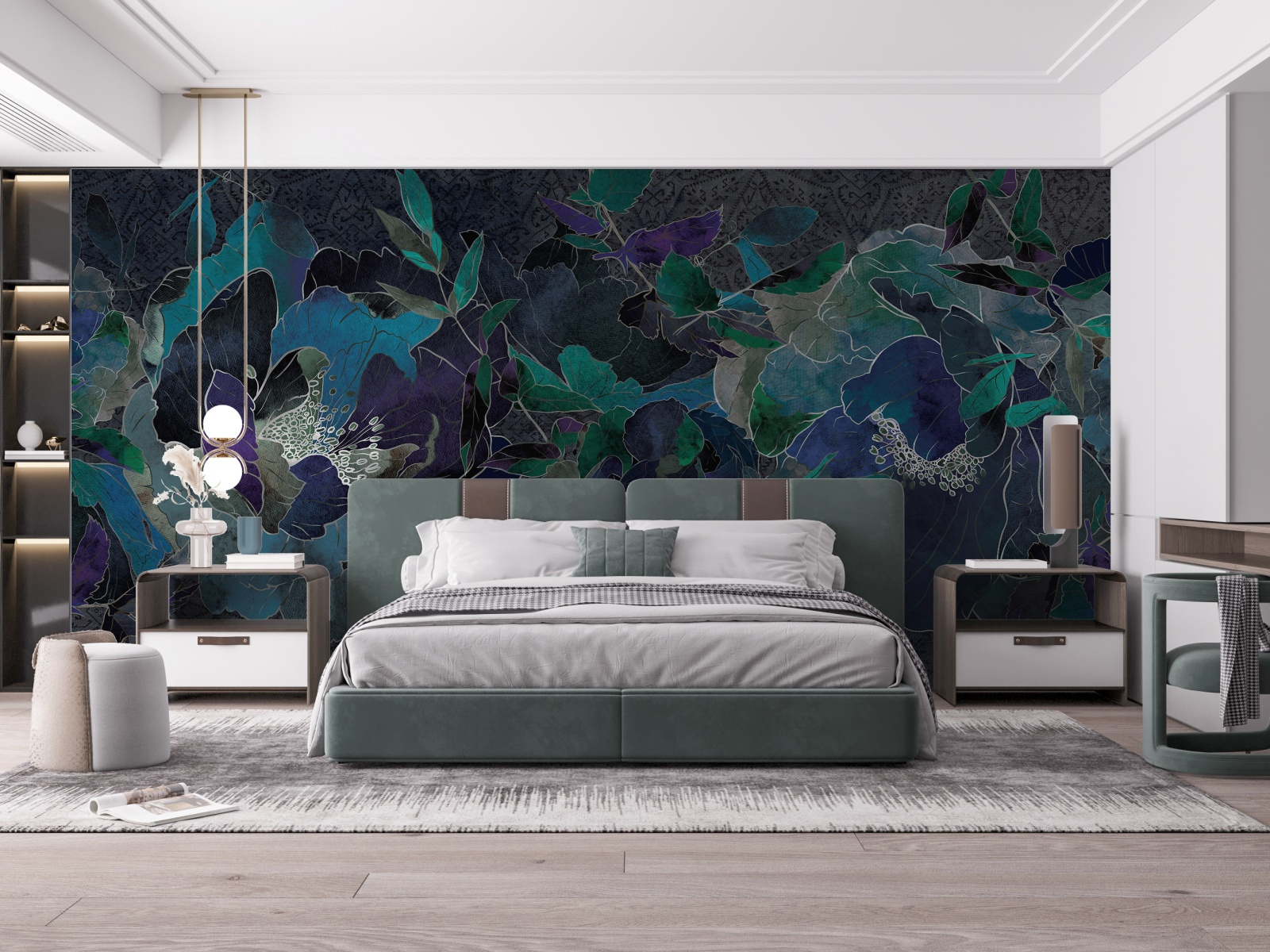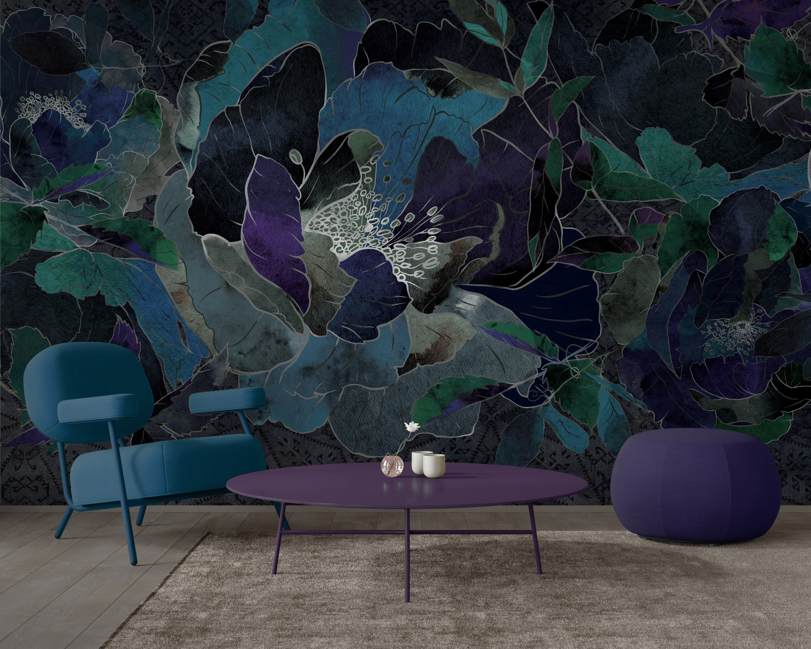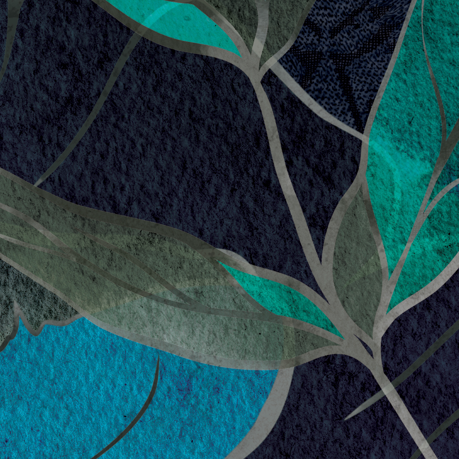 - Tapeta o strukturze płótna z motywem roślinnym i kwiatowym granatowo-turkusowa.