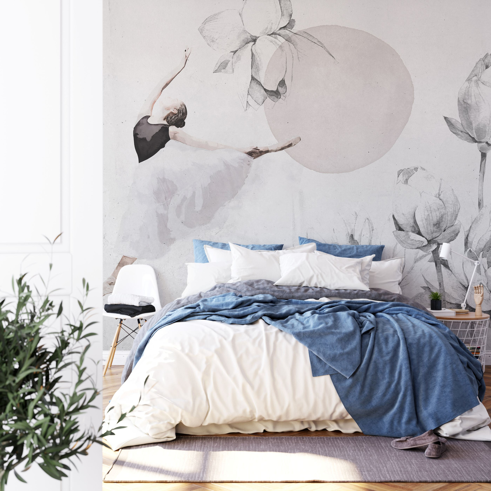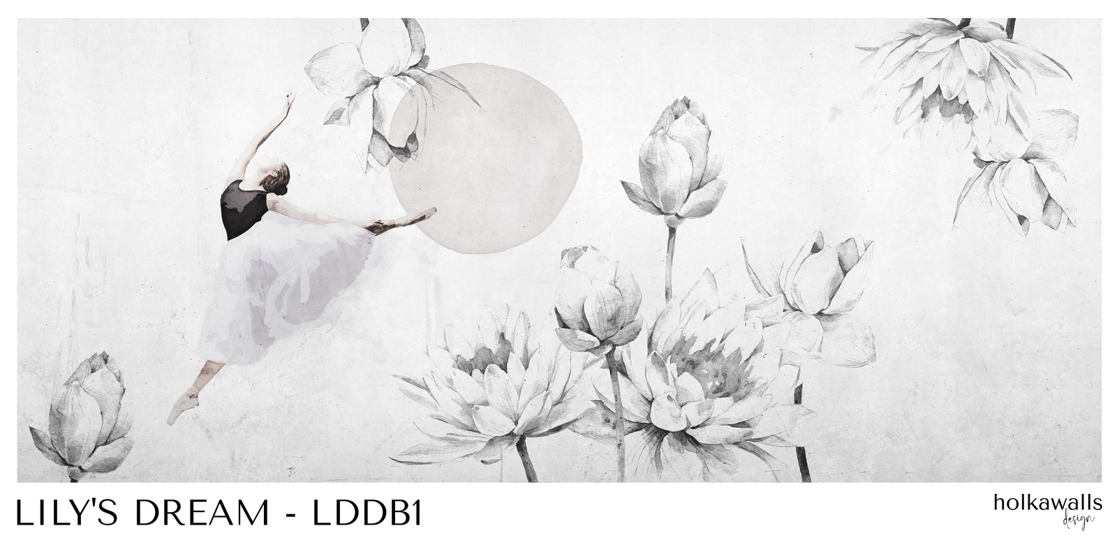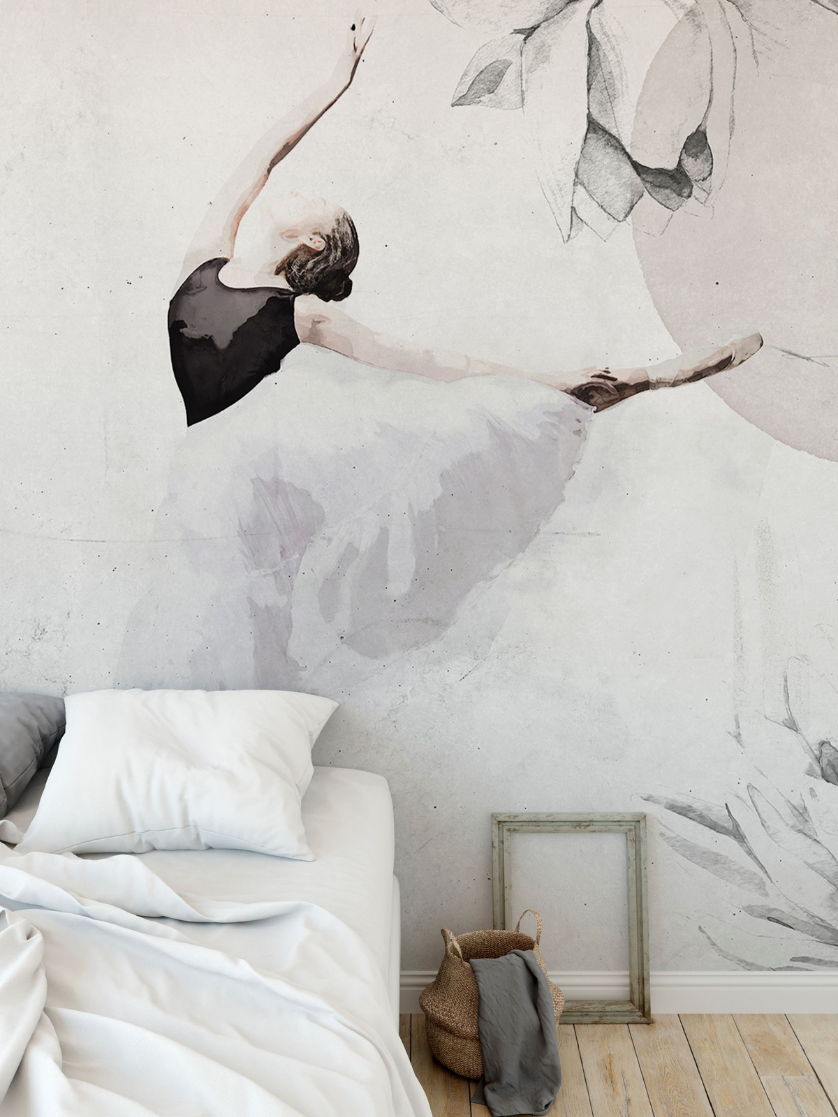 - Tapeta o strukturze płótna z baletnicą i kwiatami lilii z elementami różu.