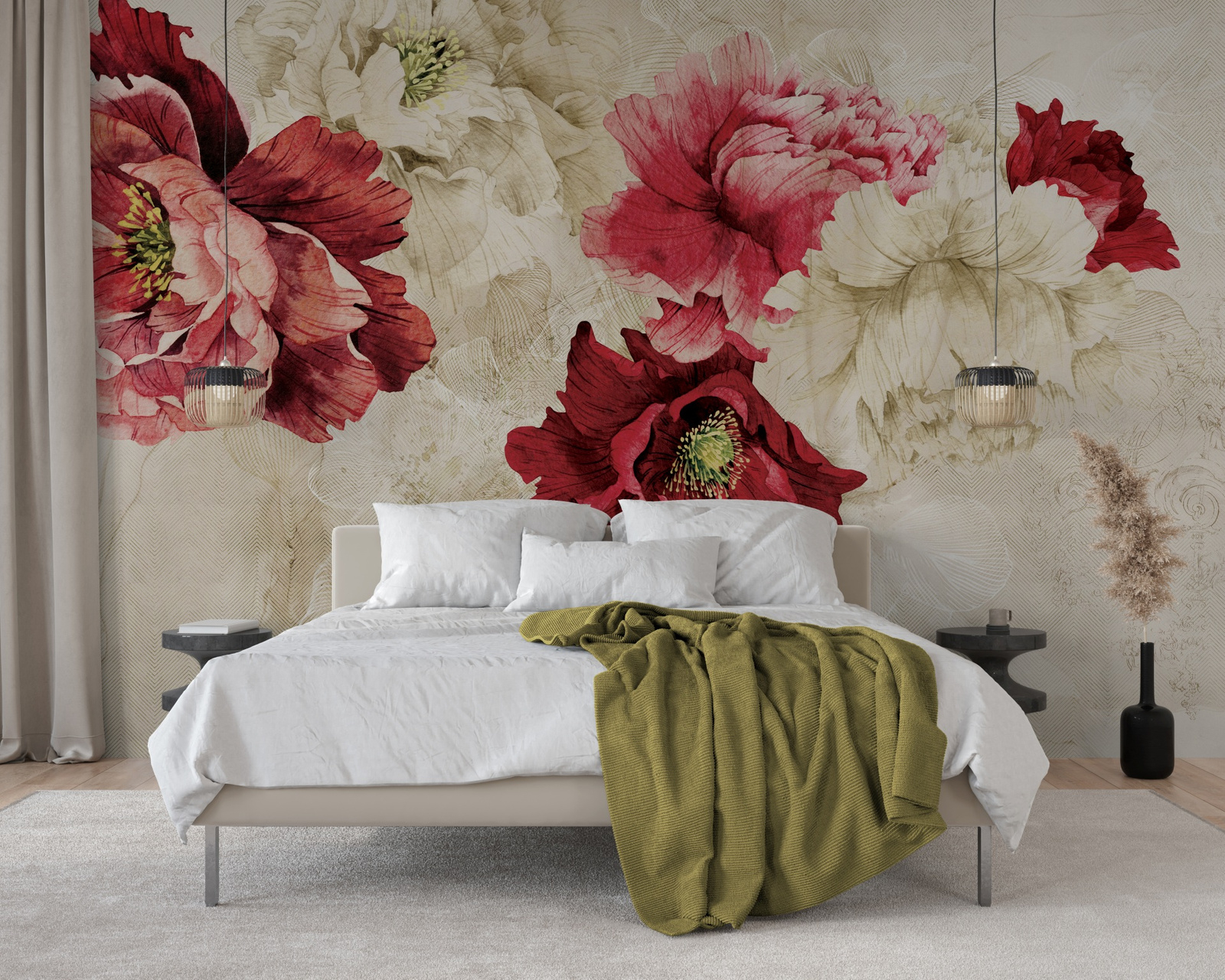 - Tapeta winylowa o strukturze płótna z motywem kwiatowym czerwono-beżowa.