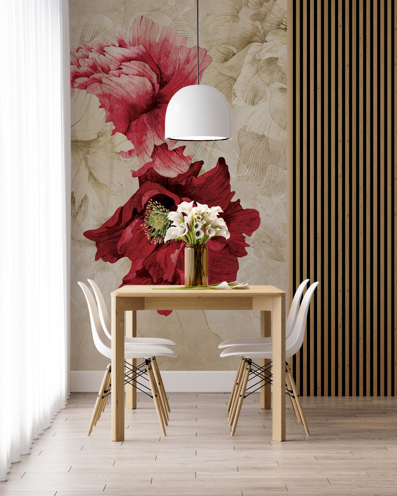 Tapeta winylowa o strukturze płótna z motywem kwiatowym czerwono-beżowa.