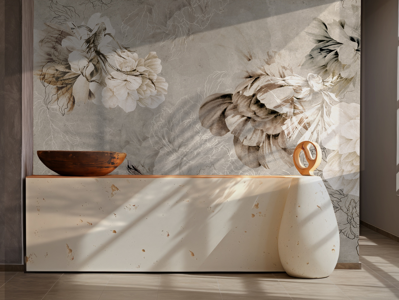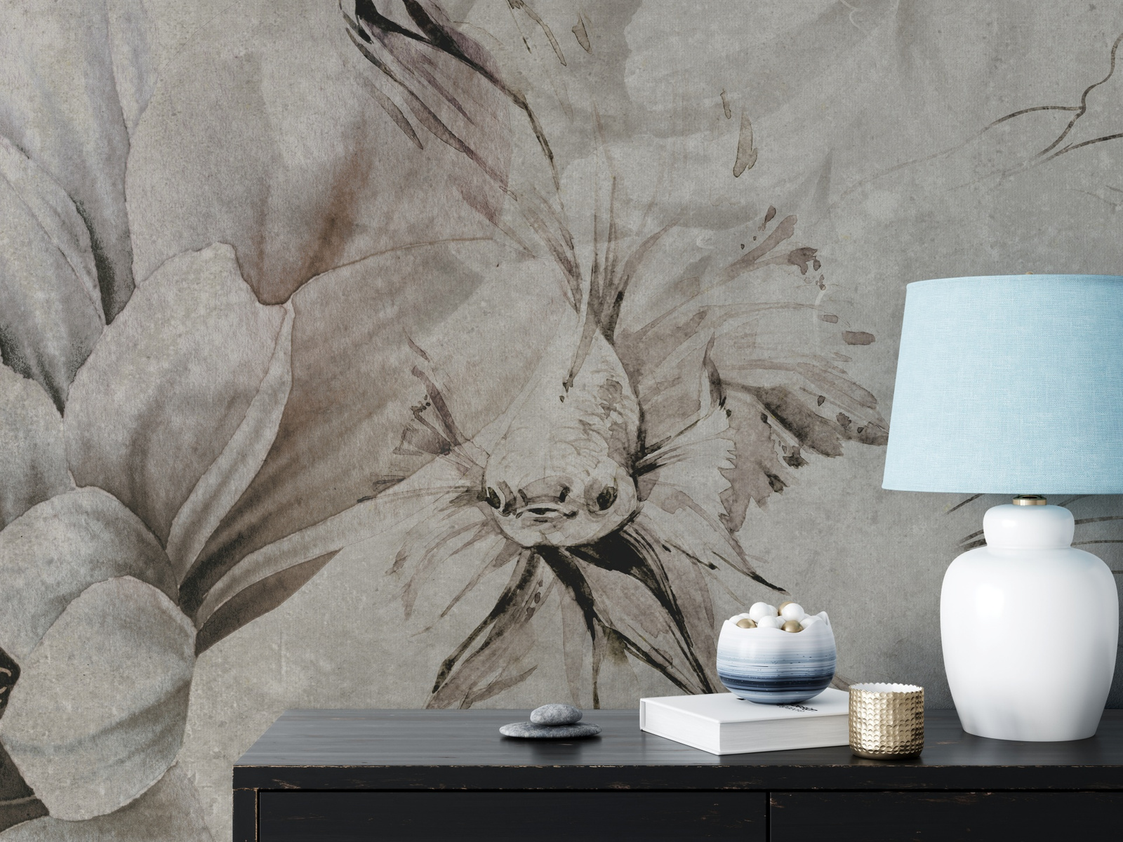 Tapeta winylowa o strukturze płótna z rybkami i motywem kwiatowym w odcieniach beżu.