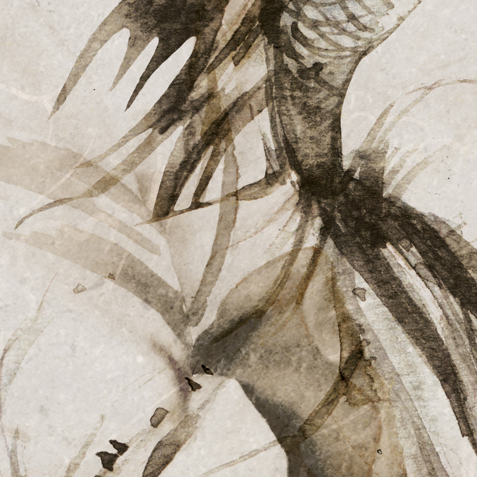 - Tapeta o strukturze płótna z rybkami i motywem kwiatowym w odcieniach beżu.