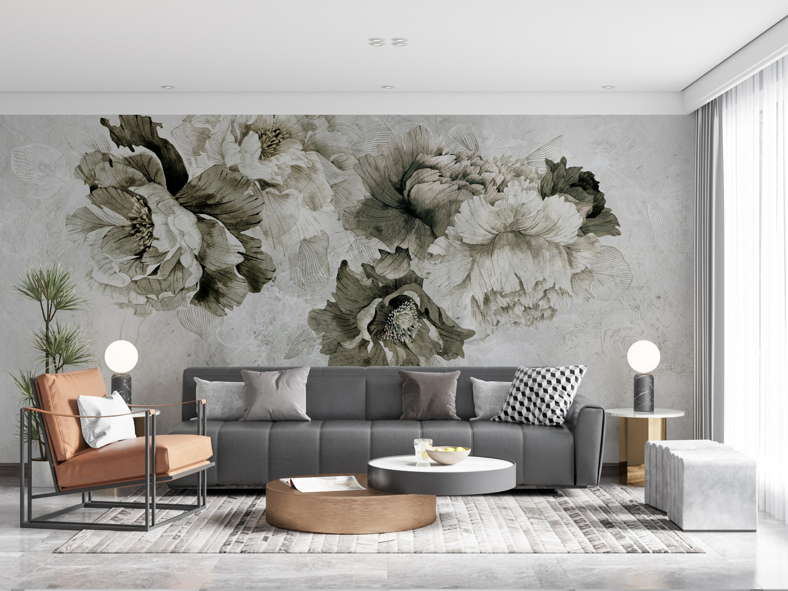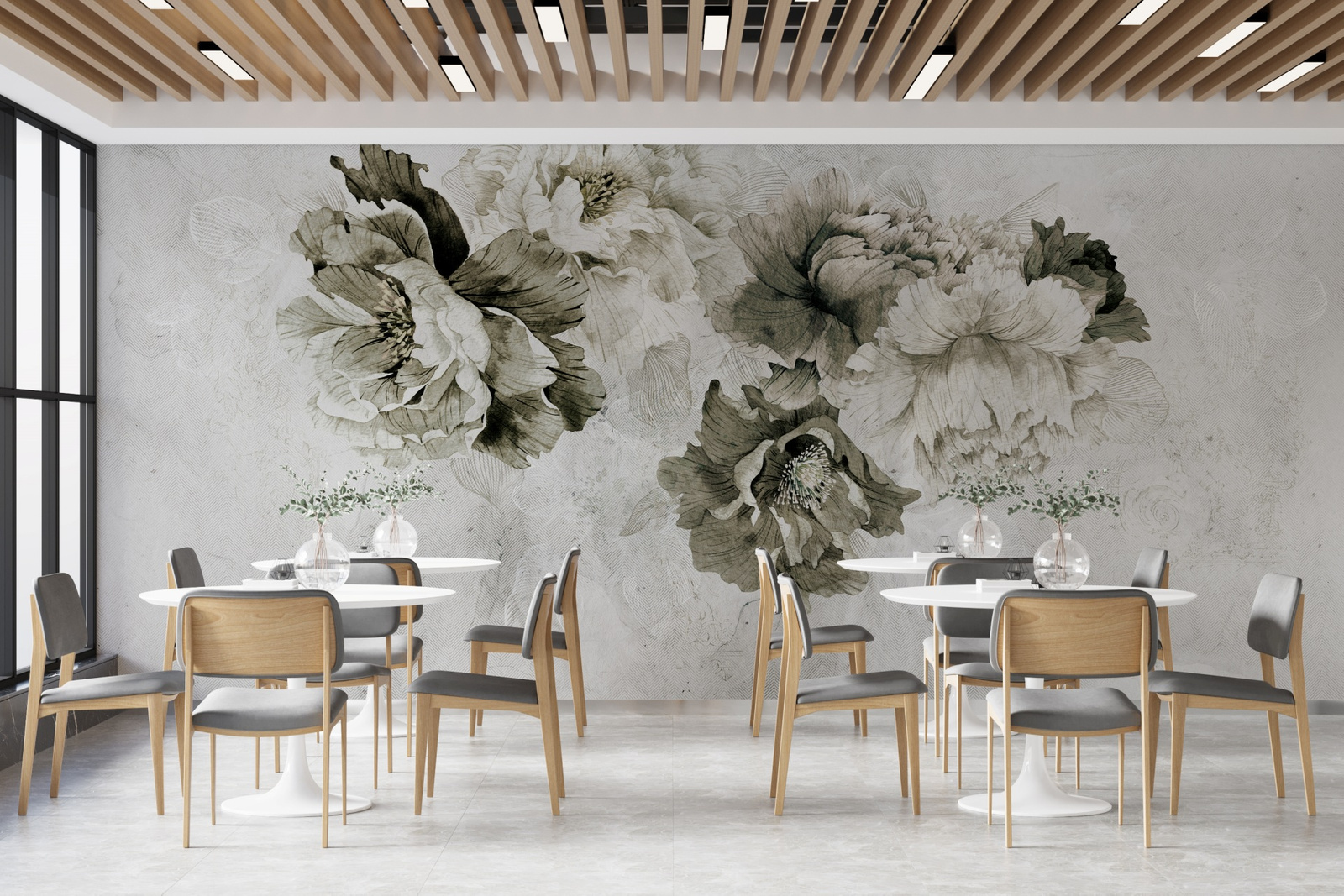 - Tapeta winylowa z motywem kwiatowym w odcieniach szarości i khaki.