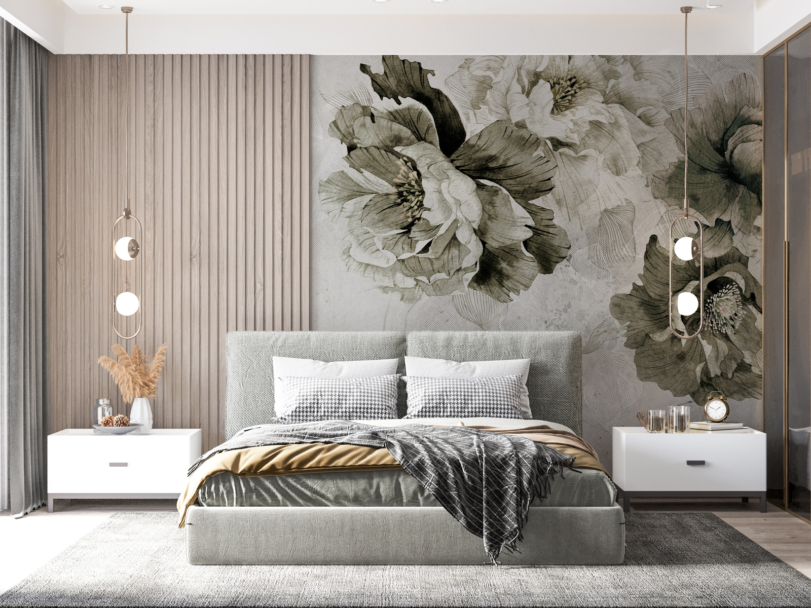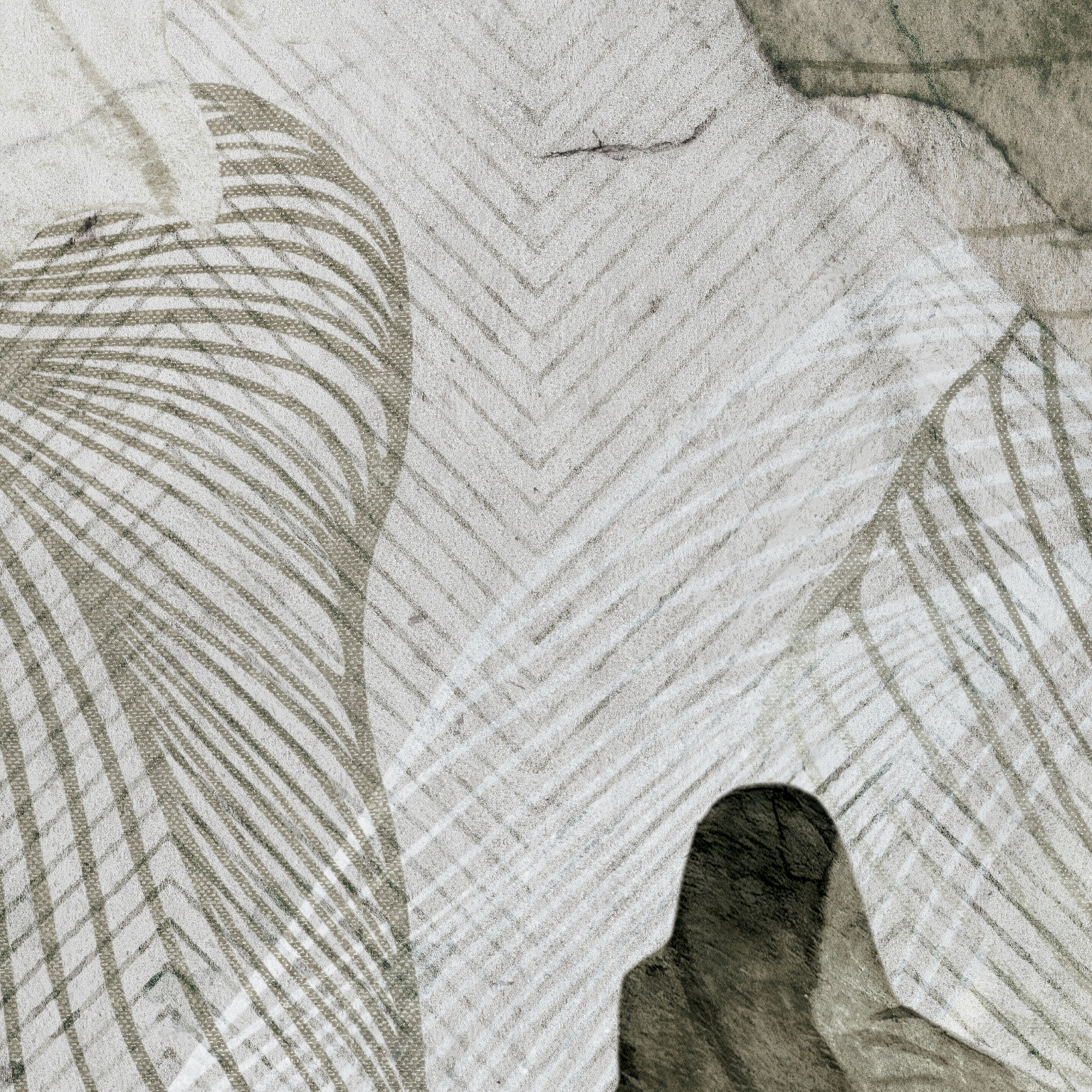 • Tapeta winylowa z motywem kwiatowym w odcieniach szarości i khaki.