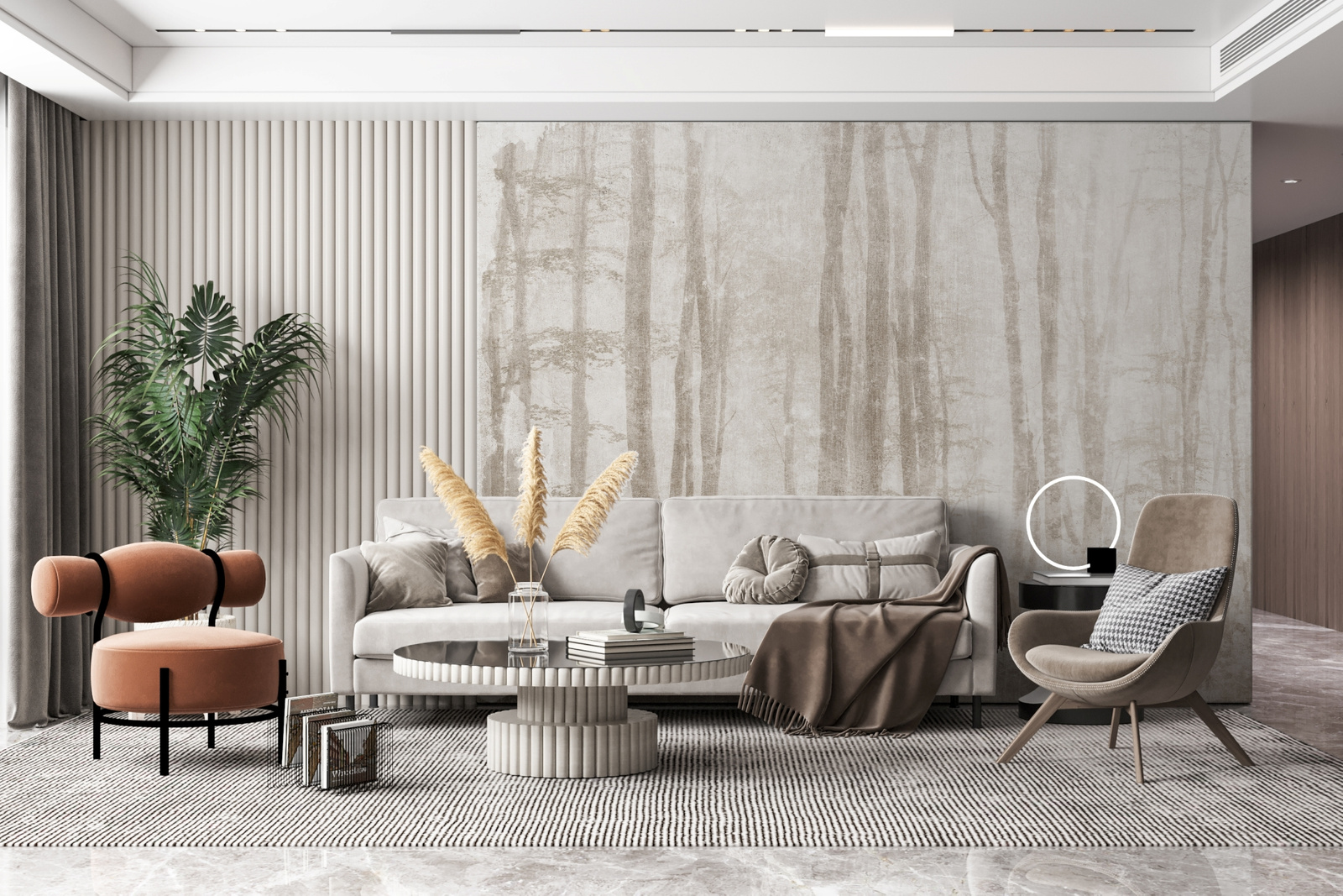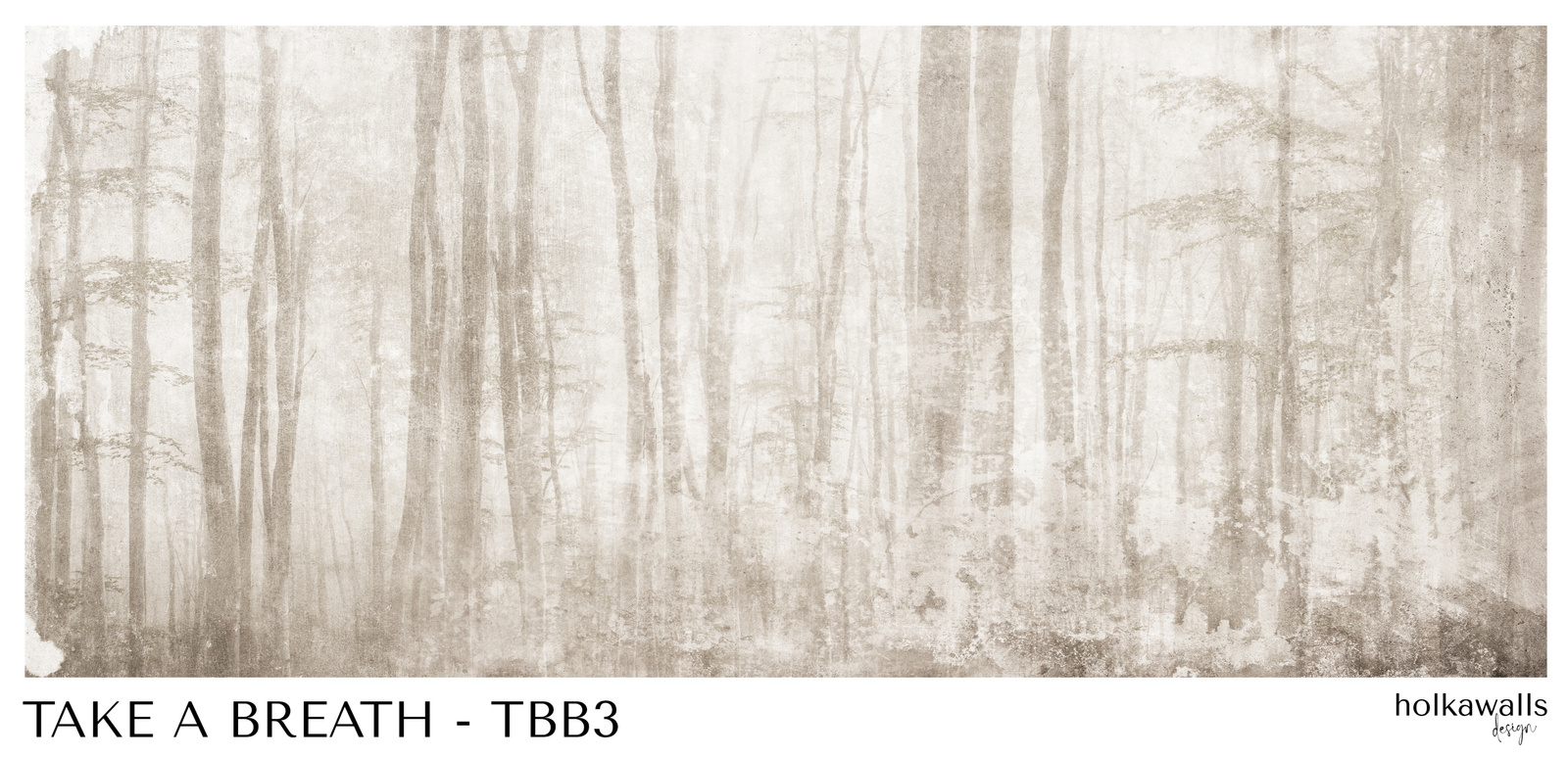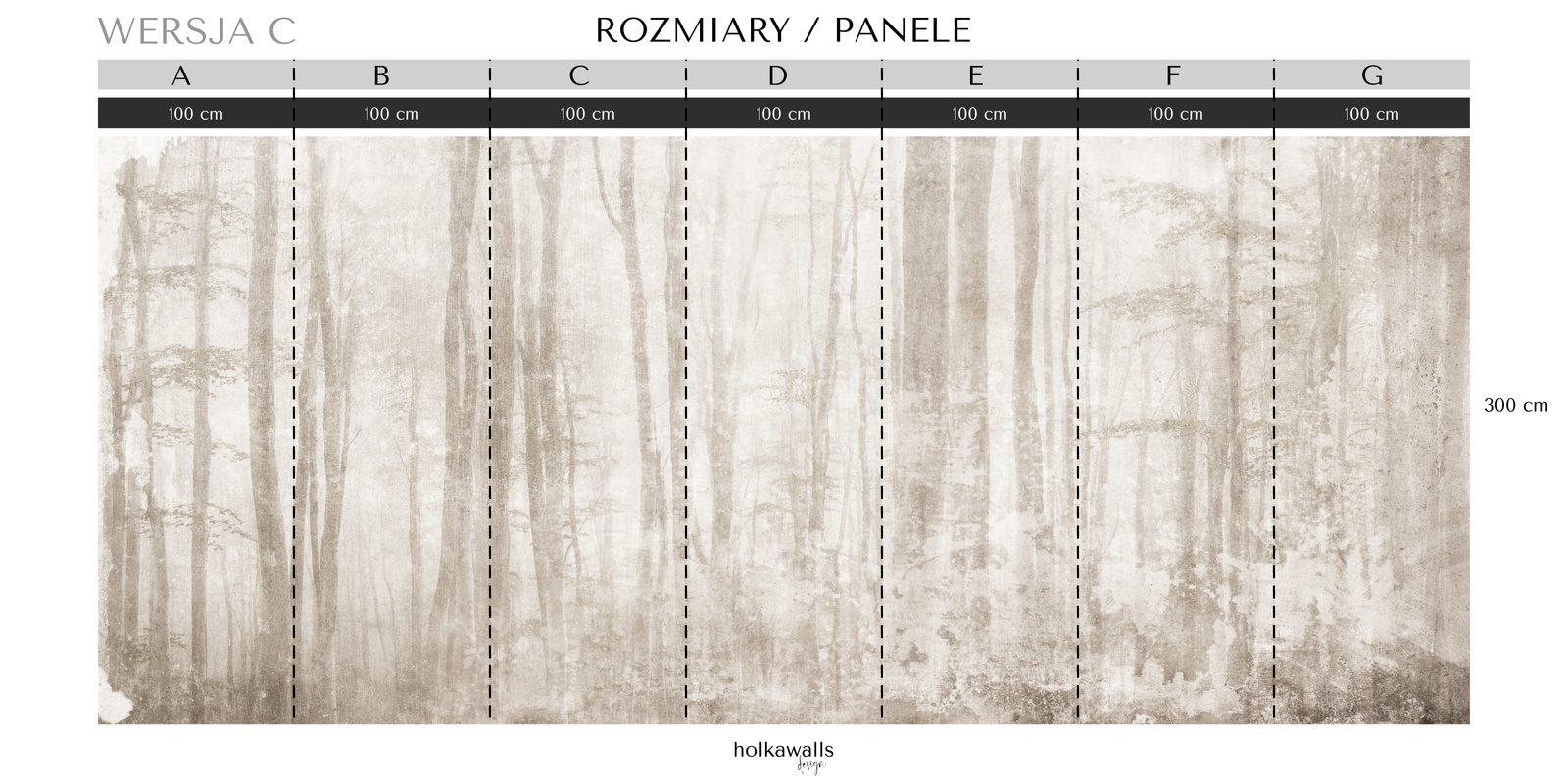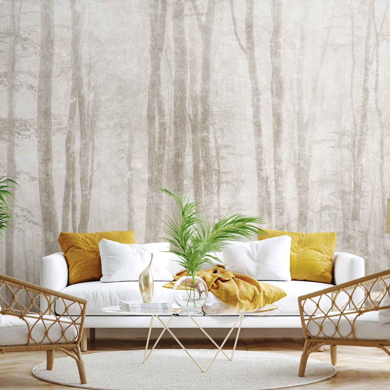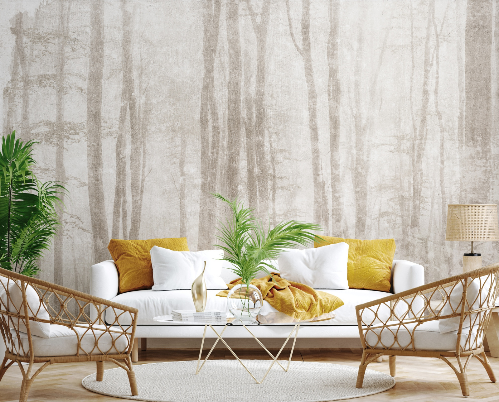 Tapeta winylowa o strukturze płótna z motywem lasu w odcieniach beżu.