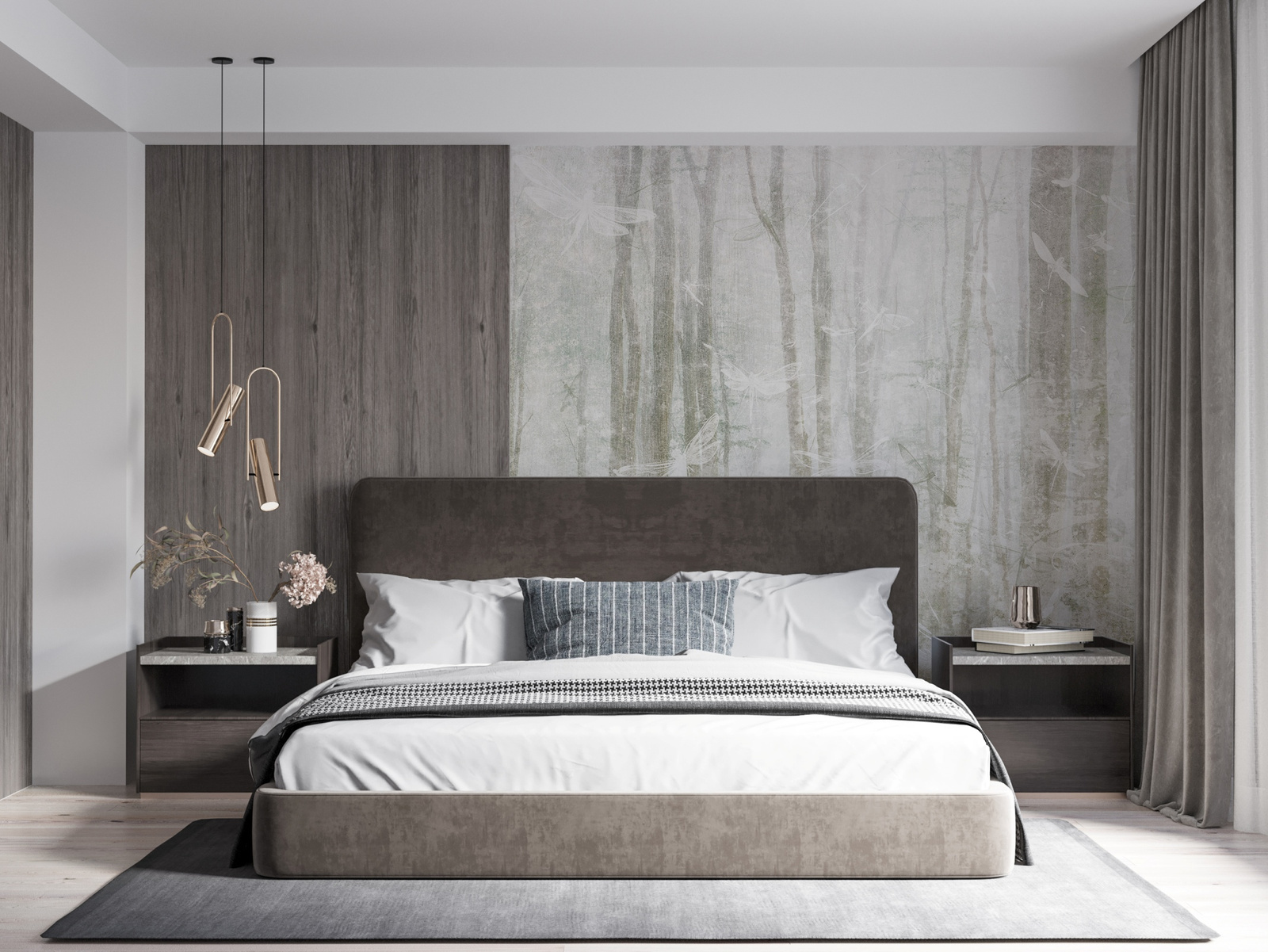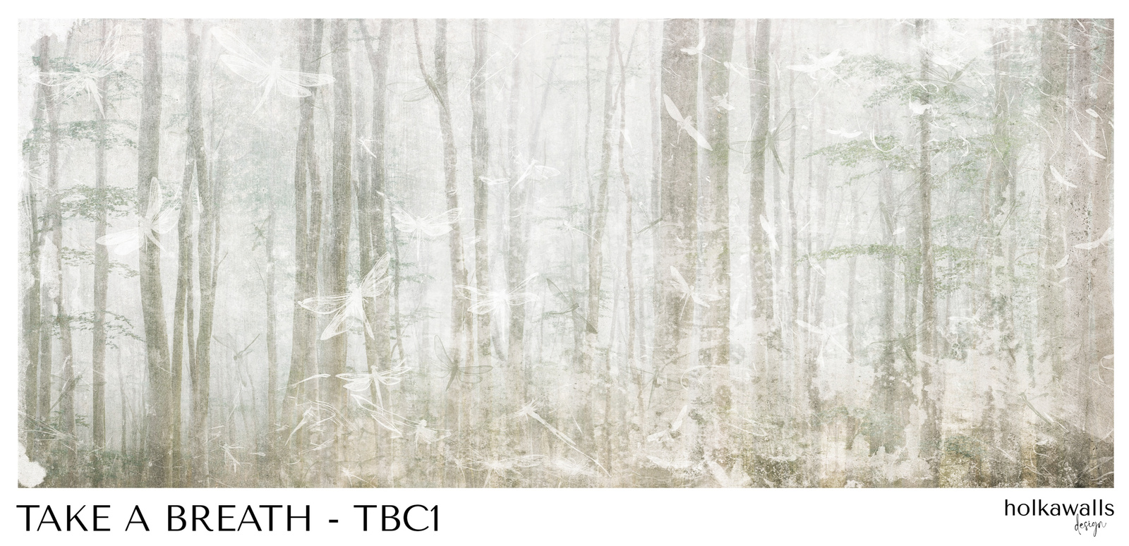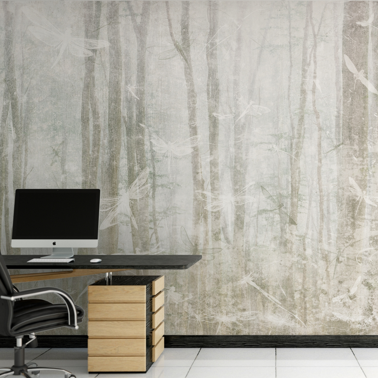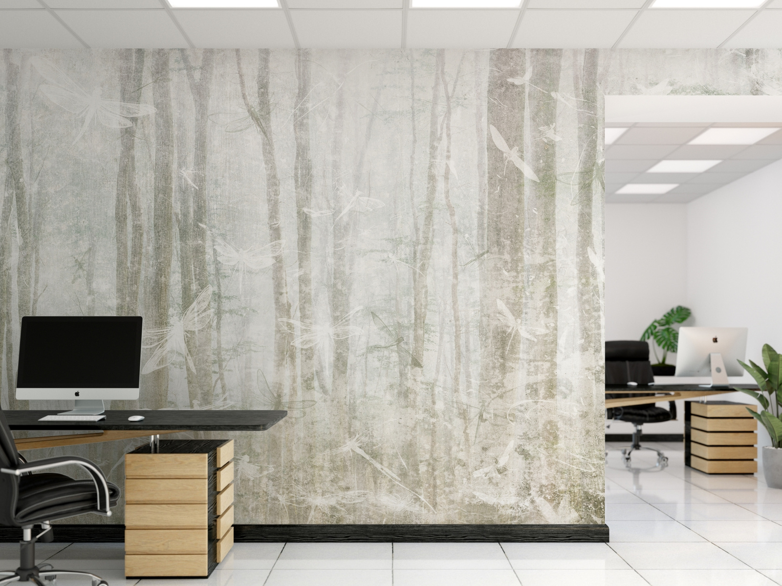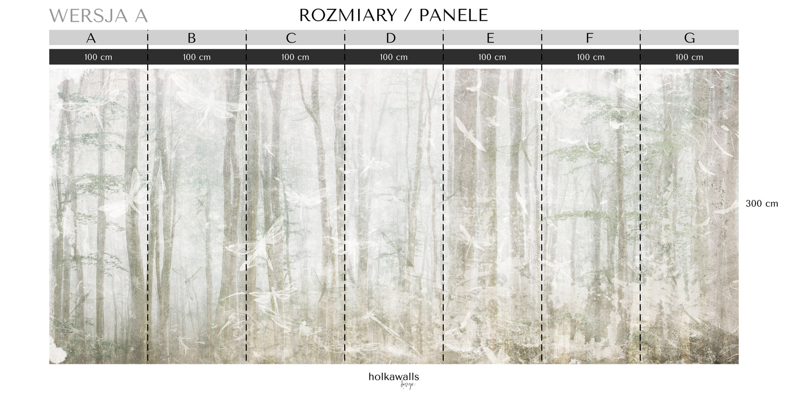 - Tapeta winylowa o strukturze płótna z lasem i ważkami.