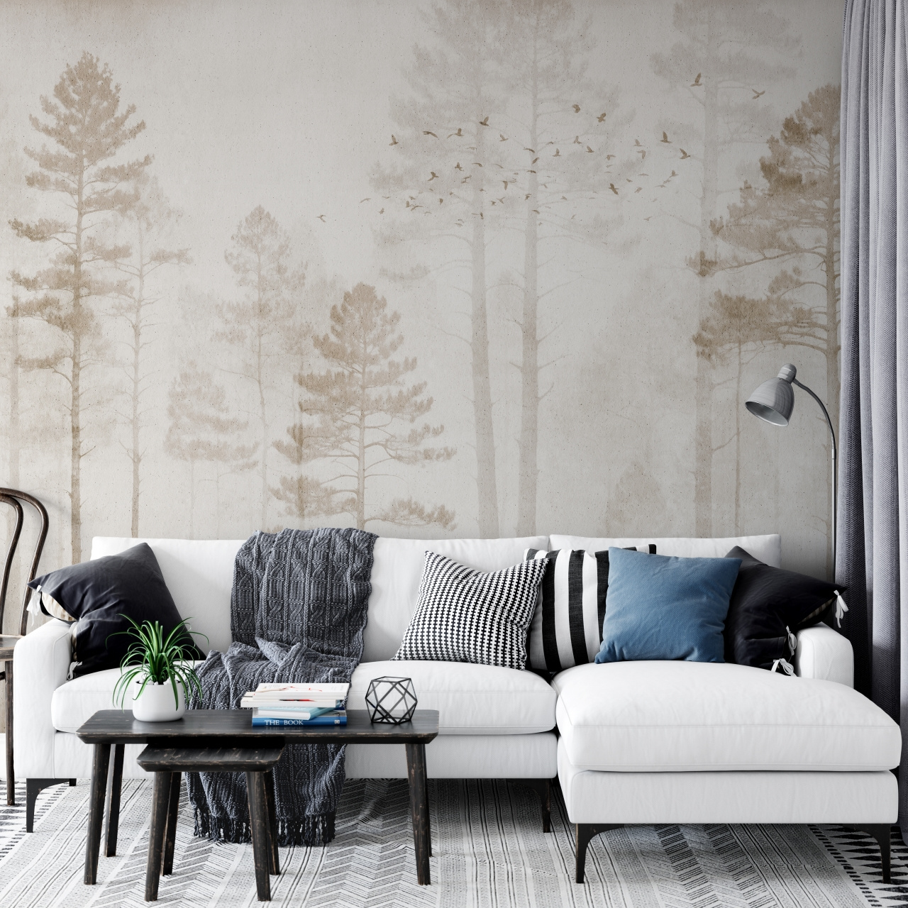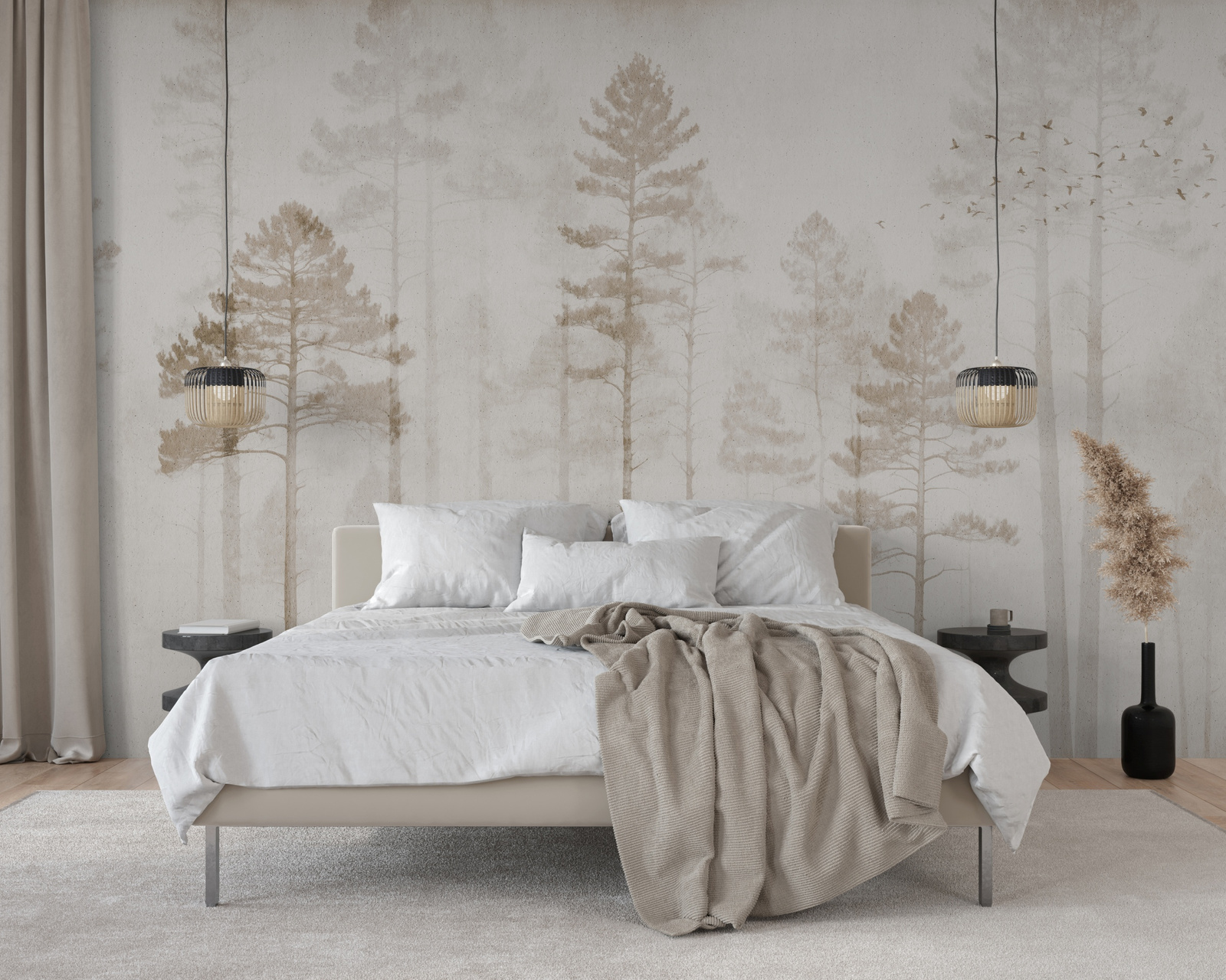 Delikatna tapeta winylowa o strukturze płótna z motywem sosnowego lasu w odcieniach beżu.
