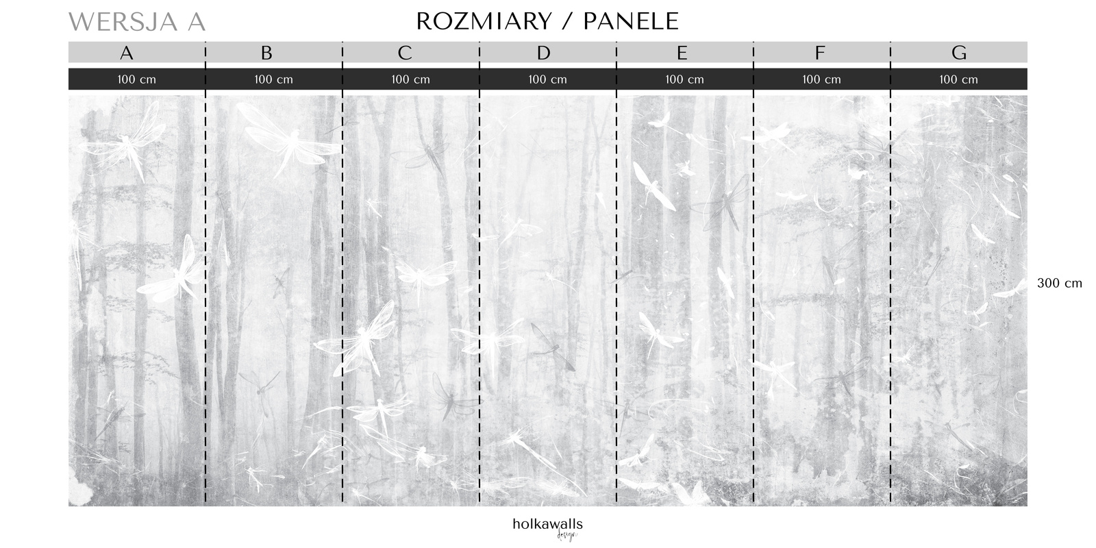 • Tapeta winylowa o strukturze płótna szara z lasem i ważkami.