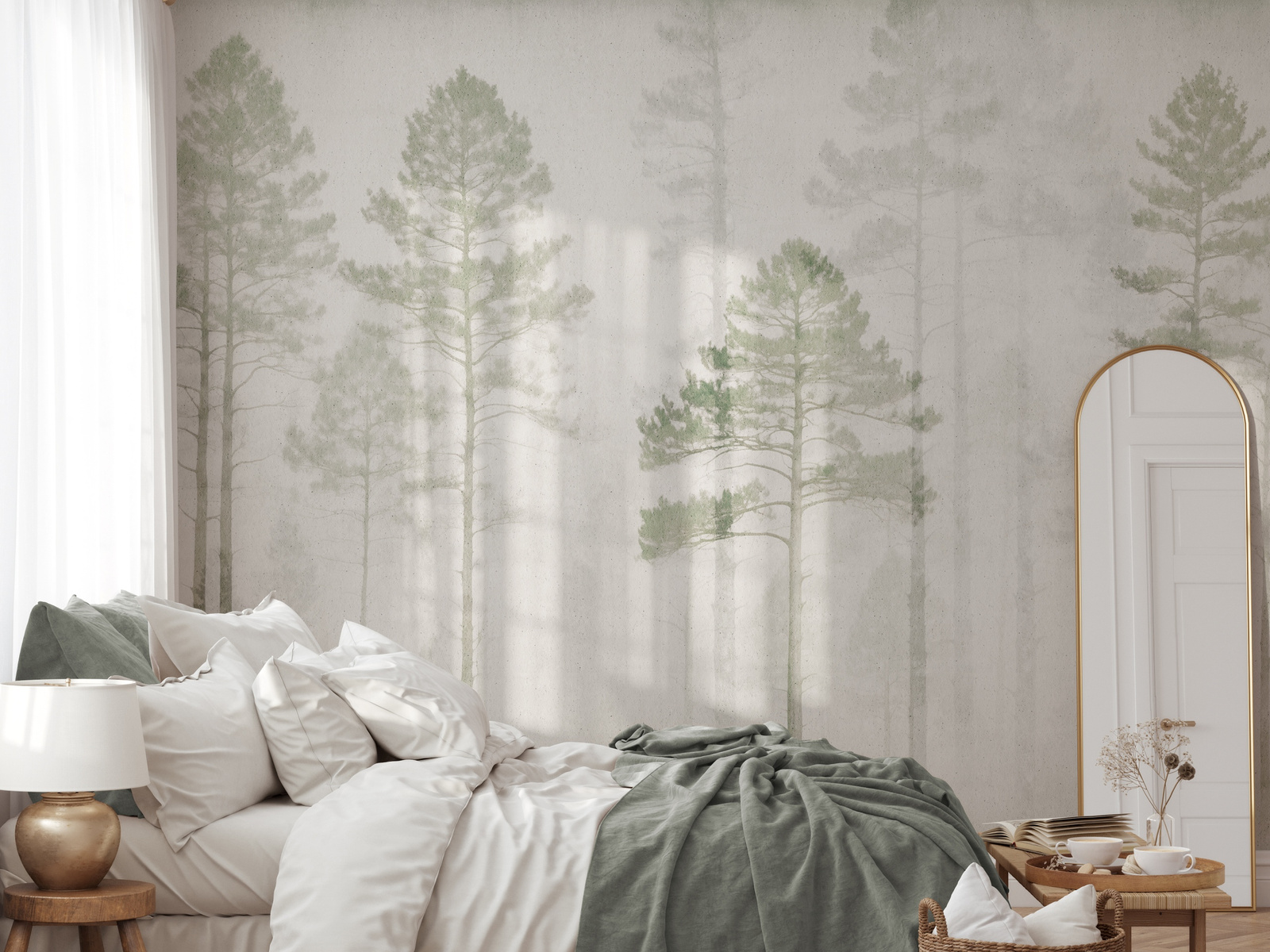 Delikatna tapeta winylowa o strukturze płótna z motywem zielonego sosnowego lasu.