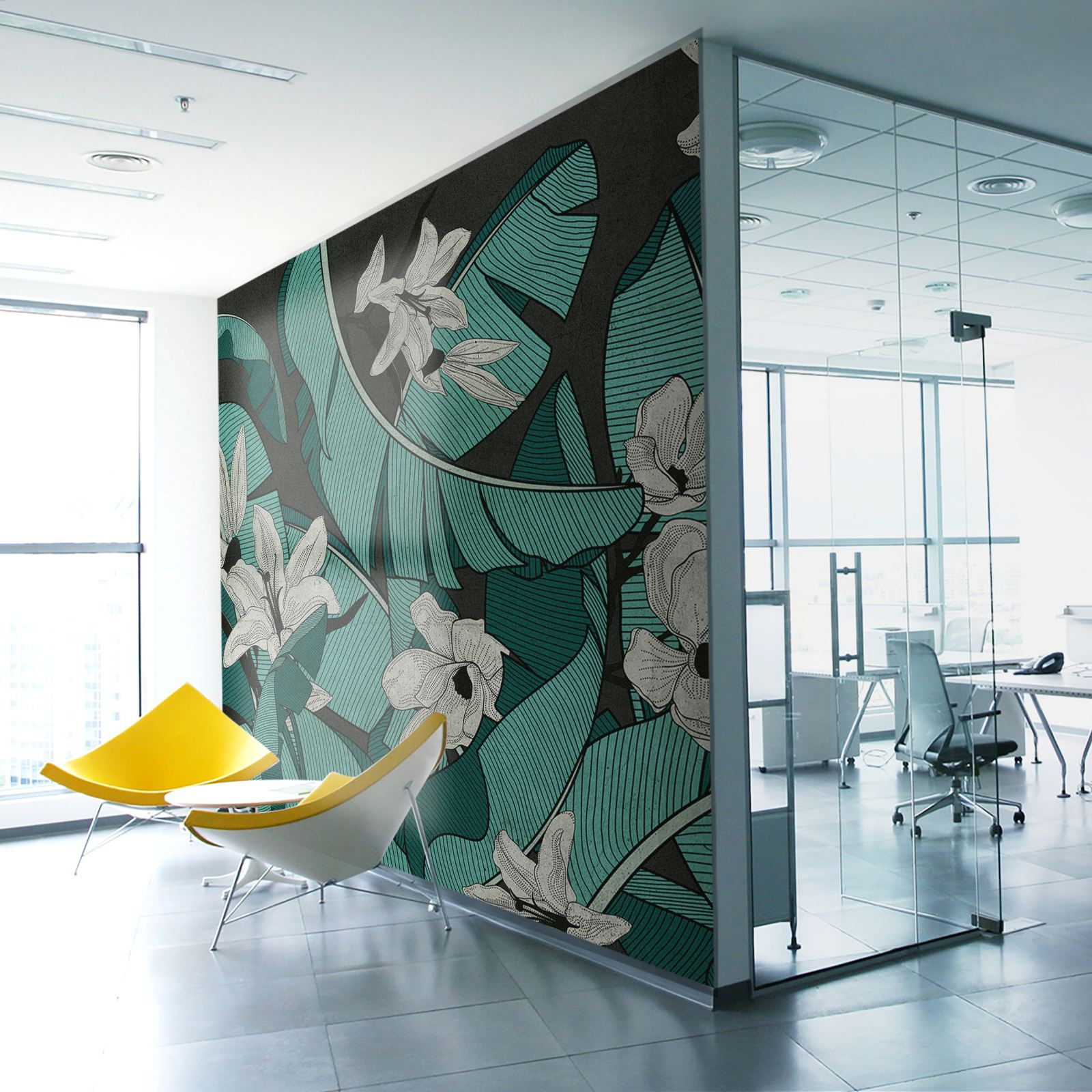 Tapeta winylowa o strukturze płótna z motywem liści bananowca i kwiatów na czarnym tle.
