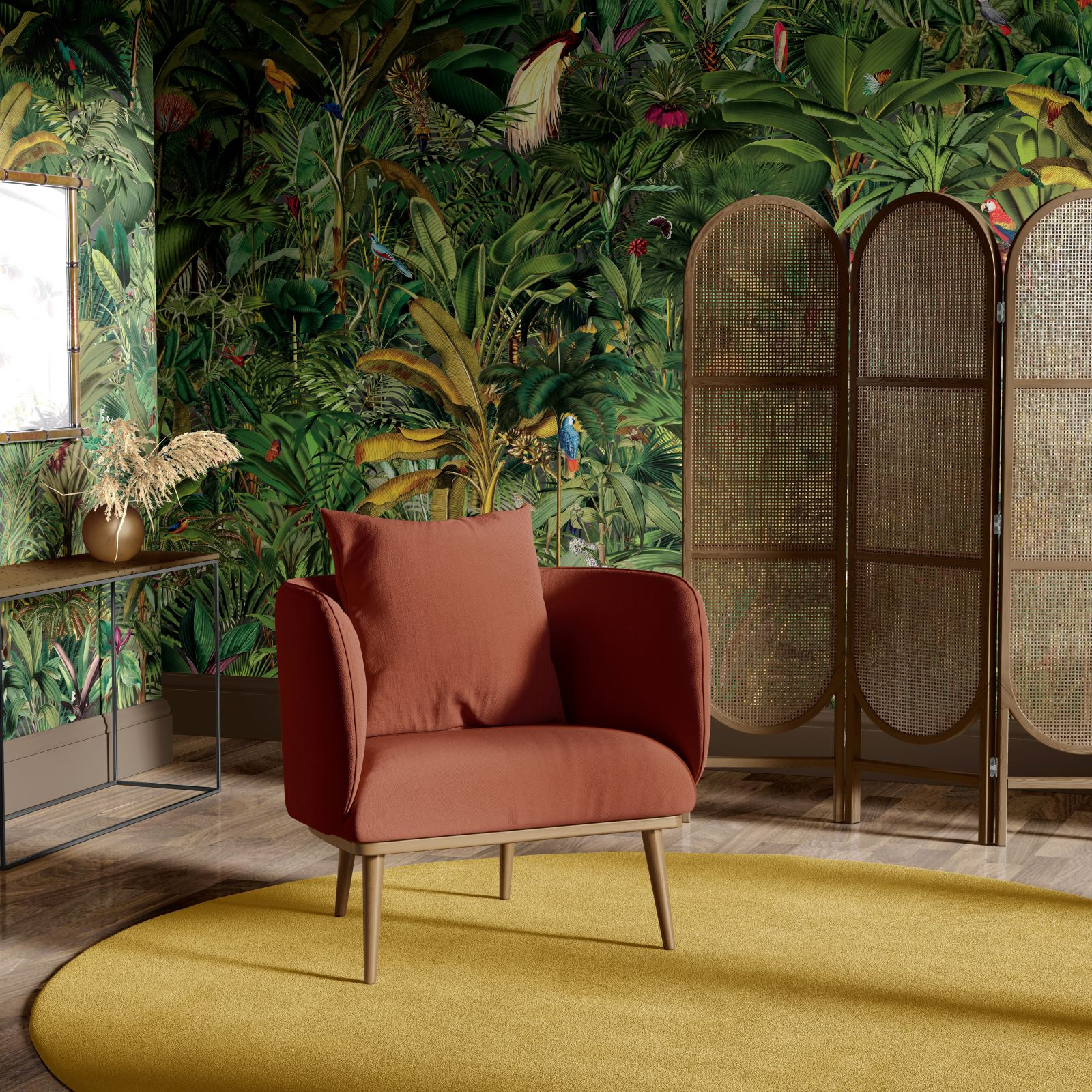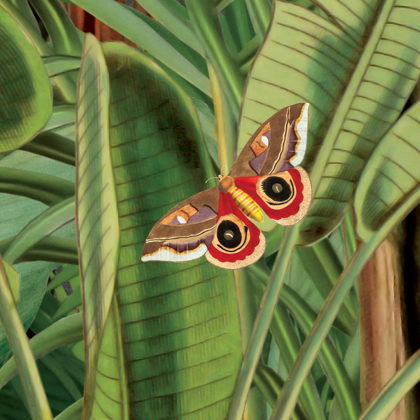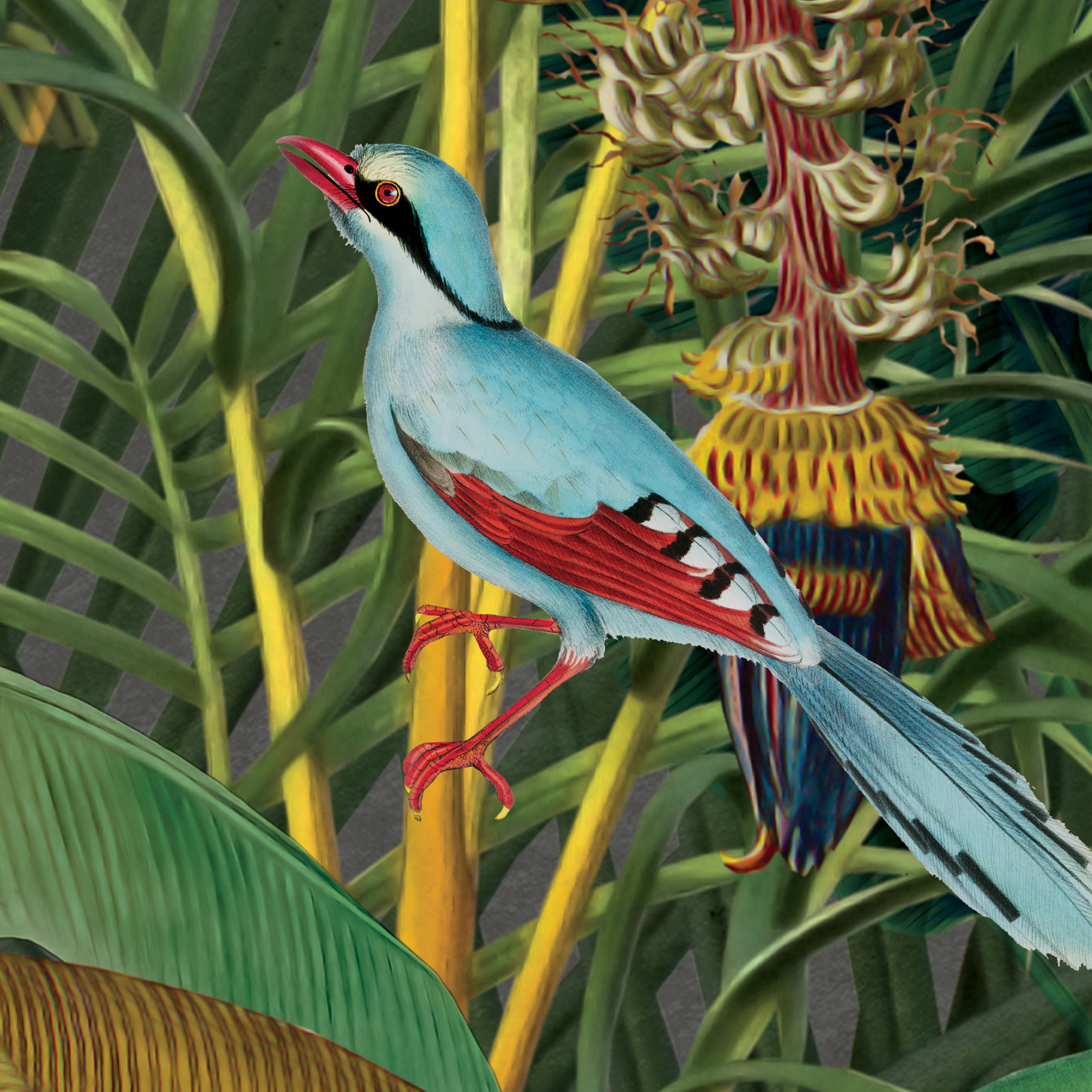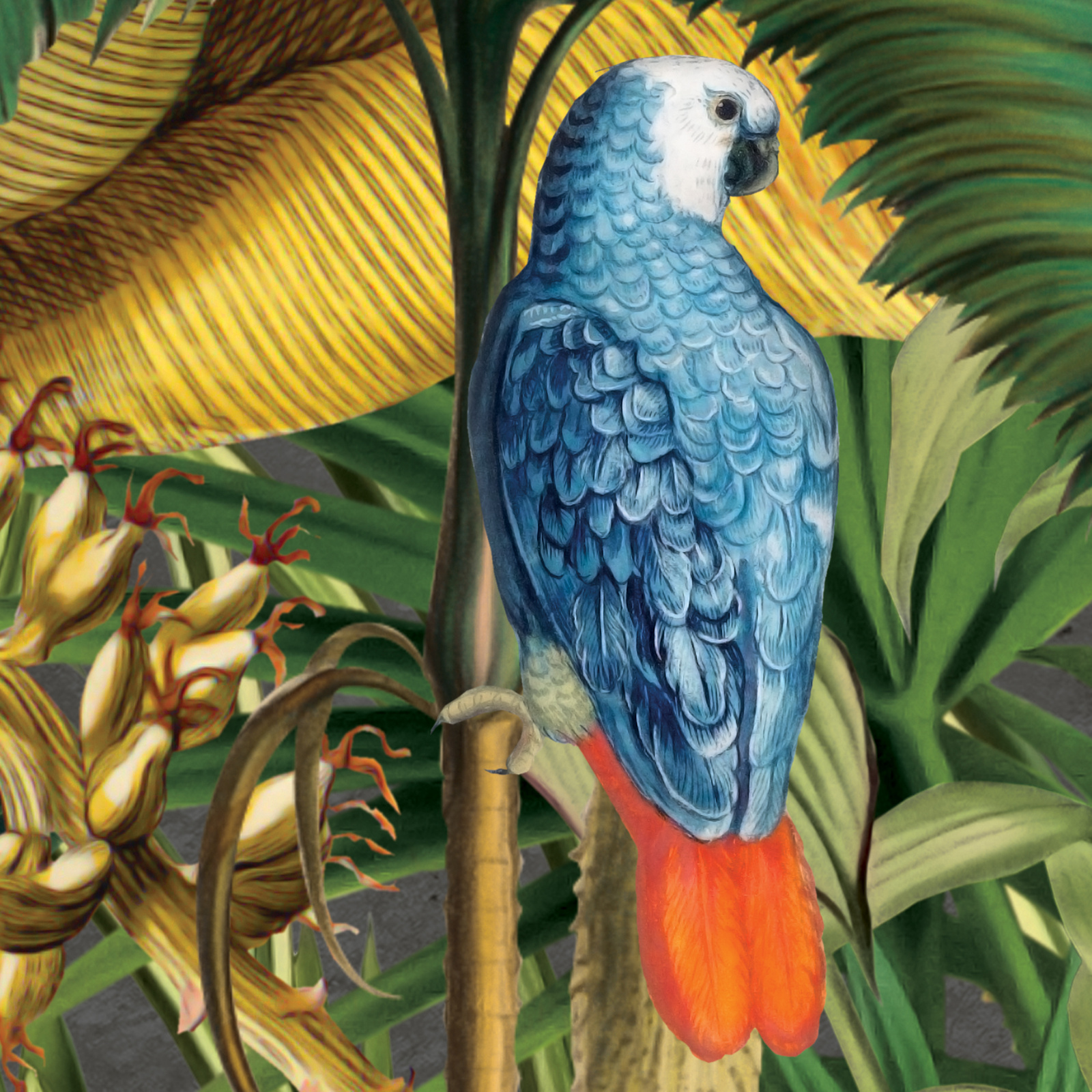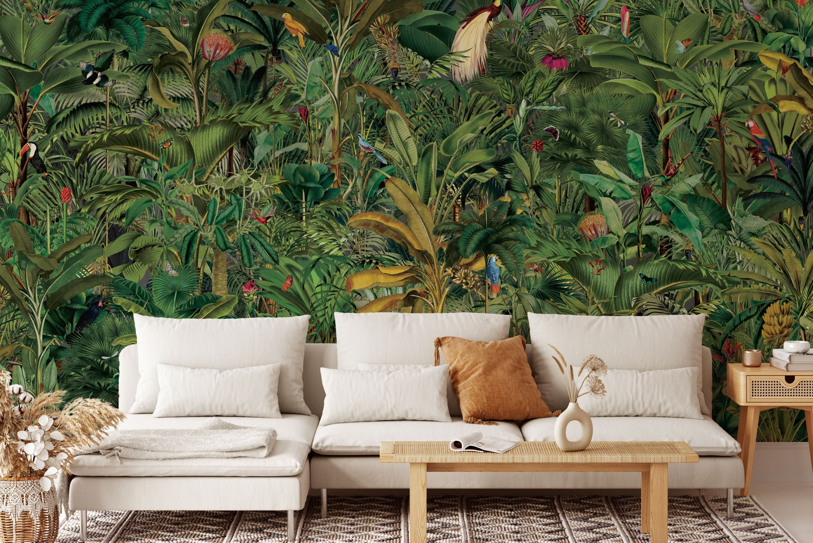 • Tapeta o strukturze płótna z kolorową, tropikalną dżunglą i zwierzętami.