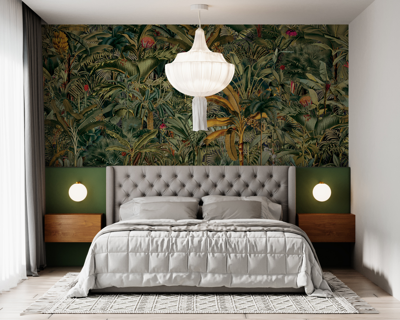 Tapeta winylowa o strukturze płótna z kolorową, tropikalną dżunglą.