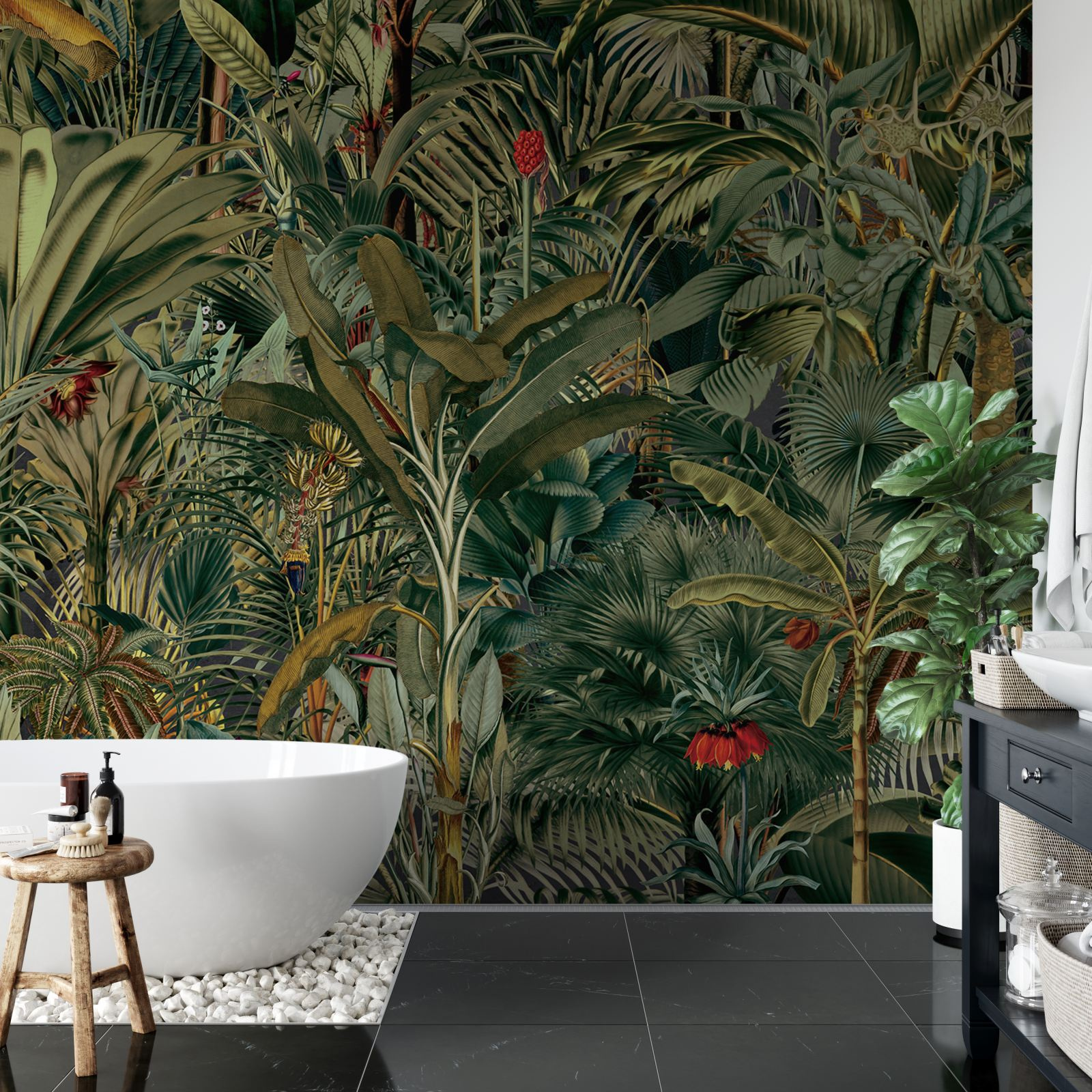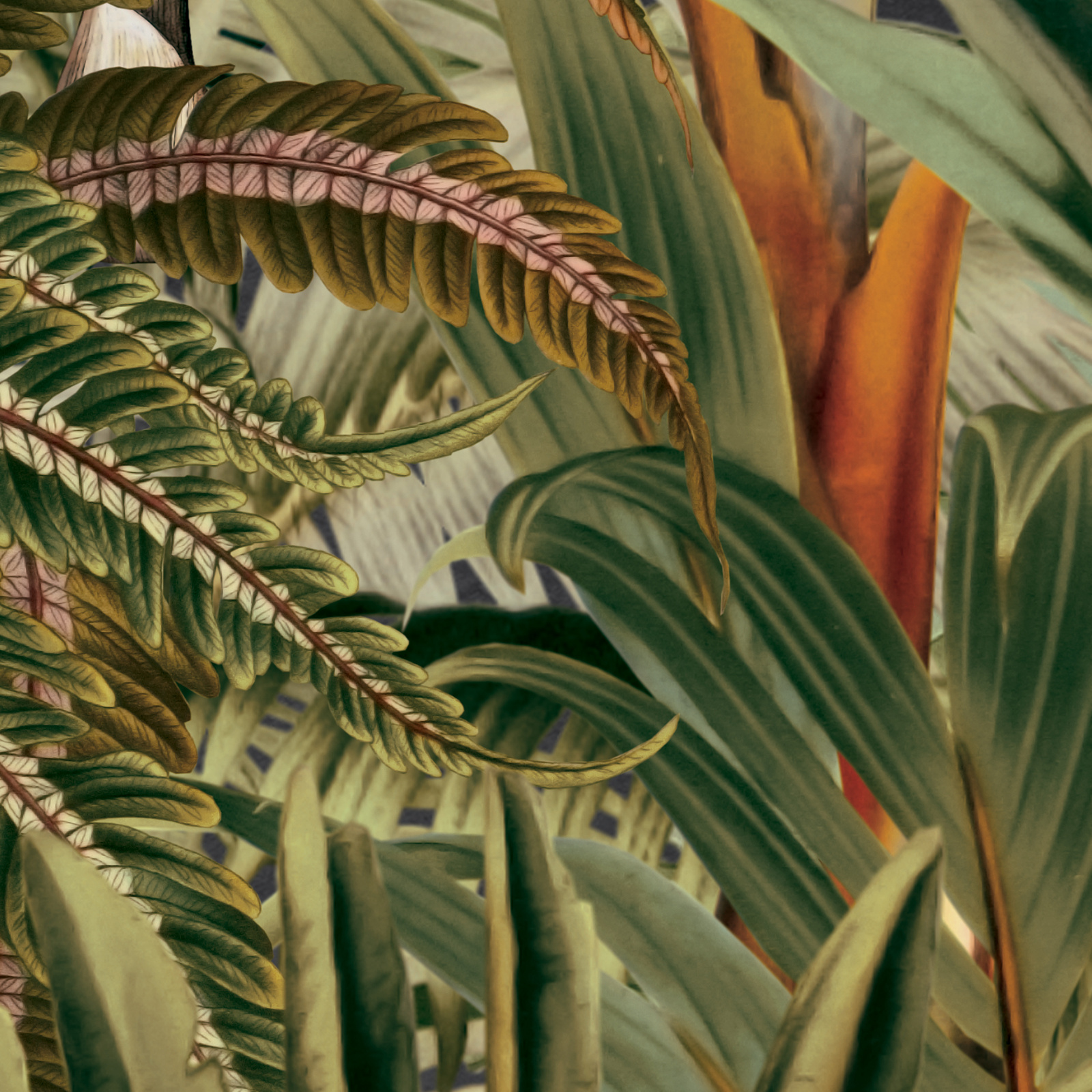 • Tapeta o strukturze płótna z kolorową, tropikalną dżunglą i zwierzętami.