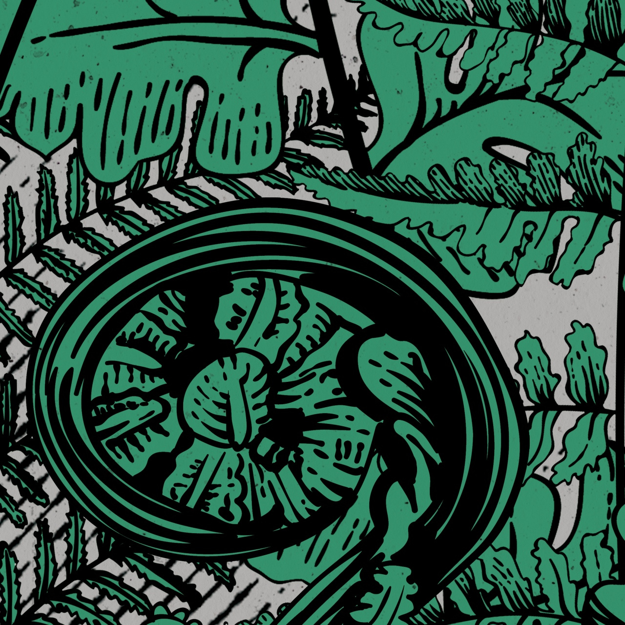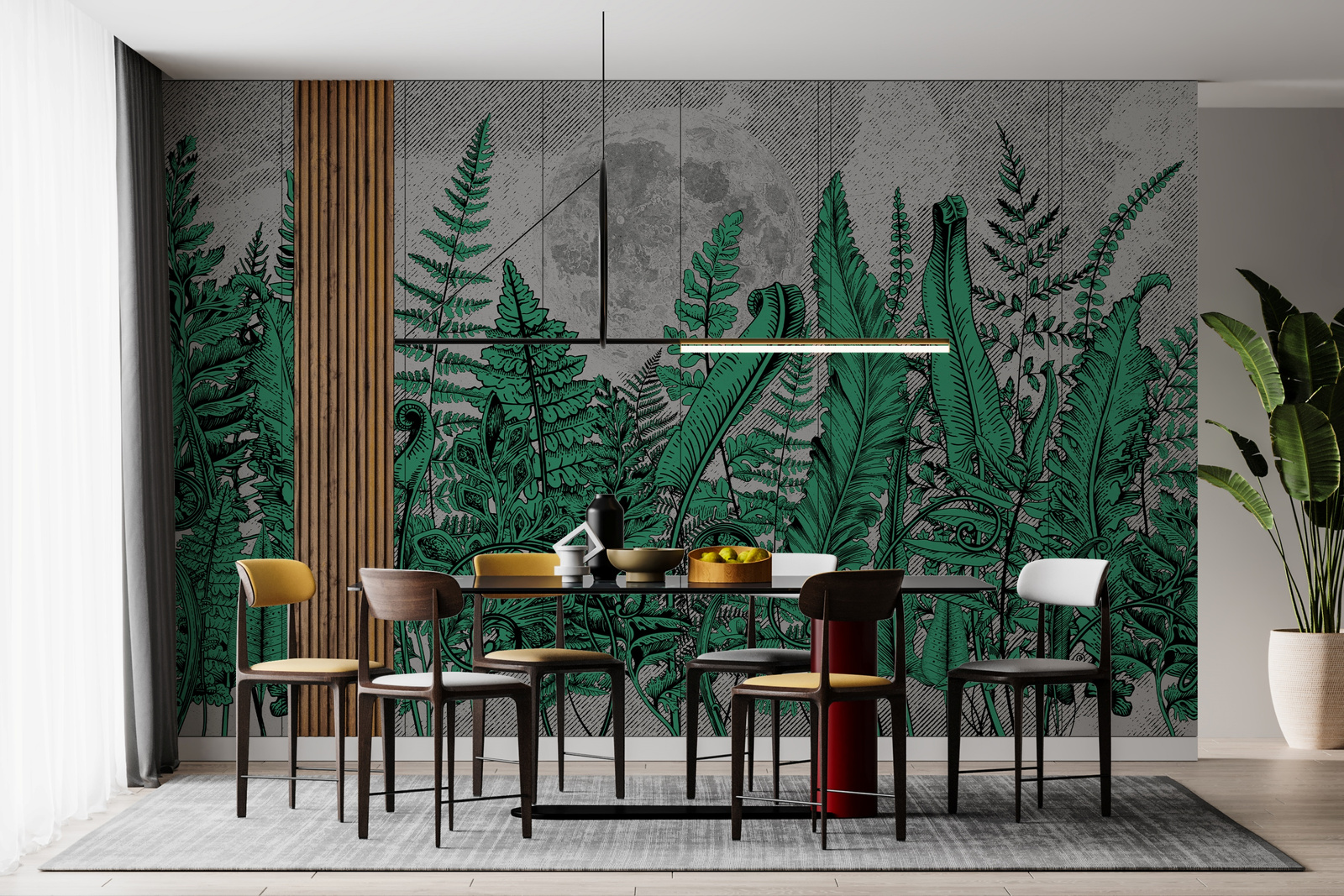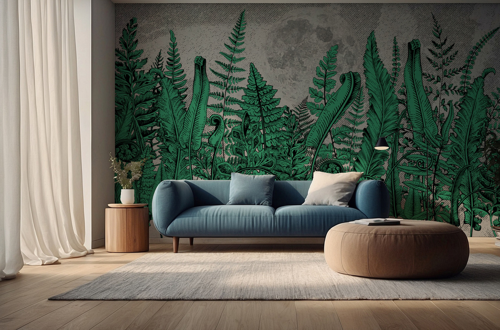 • Tapeta o strukturze płótna z motywem paproci i księżyca.
