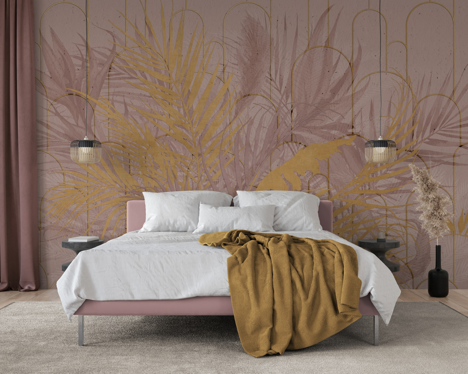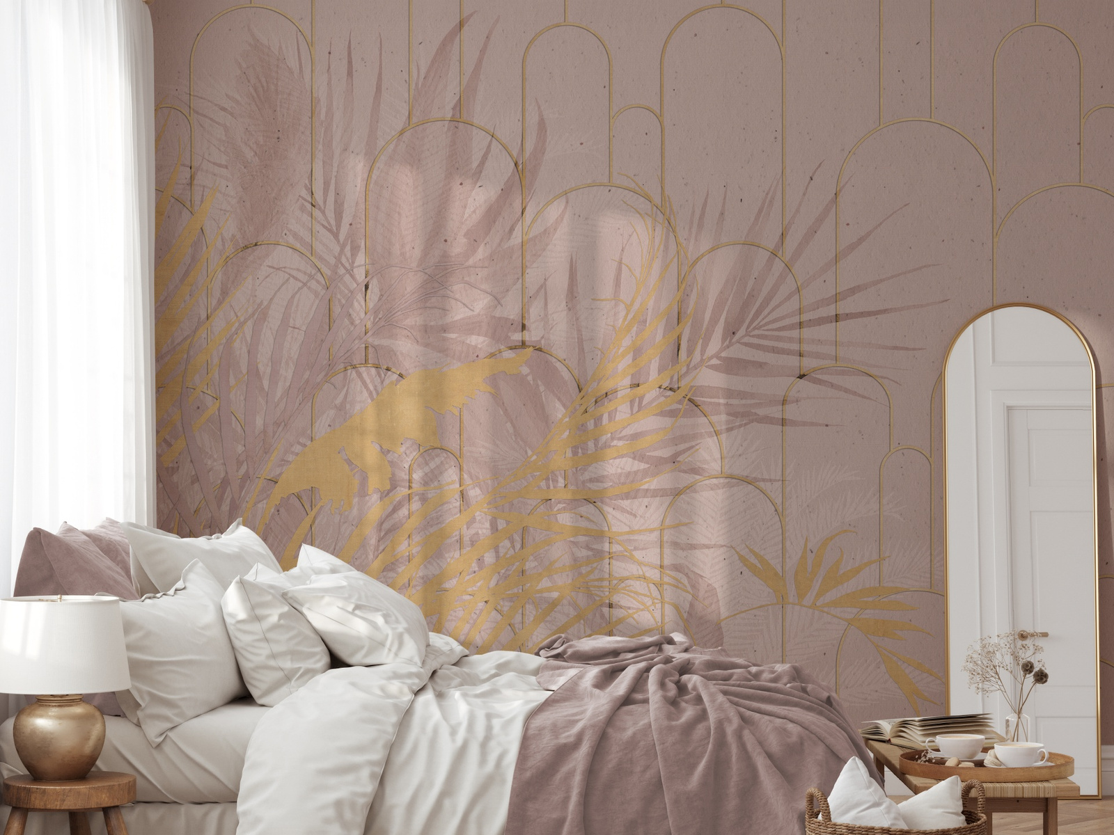 - Tapeta o strukturze płótna z motywem tropikalnych liści na różowym tle.