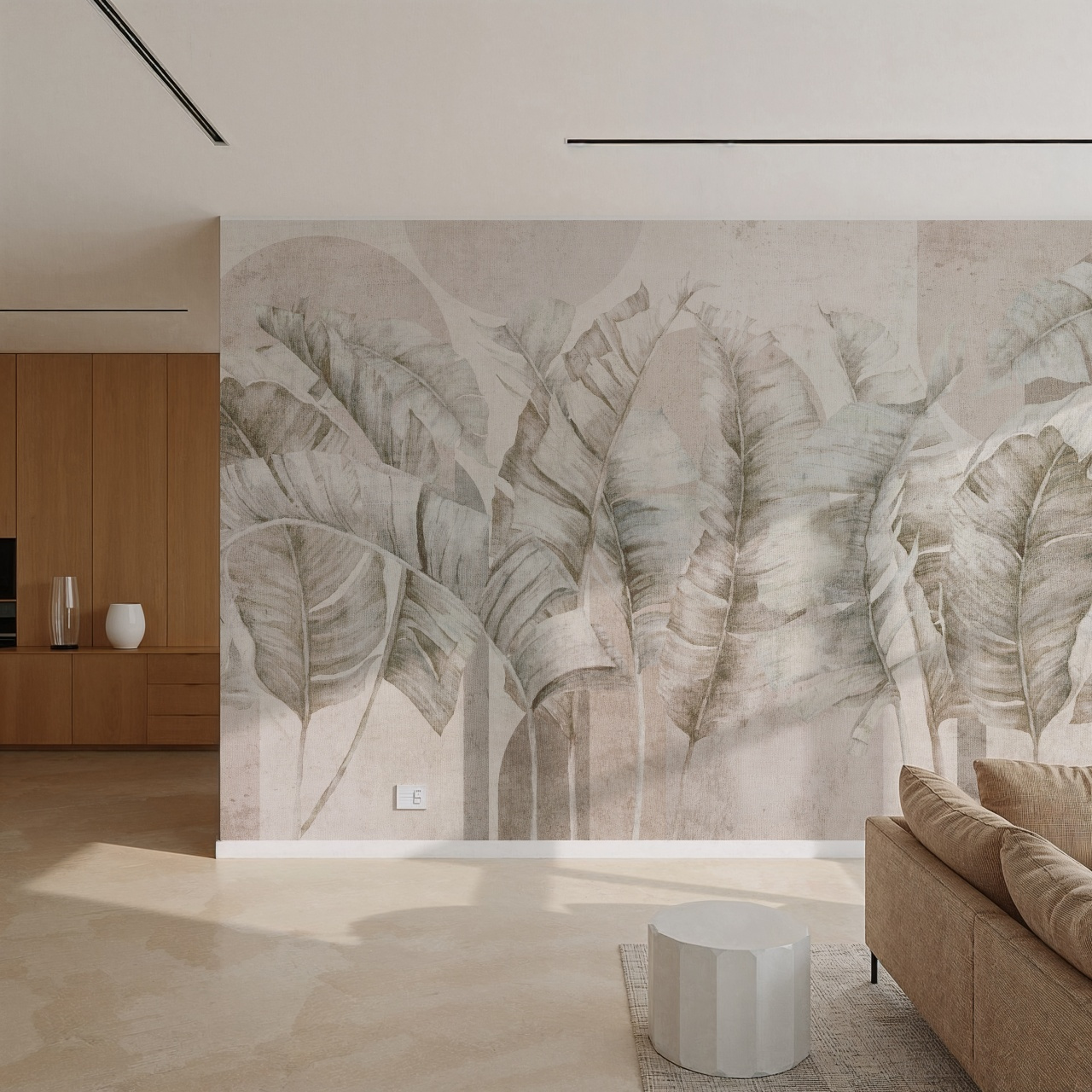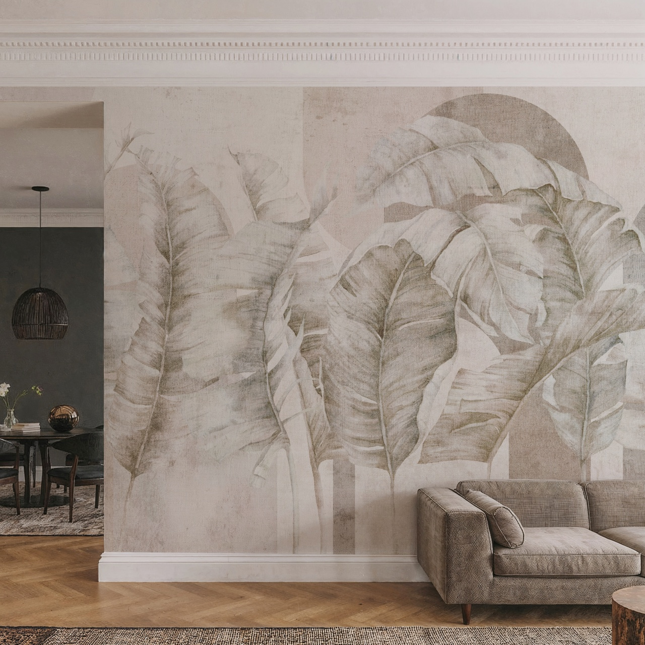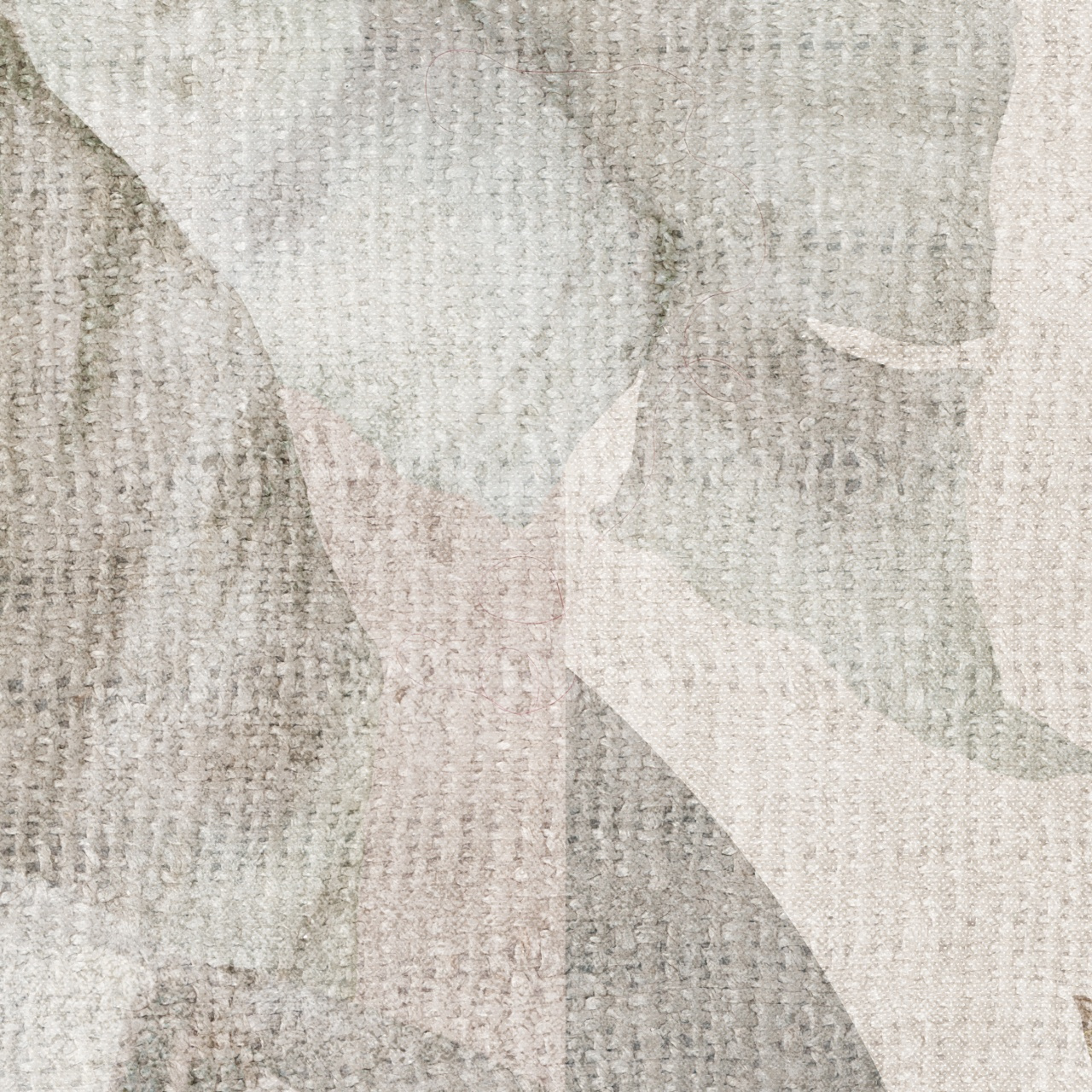 Tapeta winylowa o strukturze płótna z motywem tropikalnych liści i elementów geometrycznych w odcieniach beżu na jasnym tle.