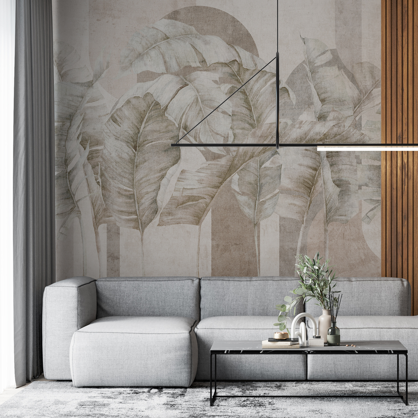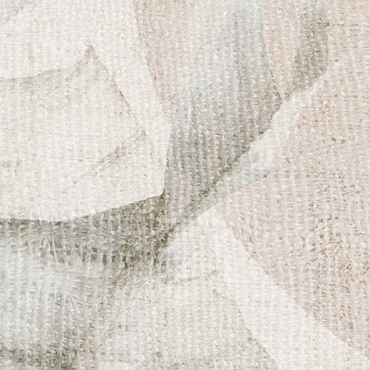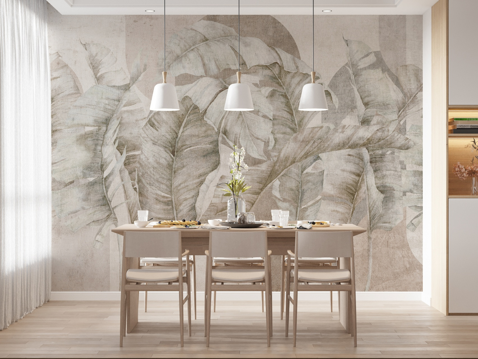 Tapeta winylowa o strukturze płótna z motywem tropikalnych liści i elementów geometrycznych w odcieniach beżu na jasnym tle.