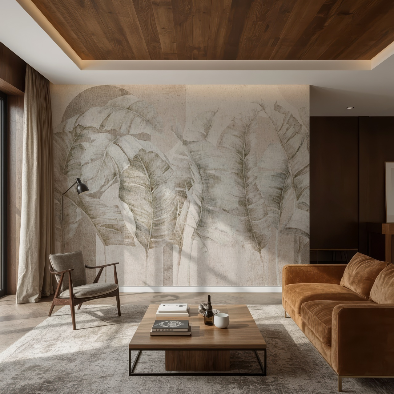 - Tapeta o strukturze płótna z motywem tropikalnych liści w odcieniach beżu.