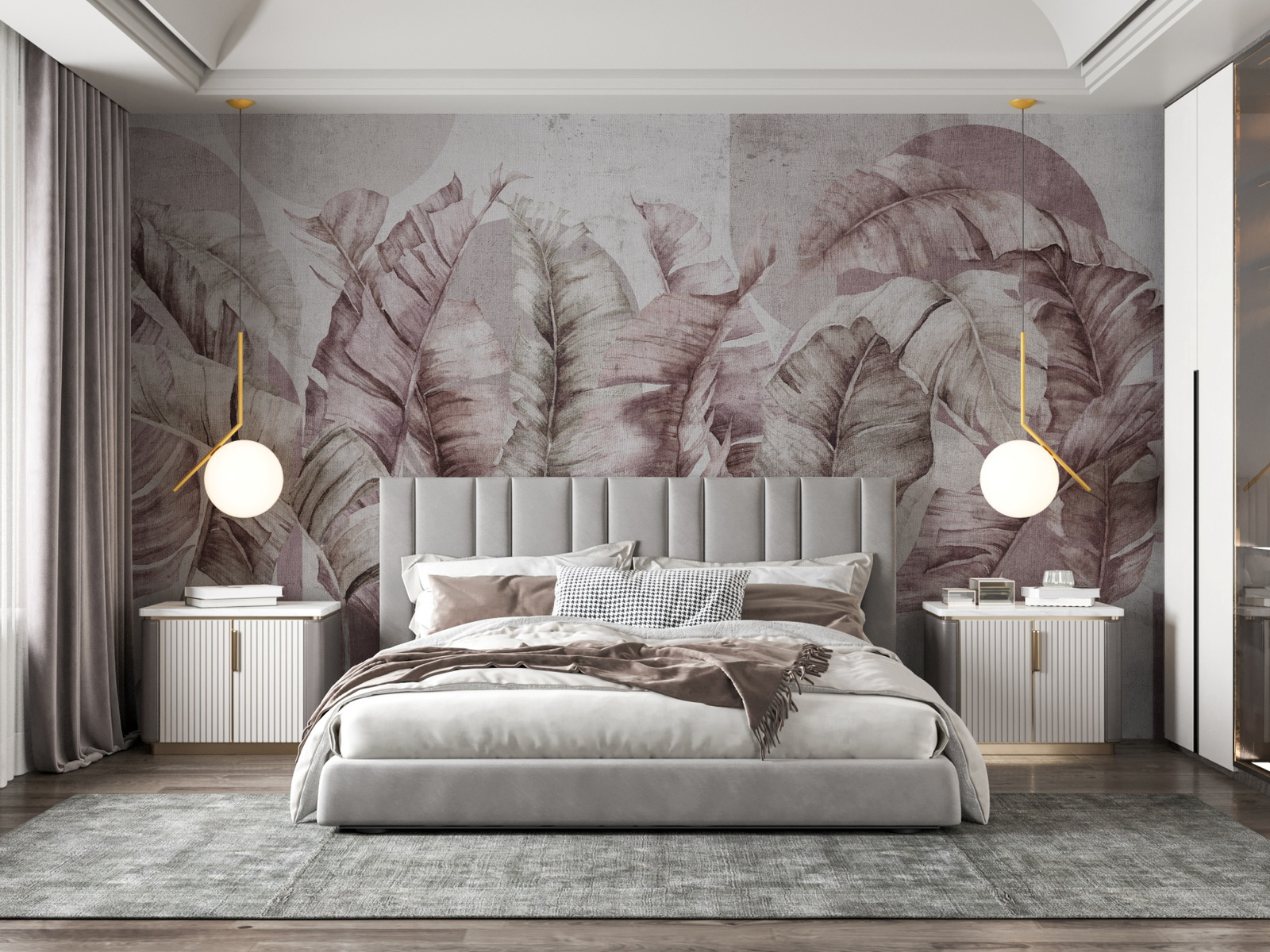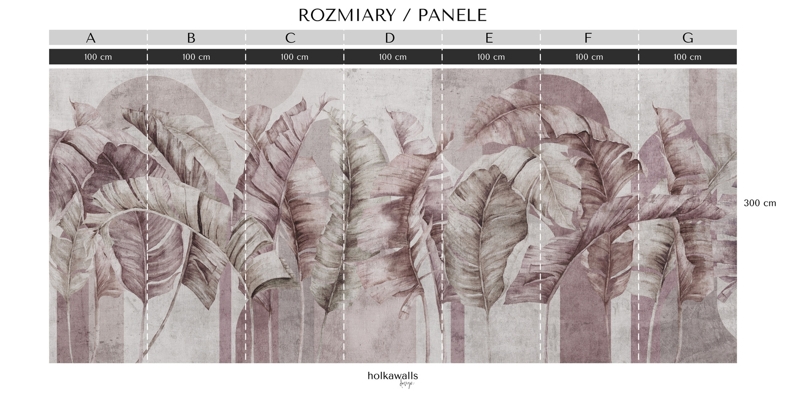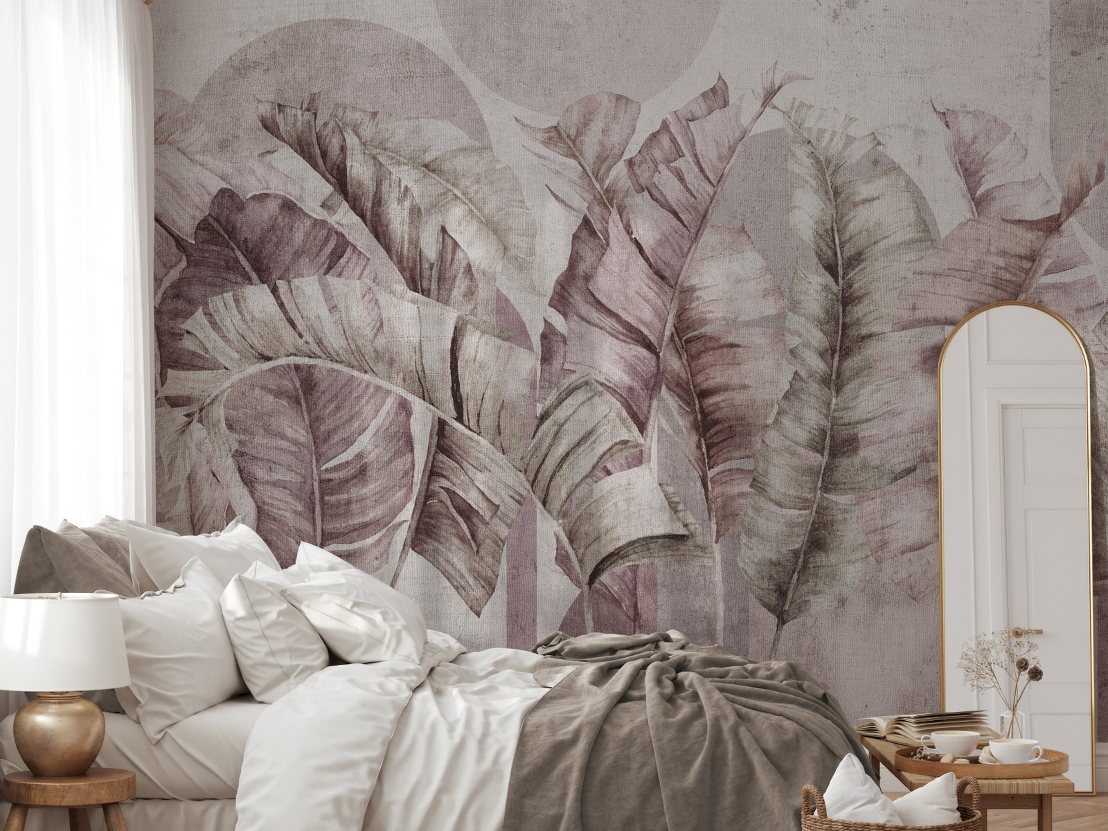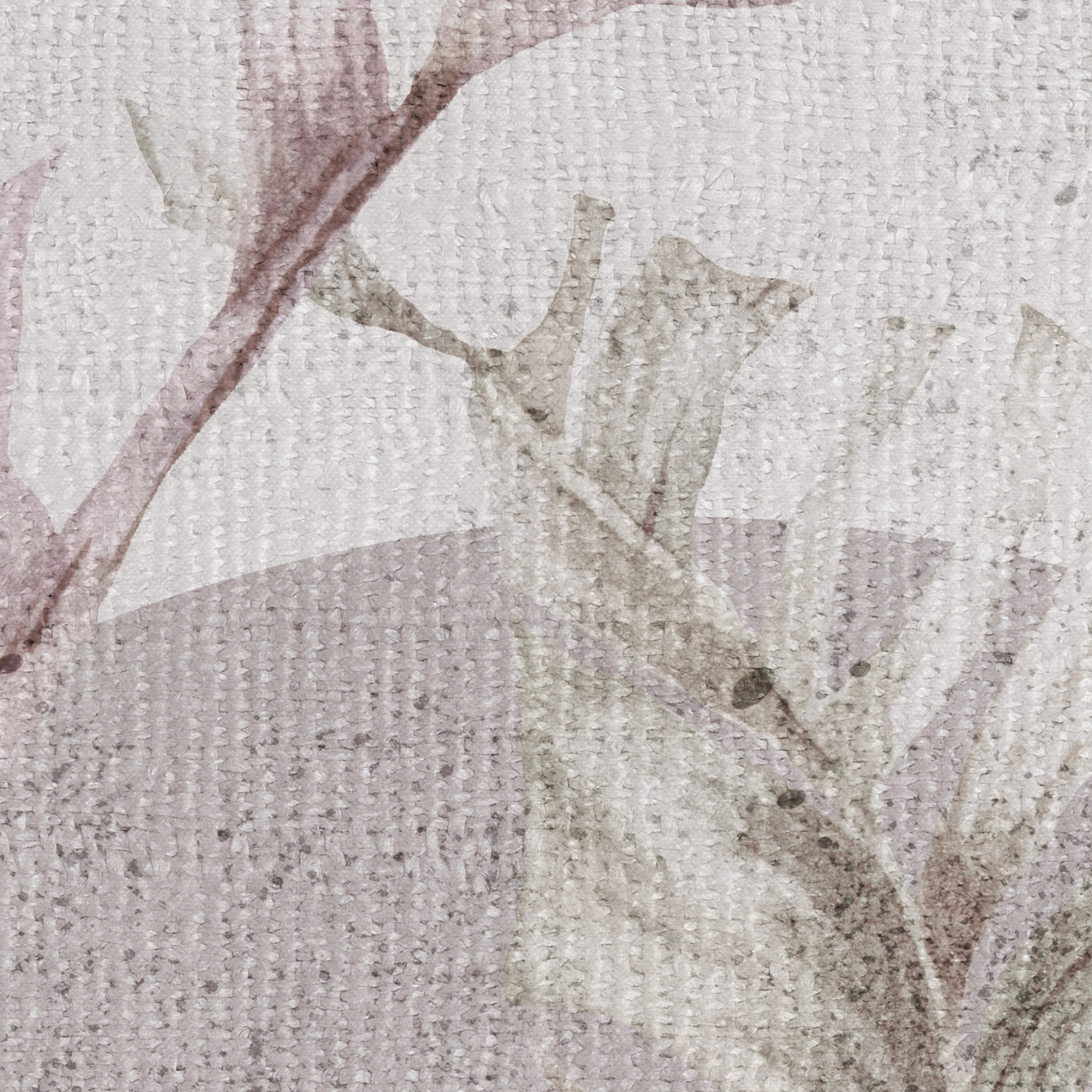 - Tapeta o strukturze płótna z motywem tropikalnych liści w odcieniach różu.