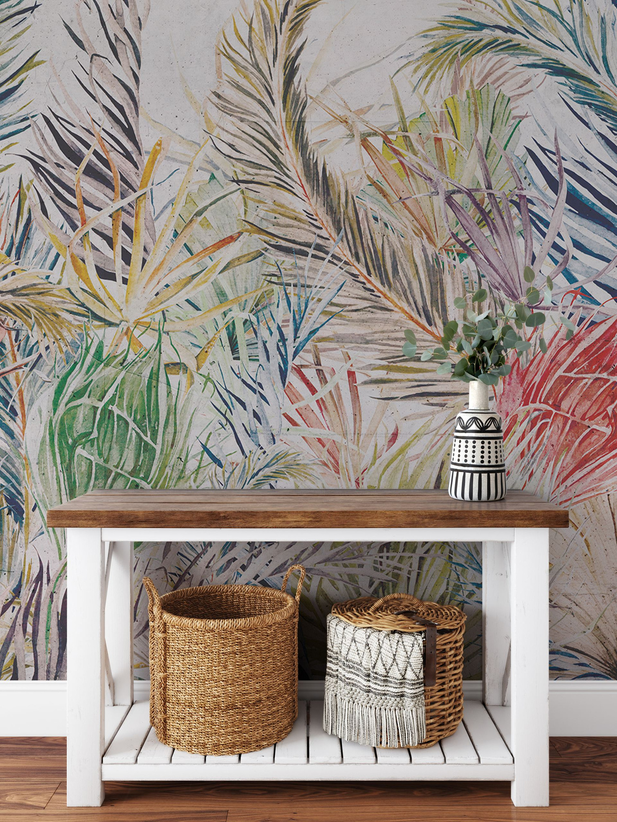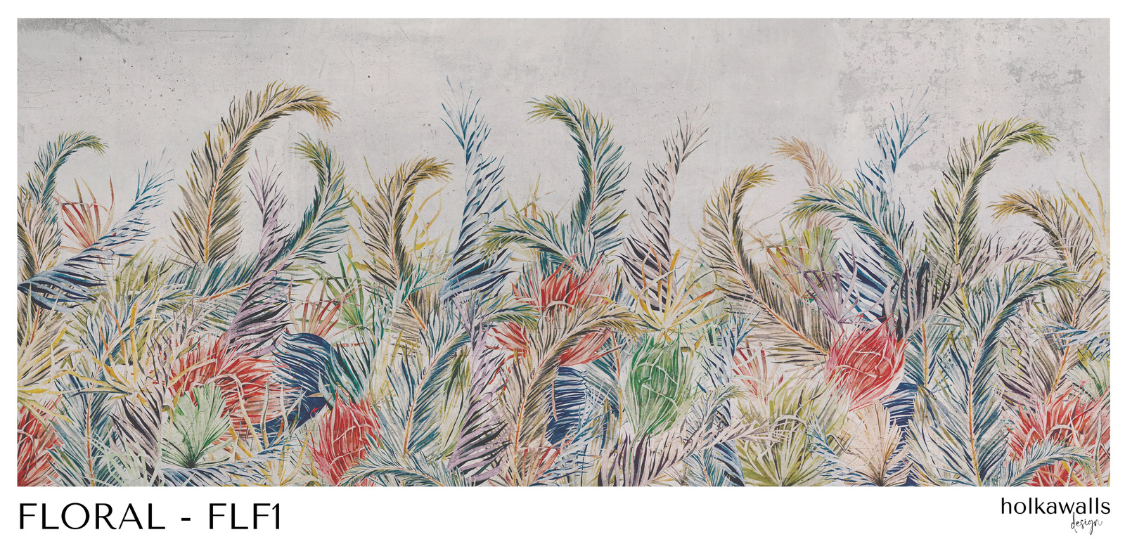 Tapeta winylowa o strukturze płótna z kolorowym motywem liści tropikalnychna szarym tle.