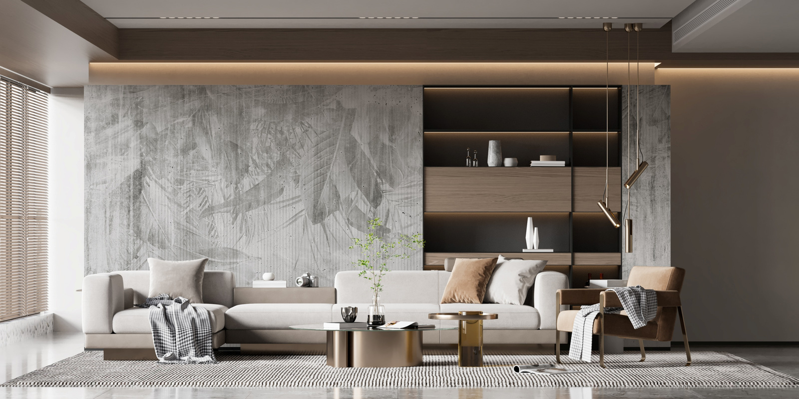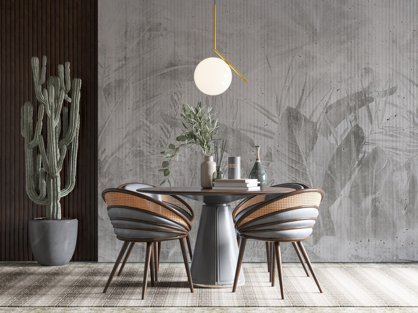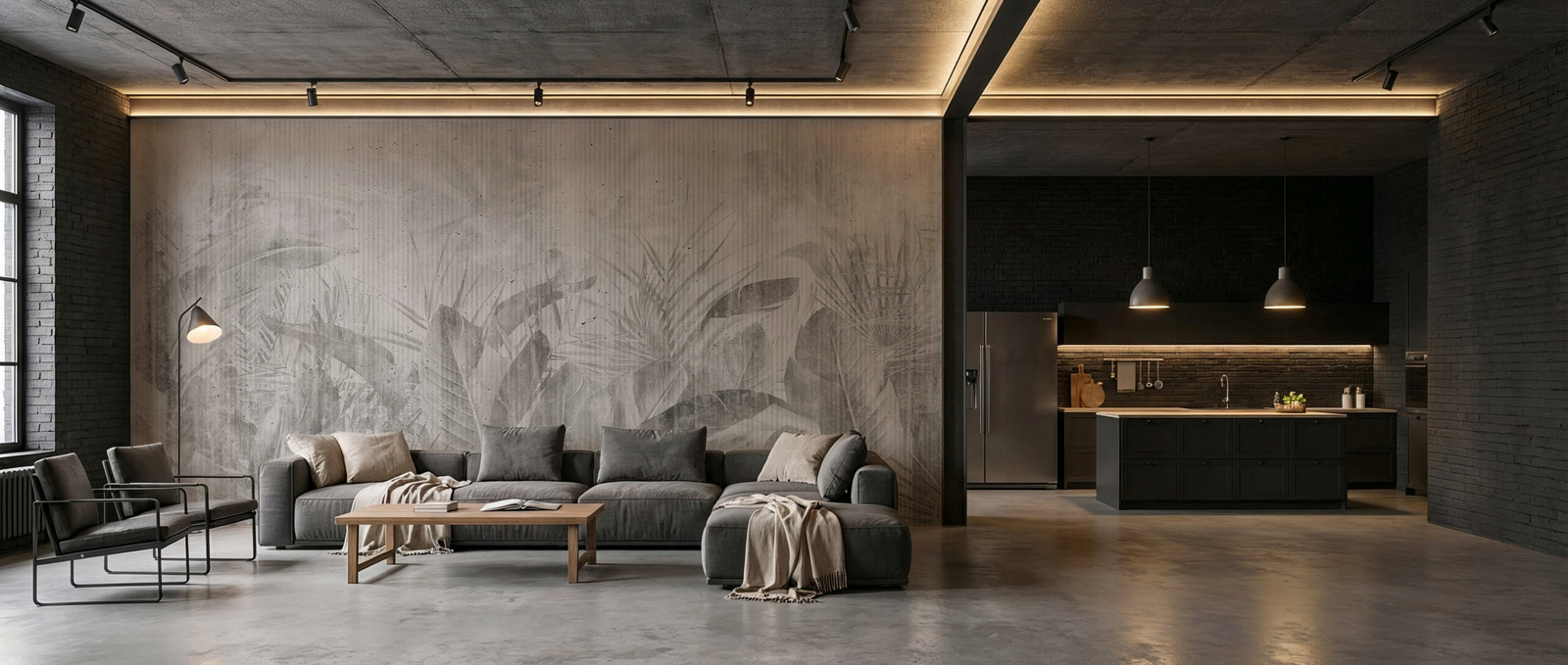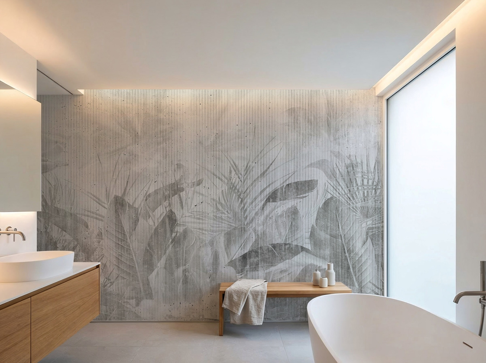 - Tapeta o strukturze płótna z motywem tropikalnych liści w odcieniach szarości.