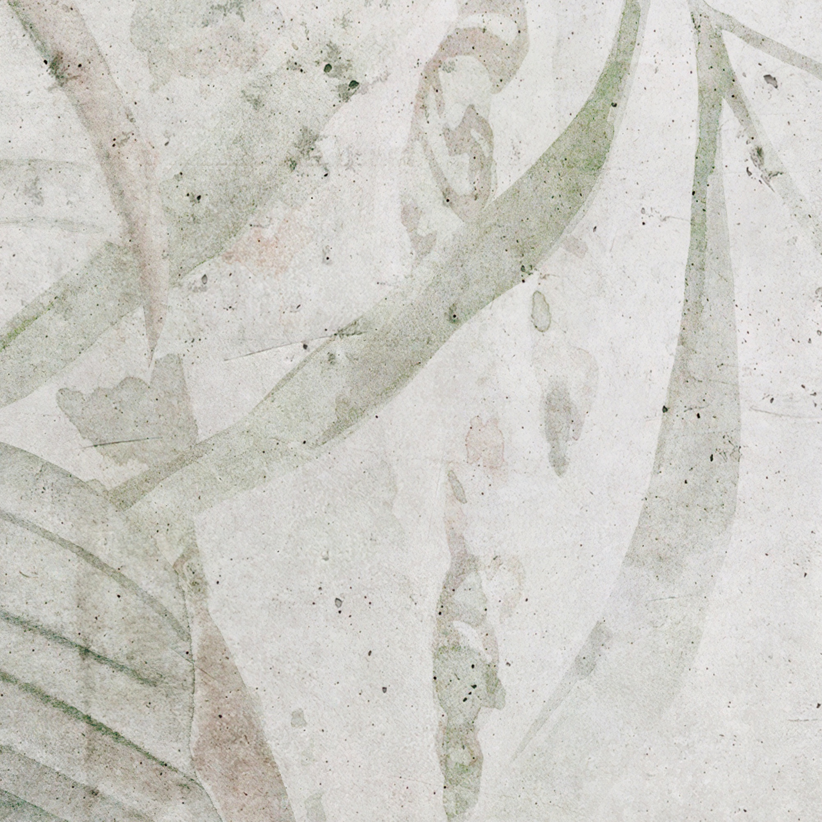 Tapeta winylowa o strukturze płótna z motywem tropikalnych liścii i przetarć w kolorach zieleni i beżu.