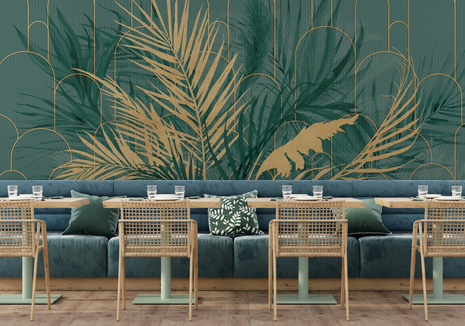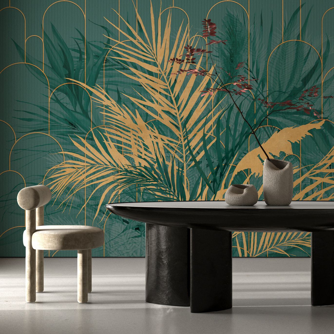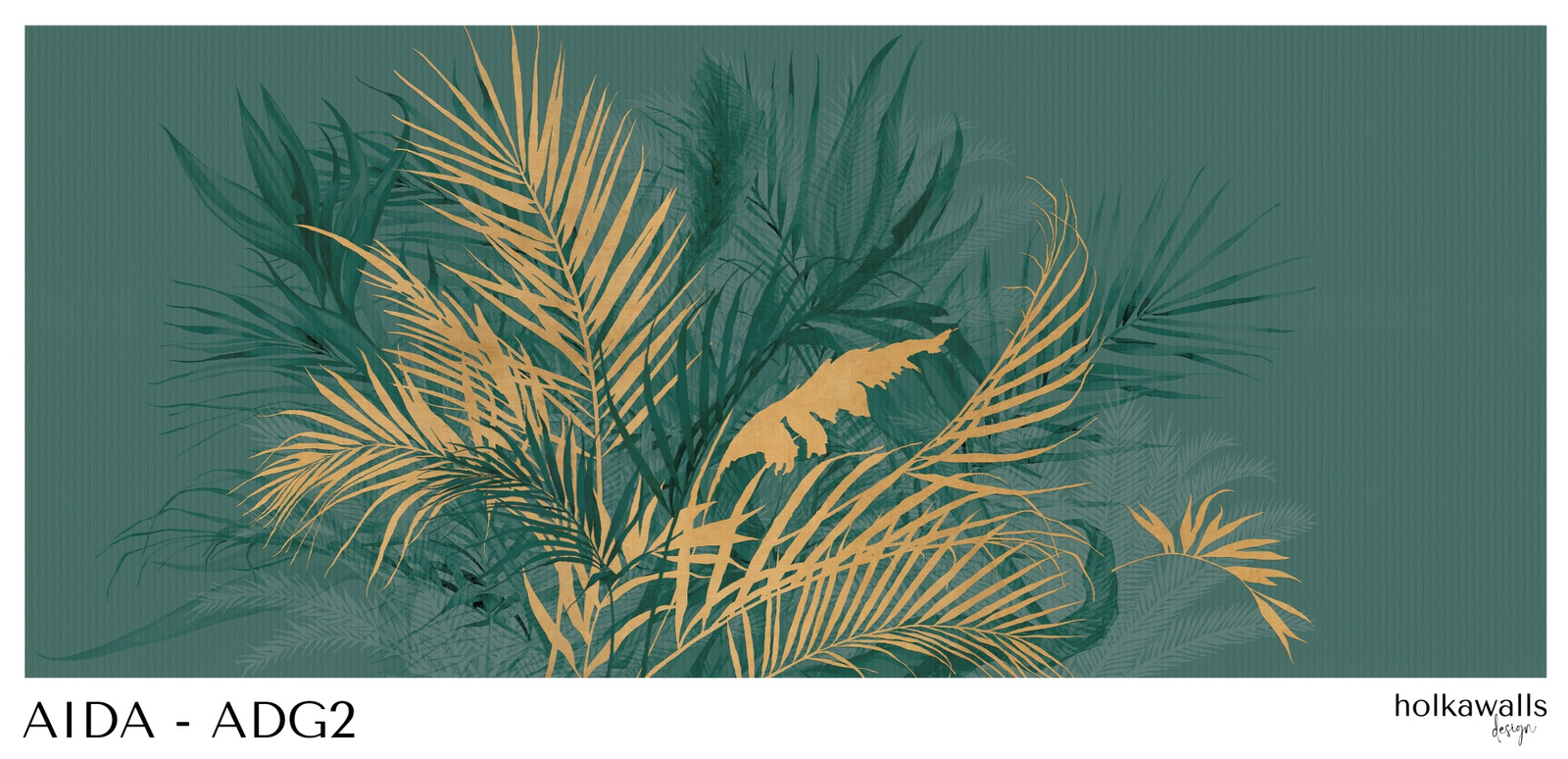 - Tapeta o strukturze płótna z motywem tropikalnych liści na zielonym tle.