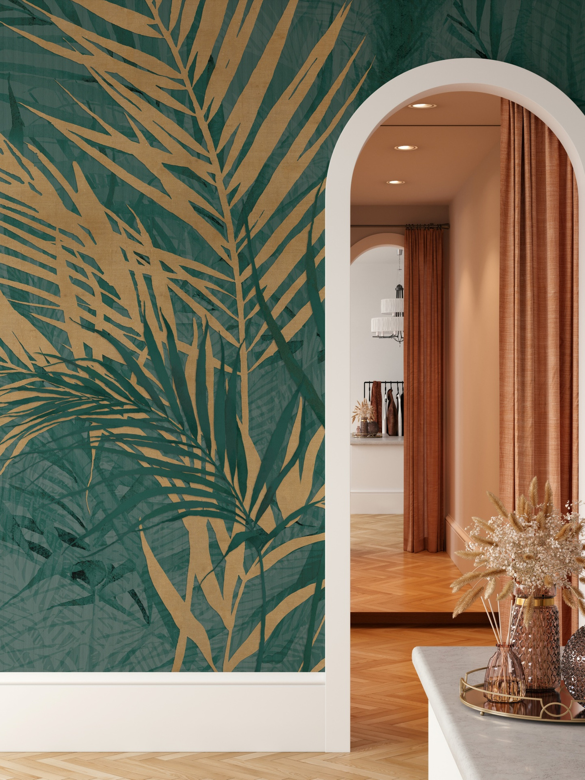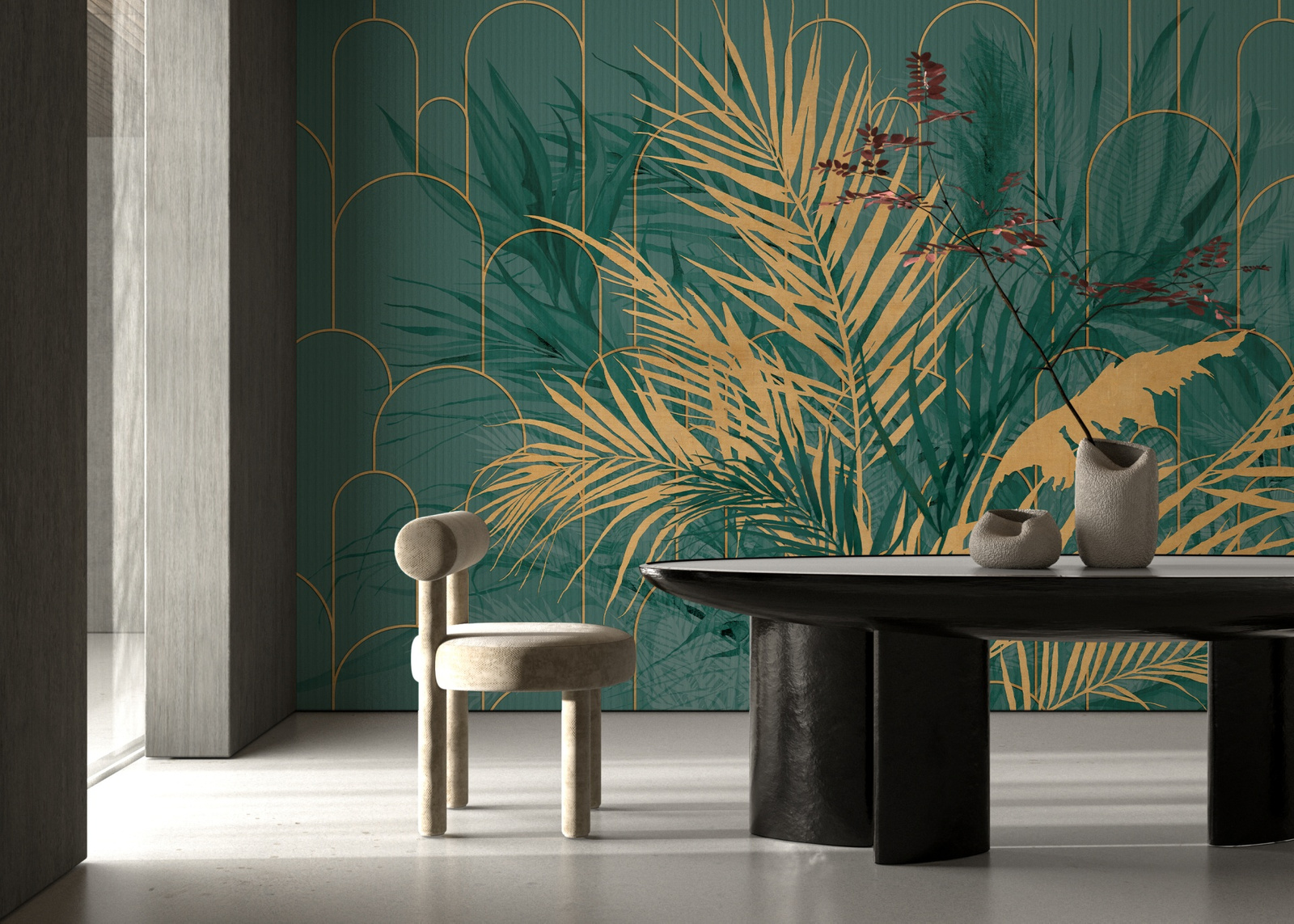 Tapeta winylowa o strukturze płótna z motywem tropikalnych liści na zielonym tle.