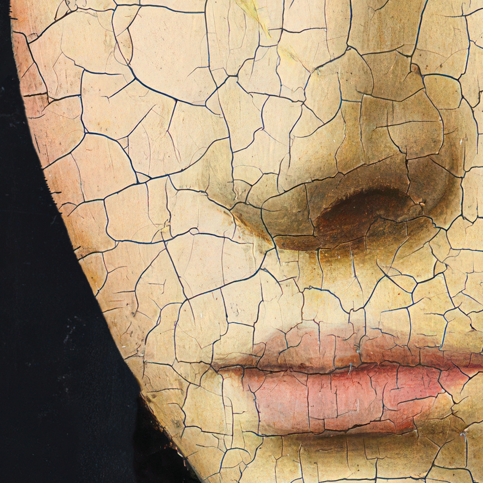 Tapeta winylowa o strukturze płótna w stylu vintage: dziewczyna z motylami, liście lotosu, obraz olejny.