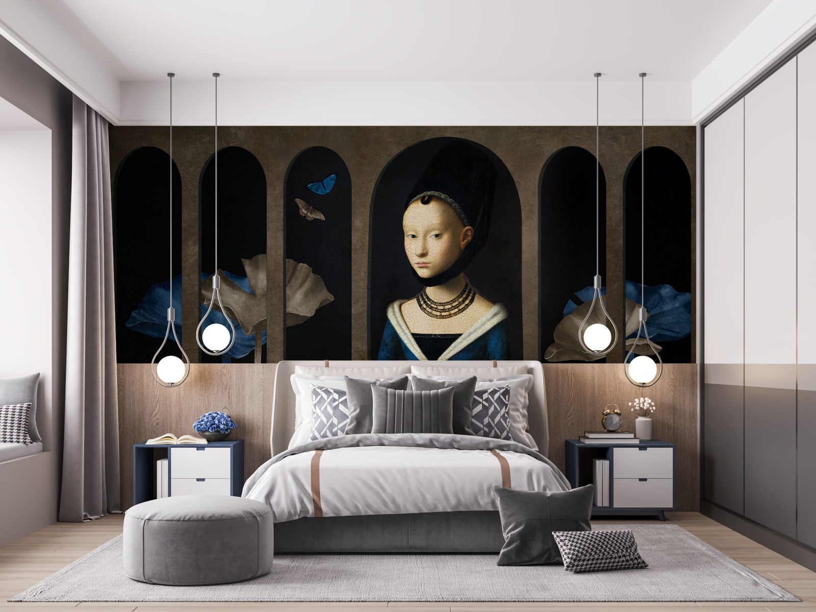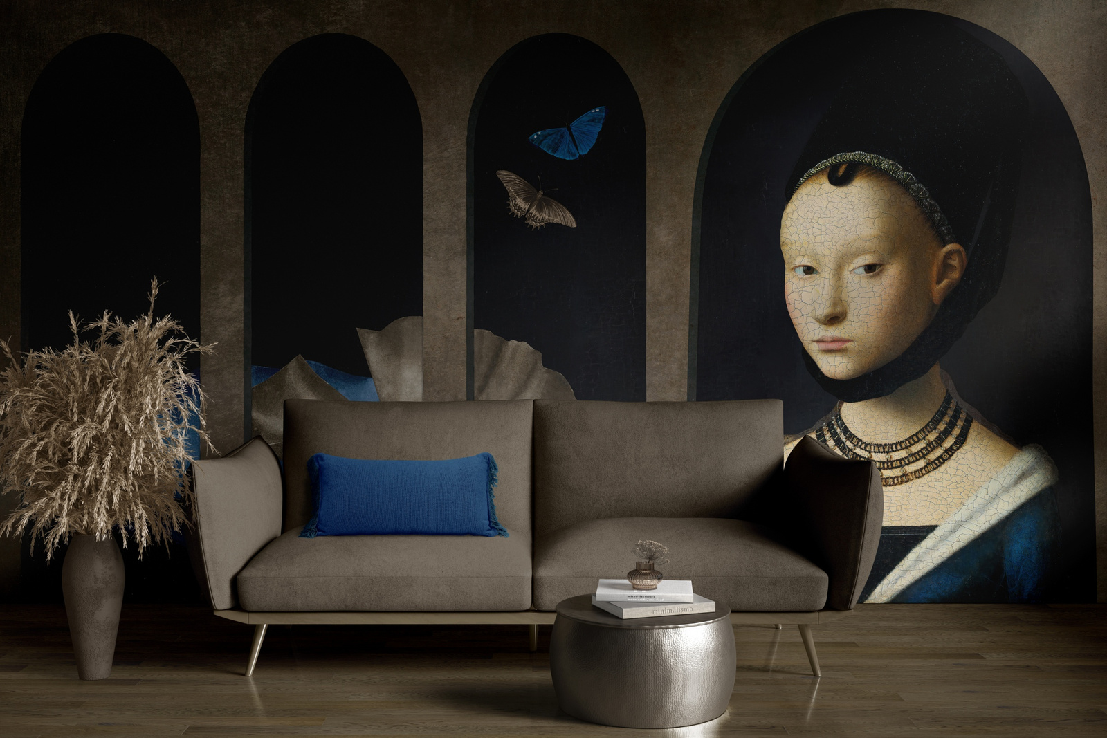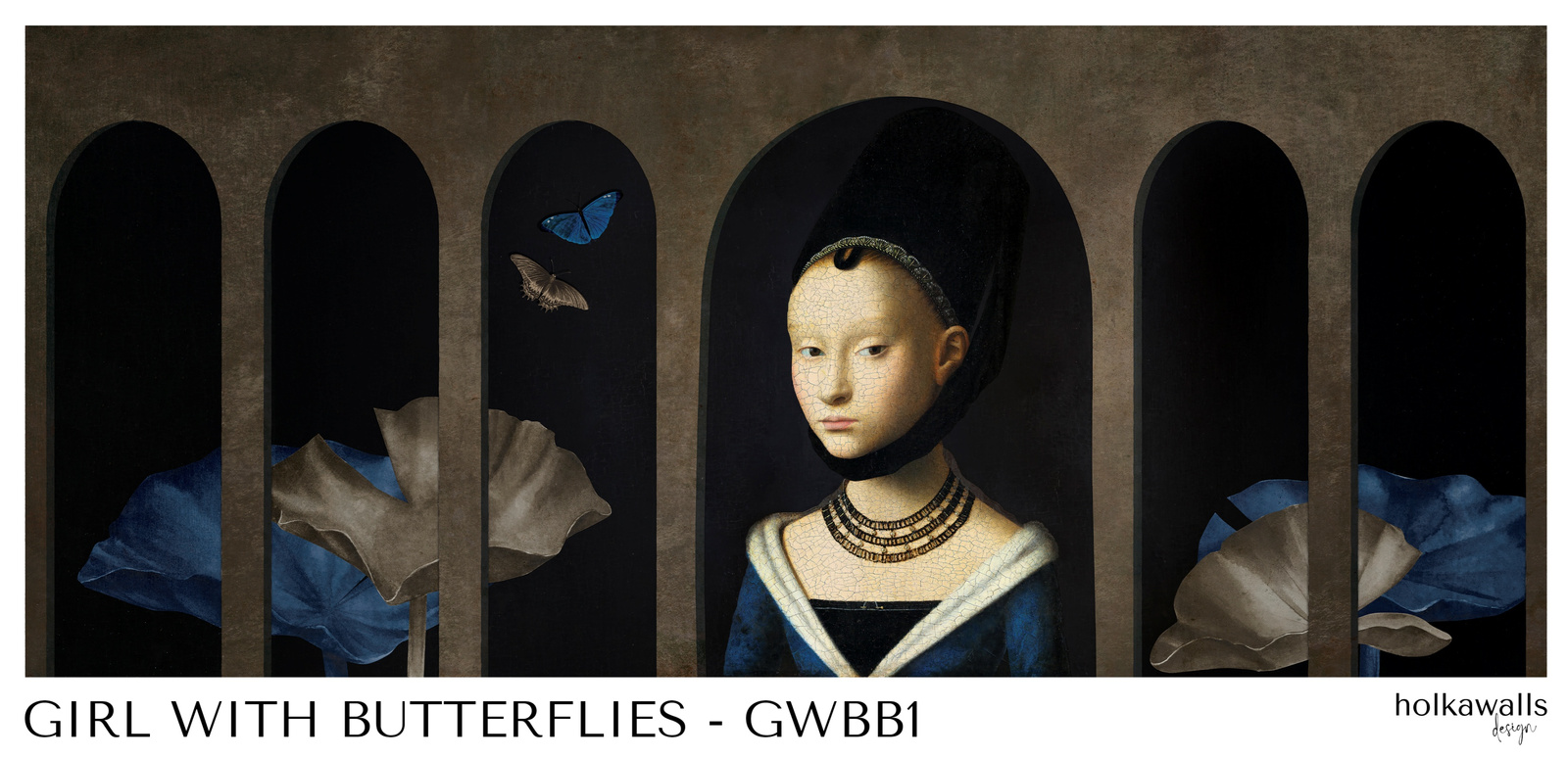 Tapeta winylowa struktura płótna malarstwo - GIRL WITH BUTTERFLIES (blue)