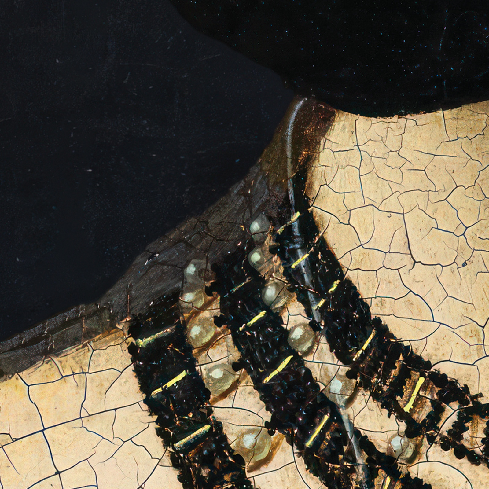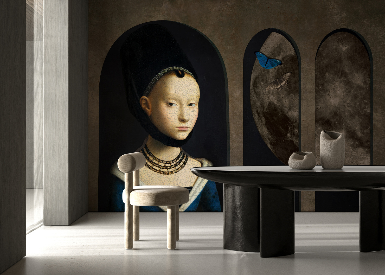 Tapeta winylowa o strukturze płótna w stylu vintage: dziewczyna z motylami, księżyc, obraz olejny.