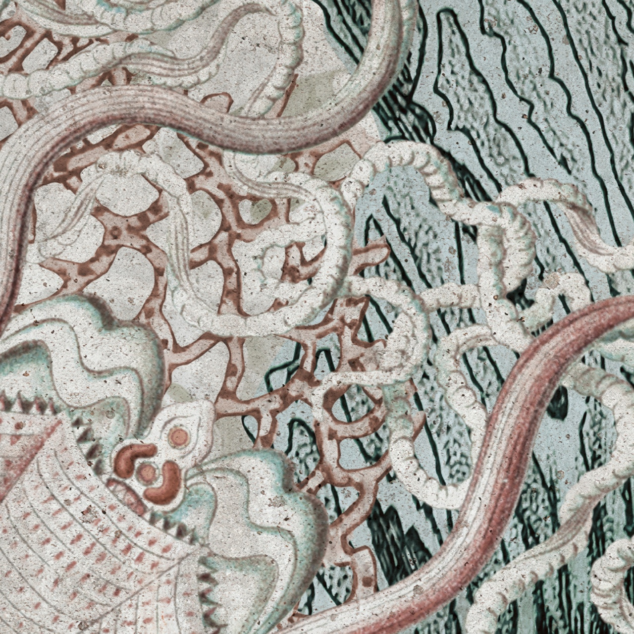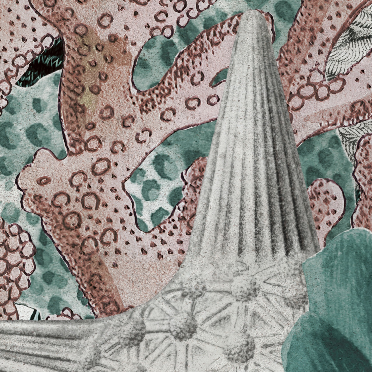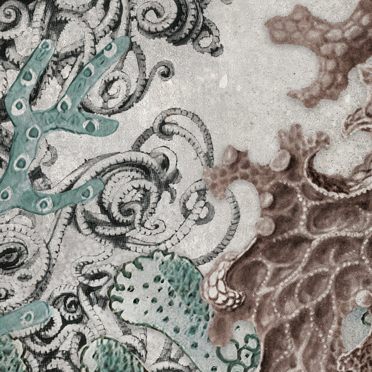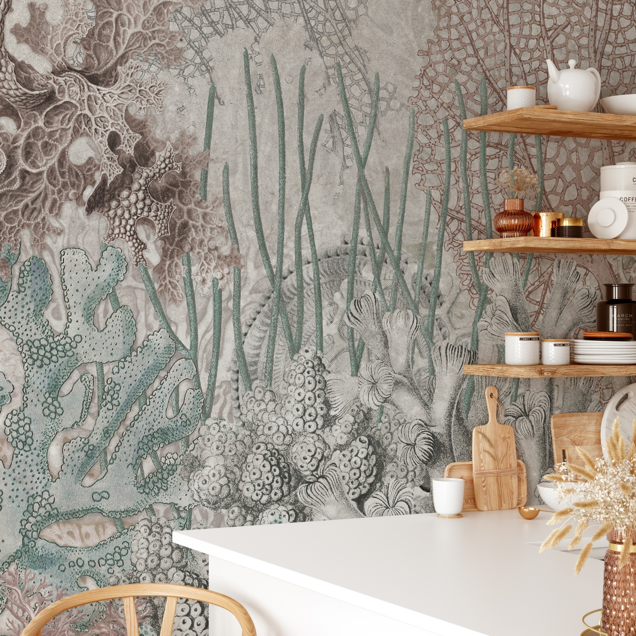 Tapeta winylowa o strukturze płótna z motywem podwodnego świata, morskiej flory i rafy koralowej w stylu vintage.