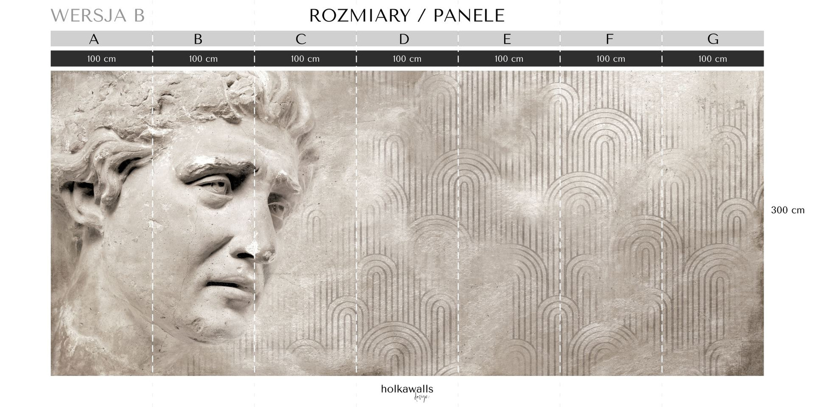 Tapeta winylowa o strukturze płótna przedstawiająca rzeźbę antyczna z efektem betonu i wzorem dekoracyjnym w tle w odcieniach beżu.