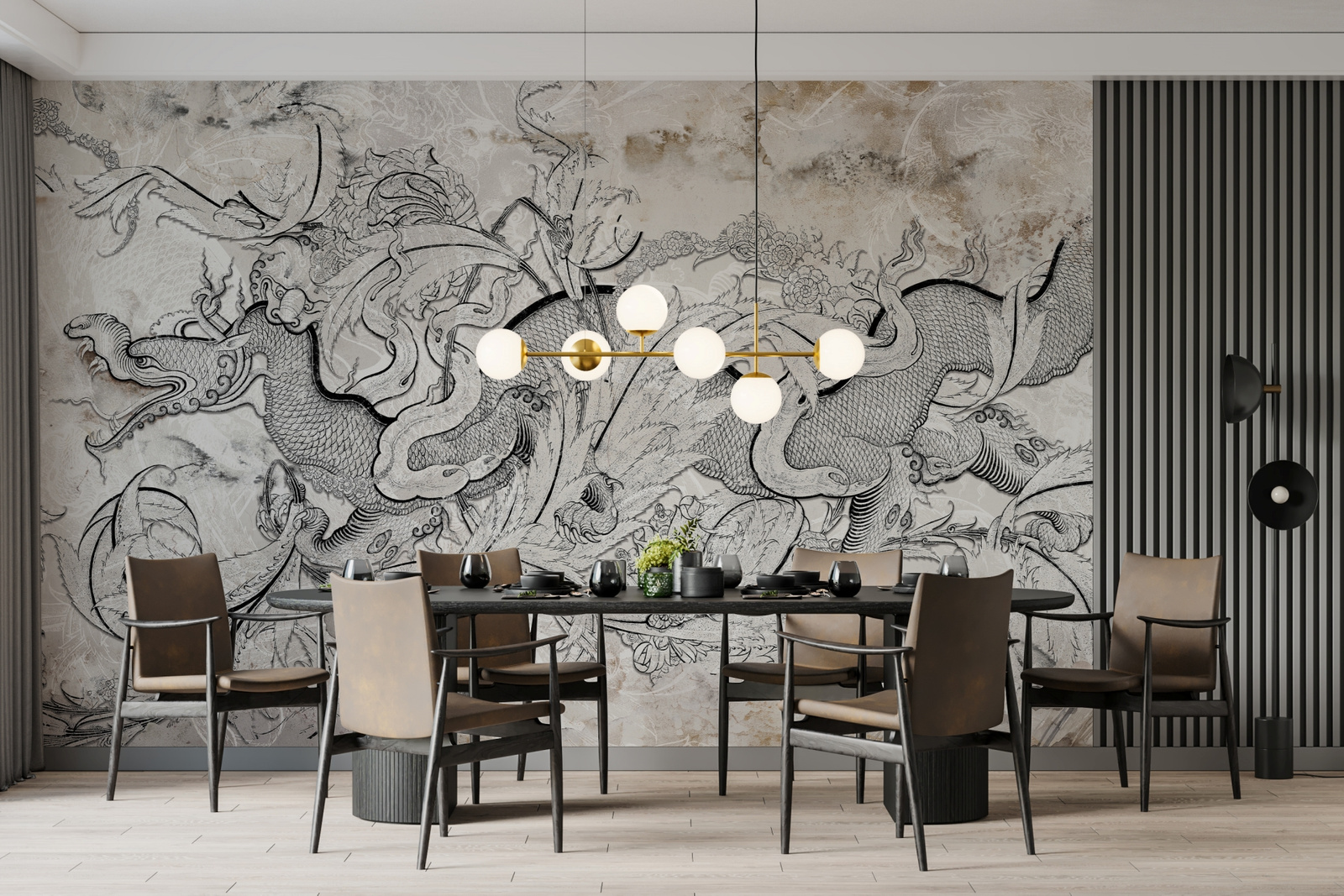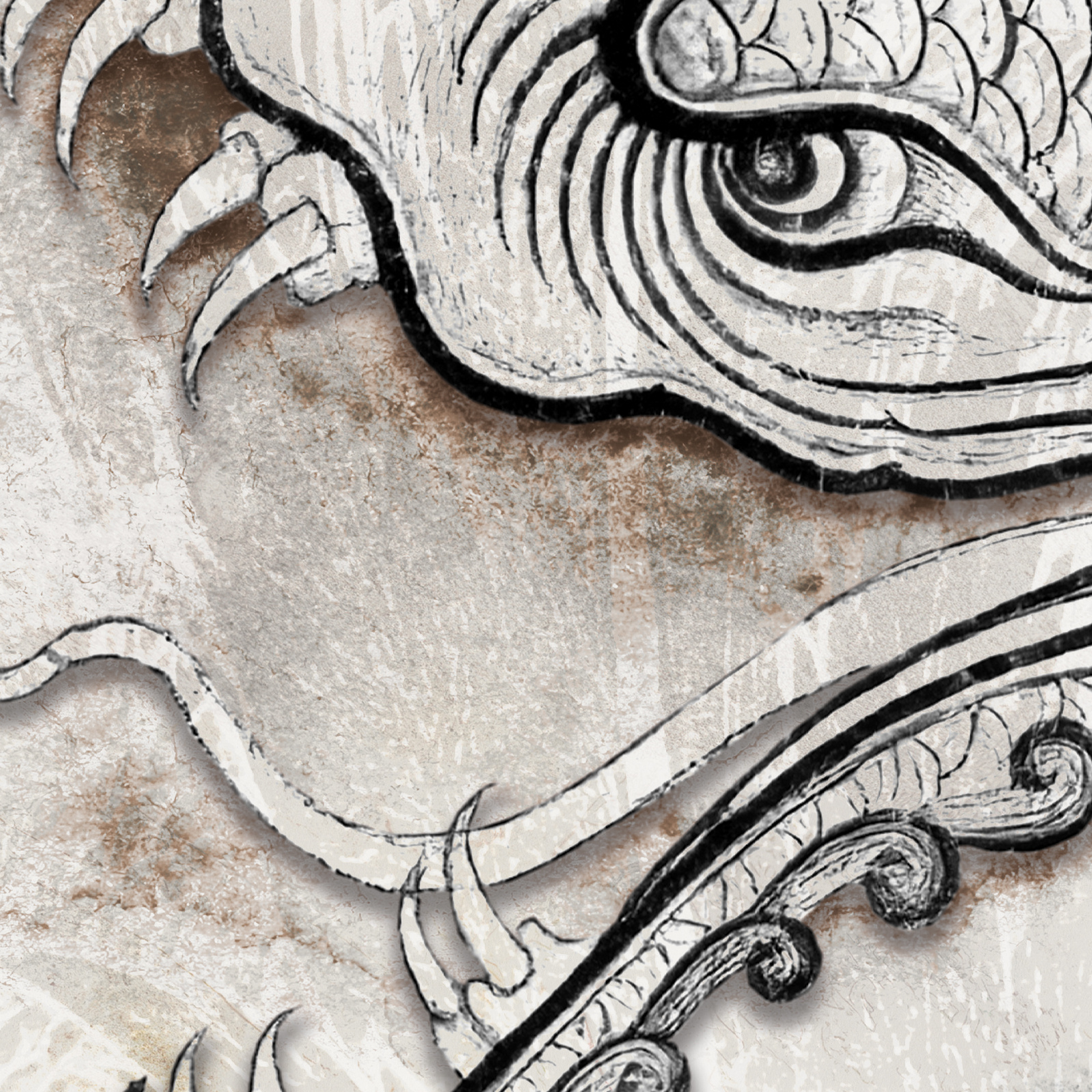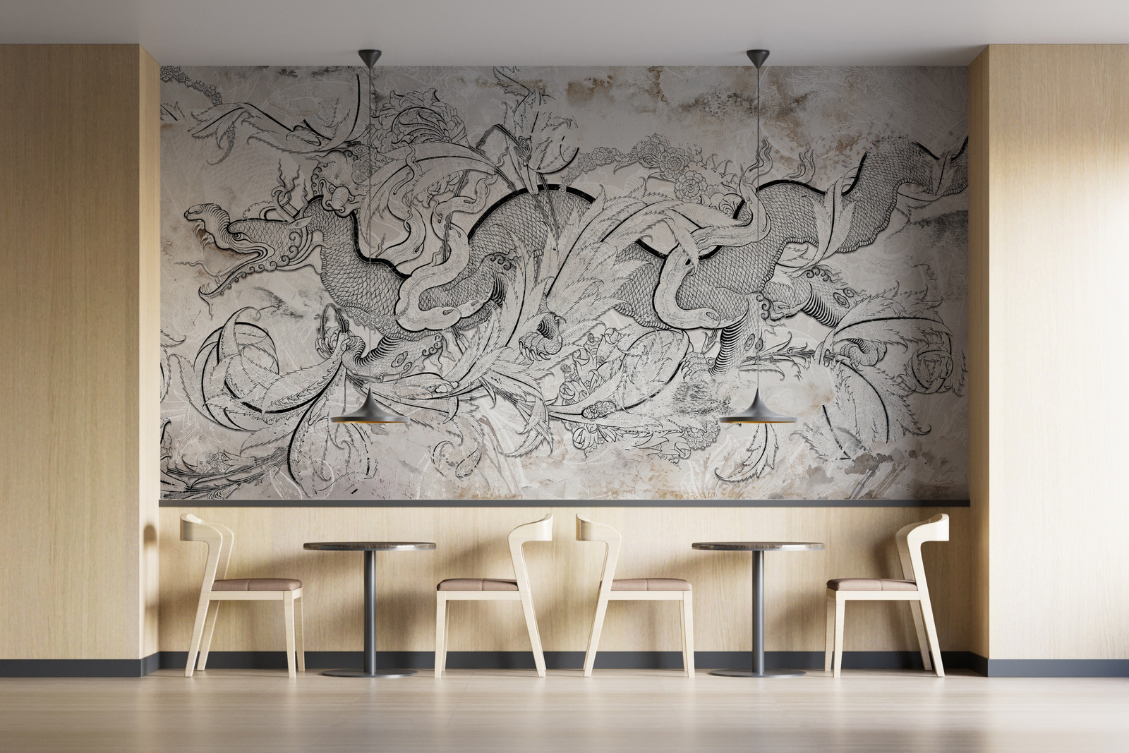 Tapeta winylowa o strukturze płótna ze smokiem w odcieniach beżu i szarości.
