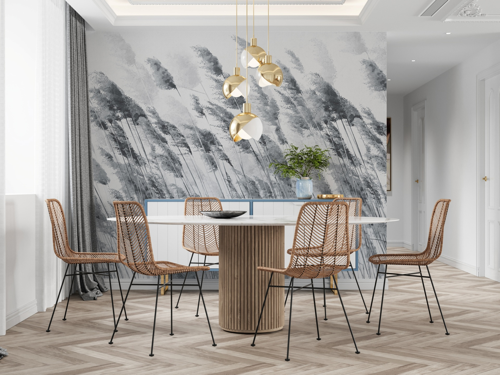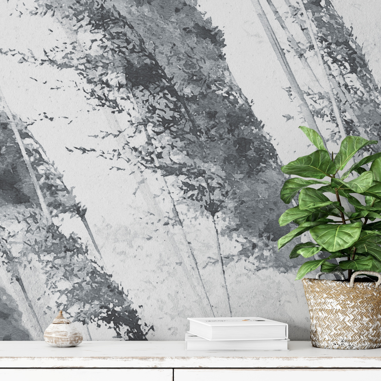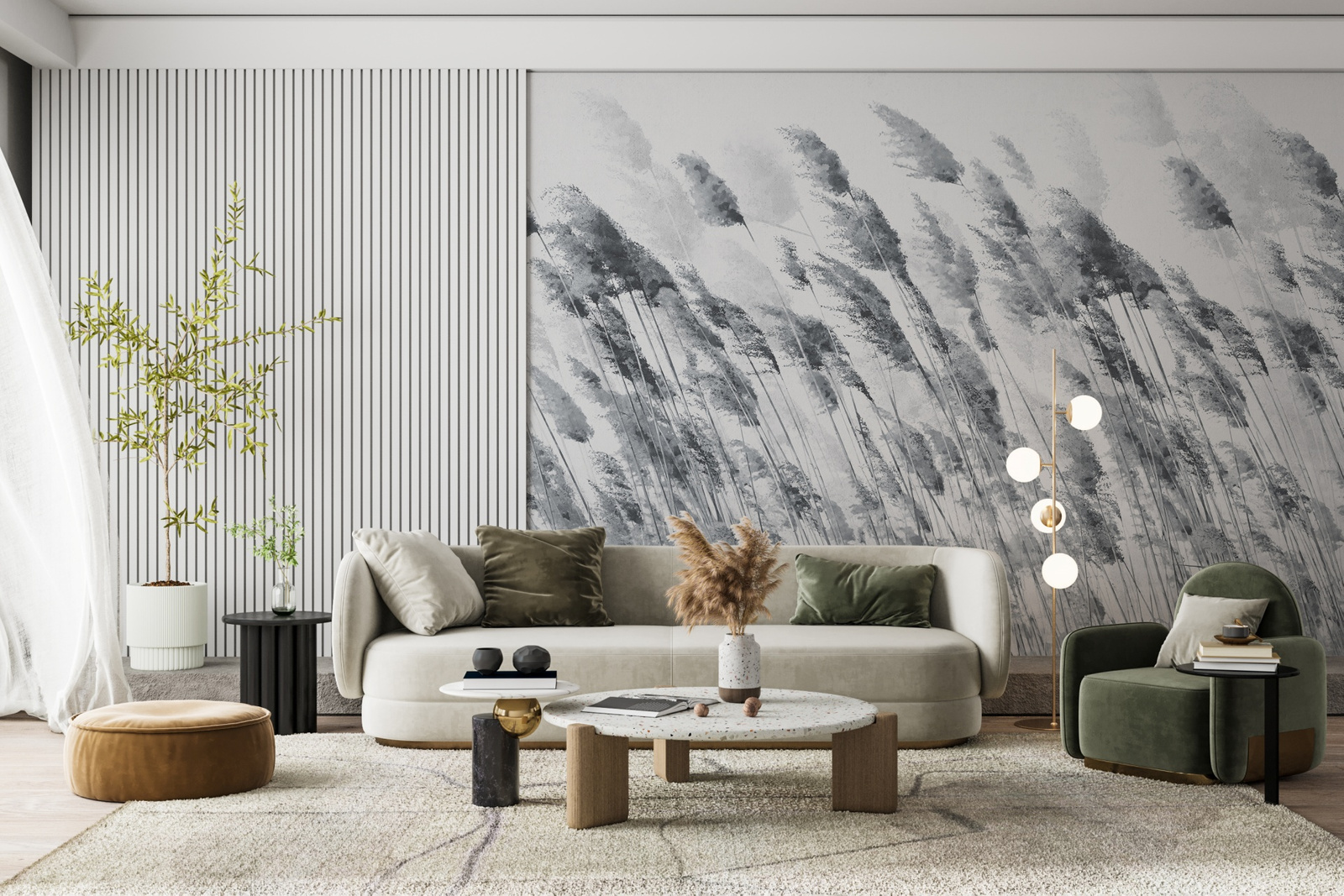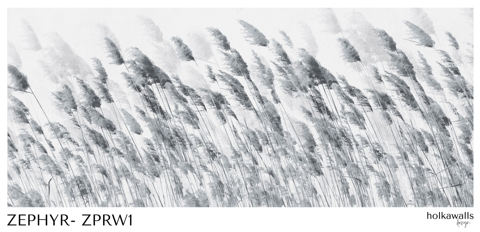 • Tapeta winylowa o strukturze płótna z motywem traw w odcieniach szarości.