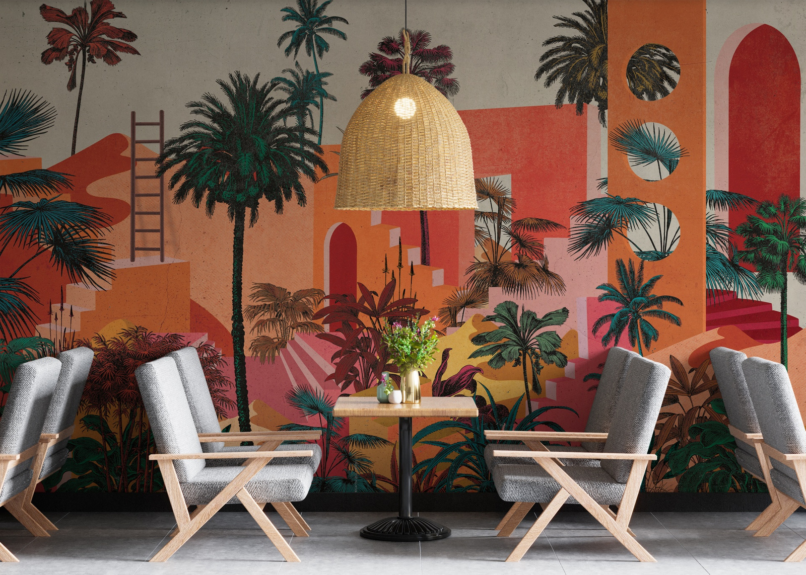 Tapeta winylowa o strukturze płótna z kolorowym motywem orientalnego miasta w odcieniach czerwieni, różu i pomarańczowego.