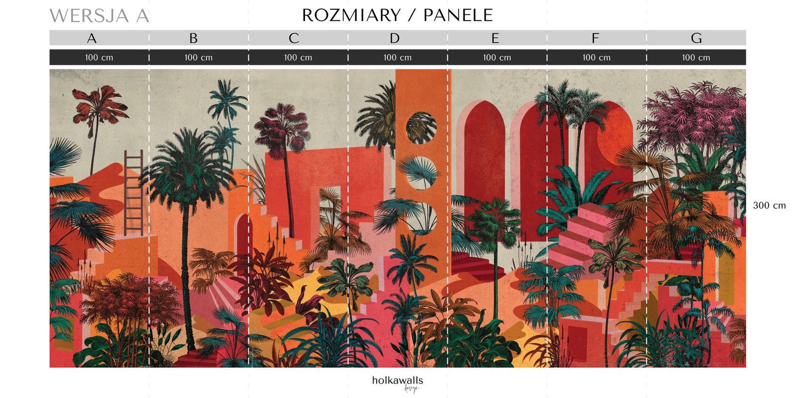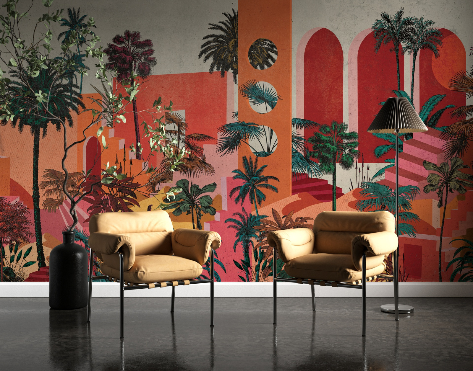 Tapeta winylowa struktura płótna tropikalna architektura kolorowa - OASIS red