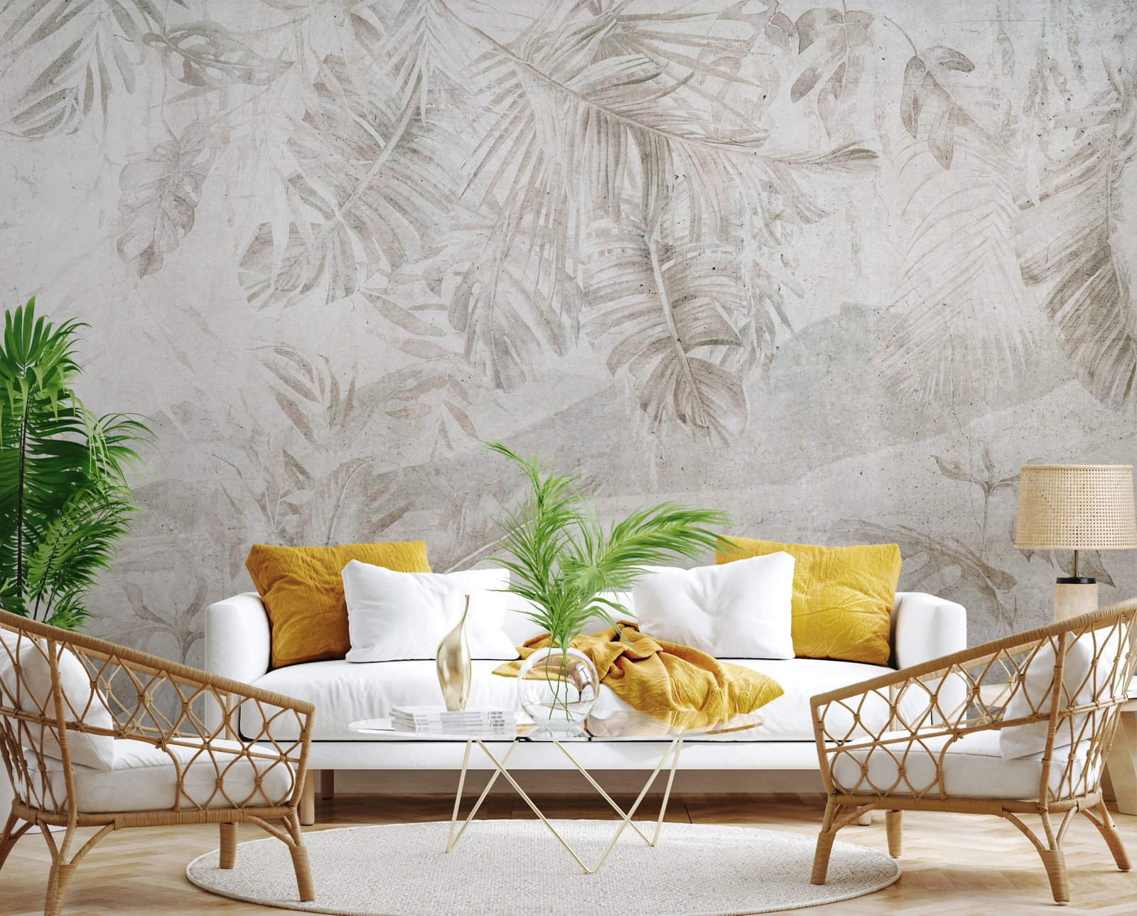 Tapeta winylowa o strukturze płótna z motywem tropikalnych liścii i gór w tle w odcieniach beżu.