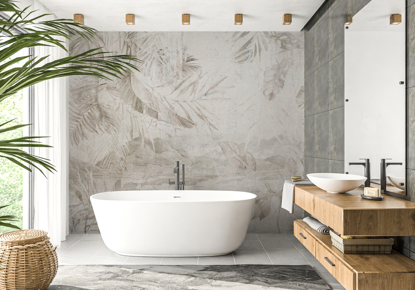 Tapeta wydrukowana na materiale winylowym o strukturze płótna z podkładem flizelinowym. Na życzenie możliwość druku na podkładzie gładkim lub z efektem betonu.
