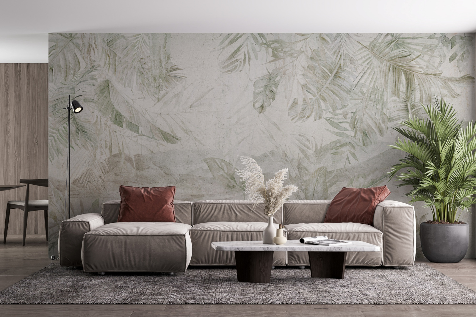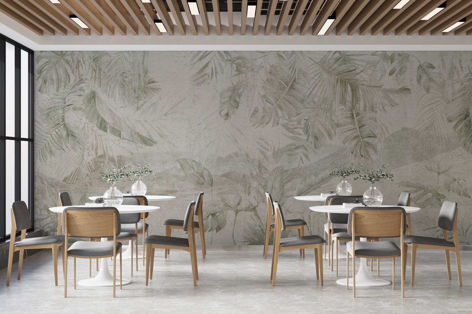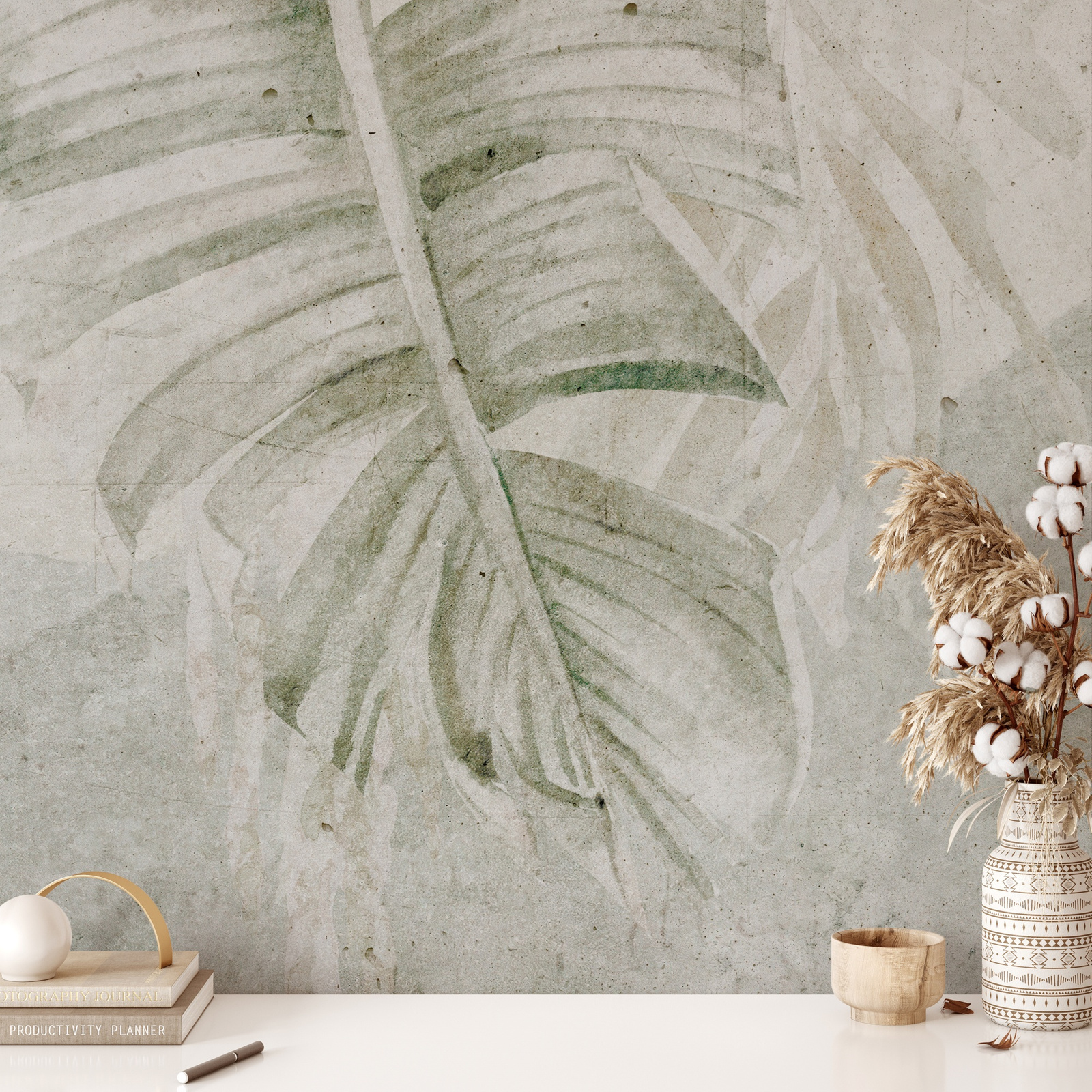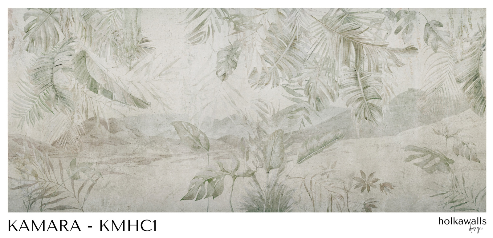 Tapeta winylowa o strukturze płótna z motywem tropikalnych liścii i gór w tle w kolorach zieleni i beżu.
