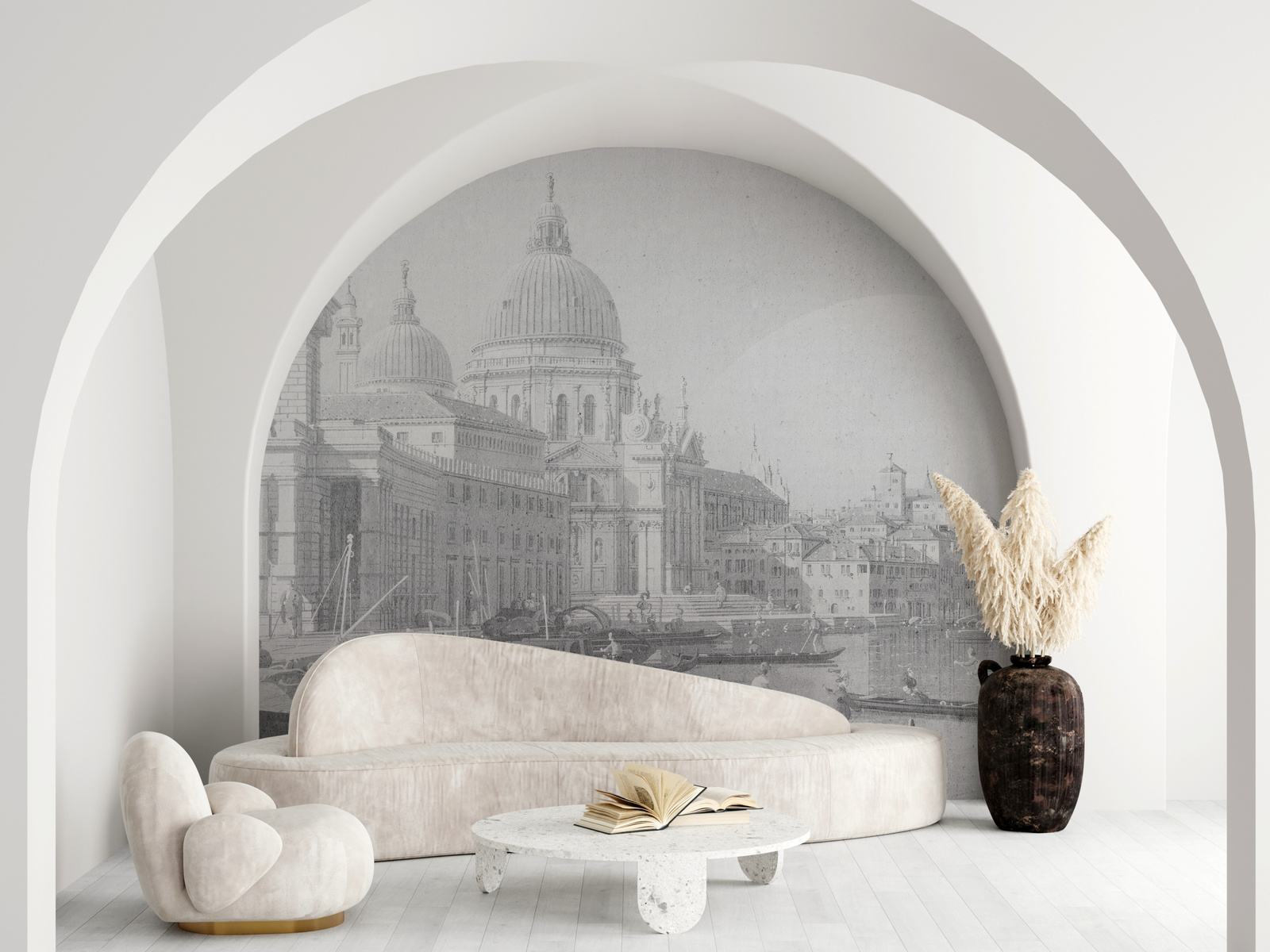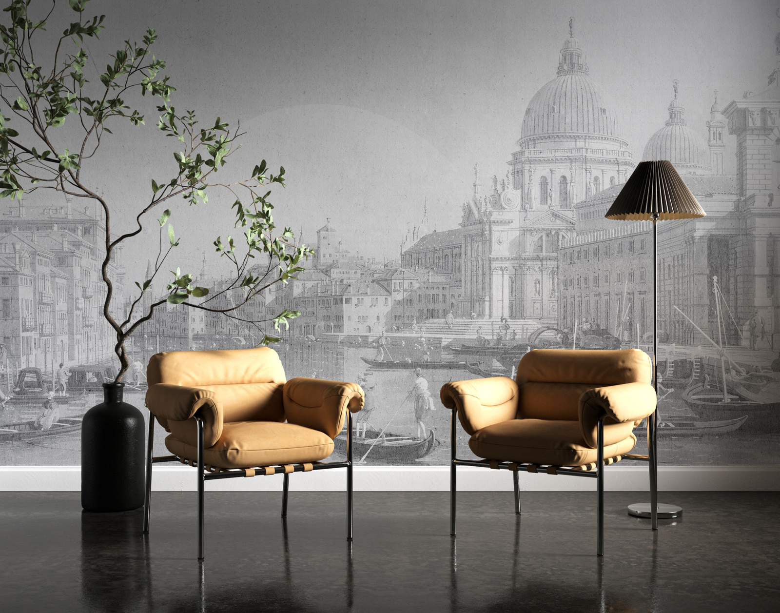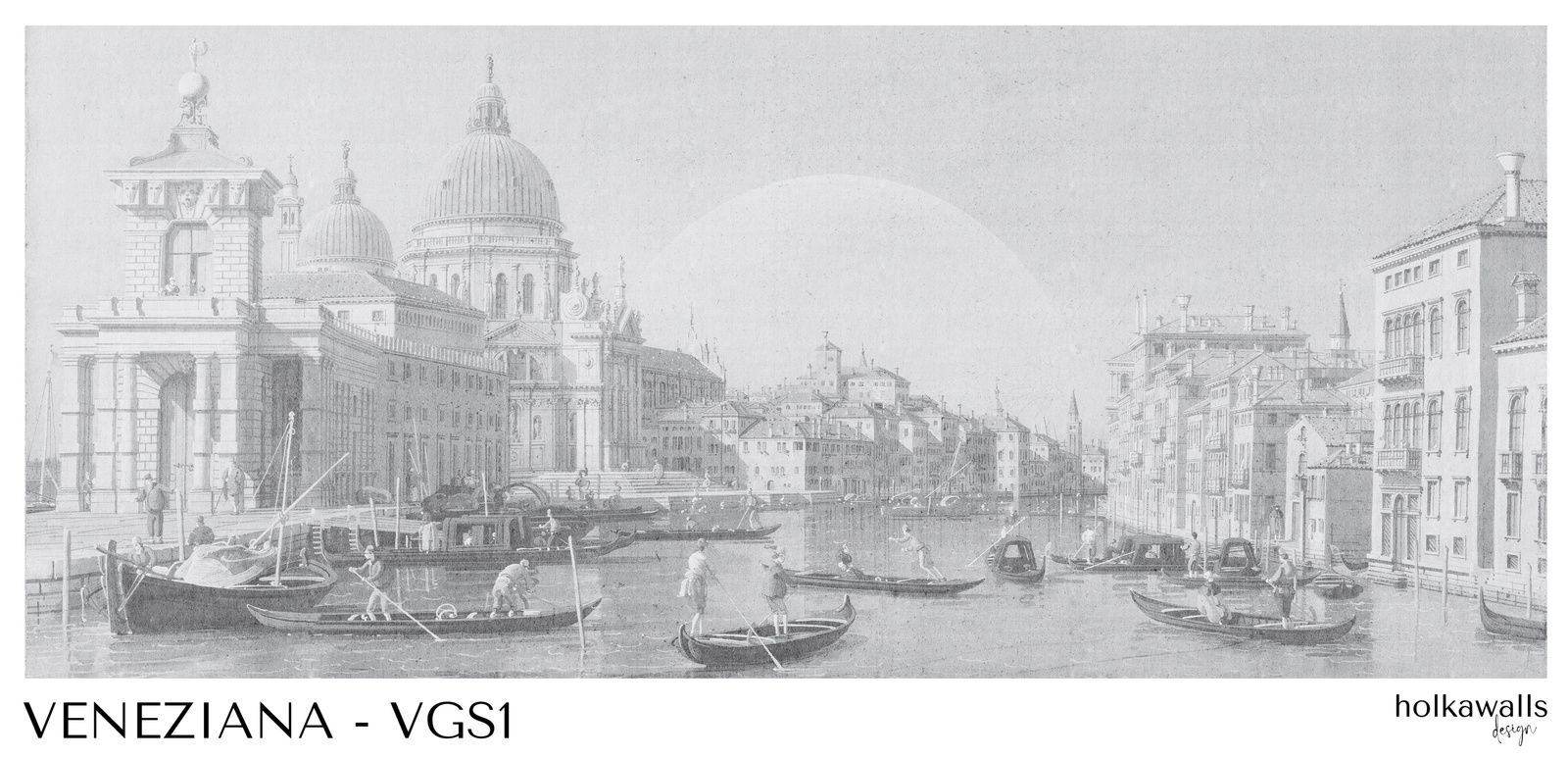 - Tapeta o strukturze płótna w odcieniach szarości w widokiem na Wenecję.